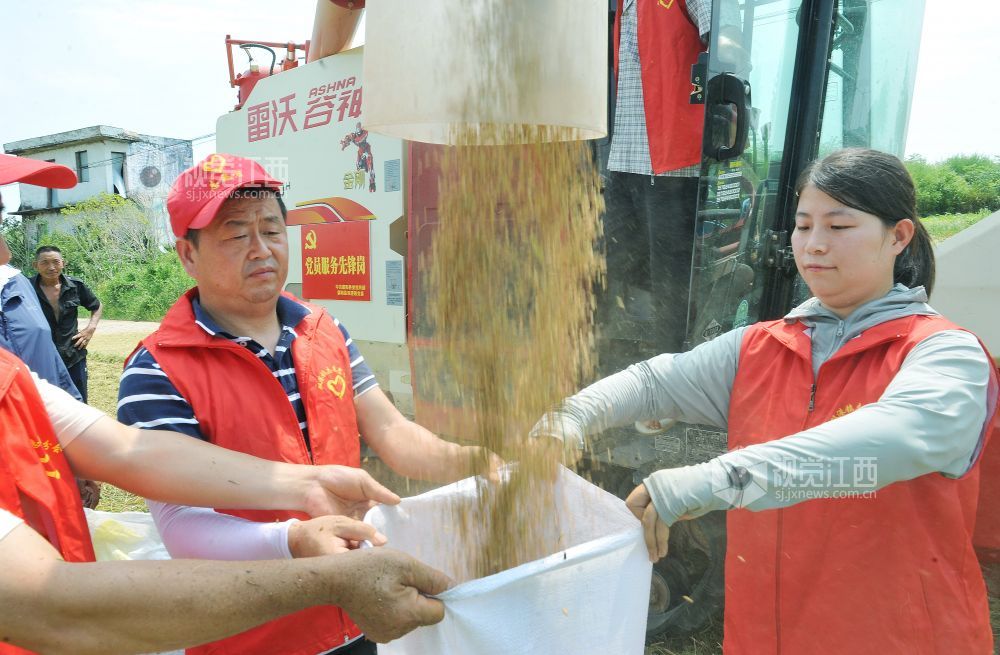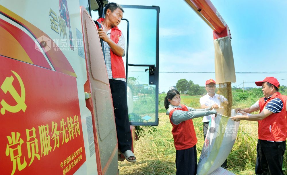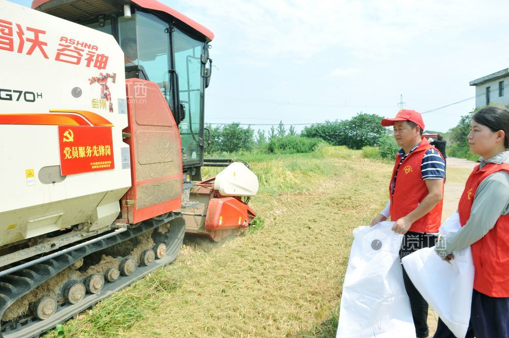 2022年7月24日,江西省鄱阳县双港镇“党员服务先锋岗”在该镇双丰村,为当地缺乏劳力的留守妇女、老人和困难家庭收割早稻。