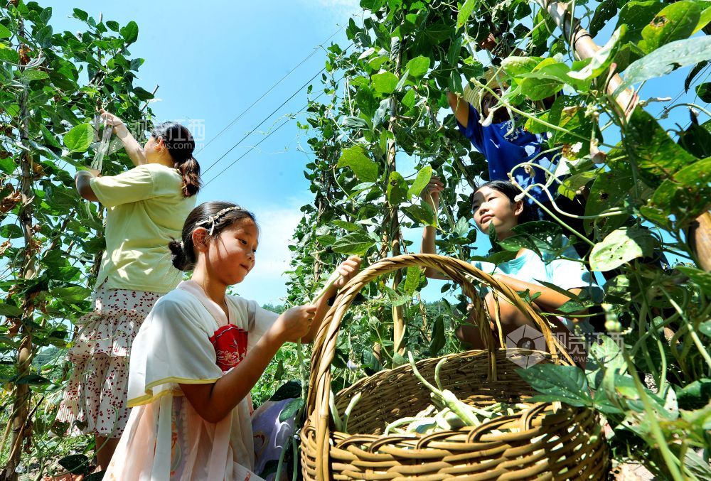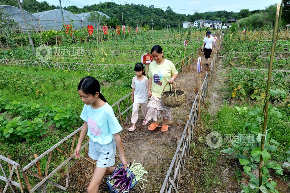 2022年7月23日,几名来自城里的孩子在家长的陪同下,来到江西省上饶市广丰区东阳乡龙须村订制的田园农场,开心采摘自己种的新鲜蔬菜。