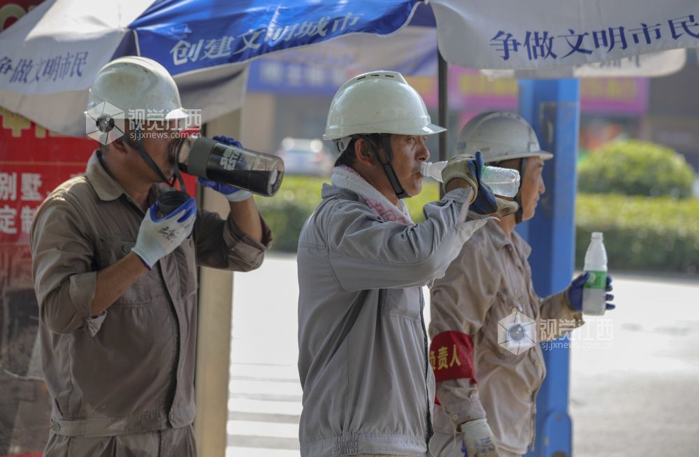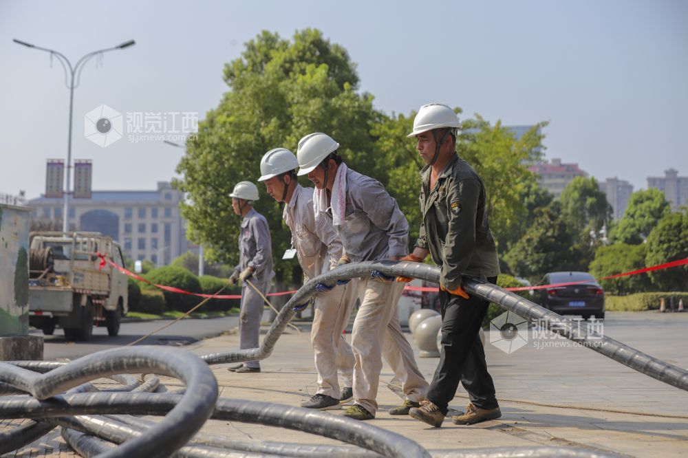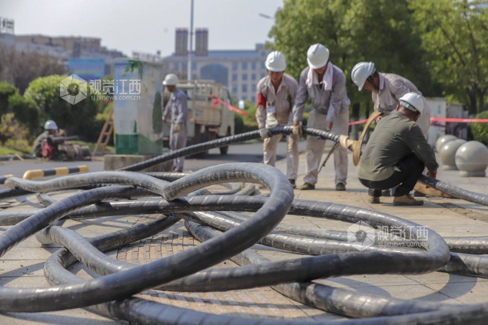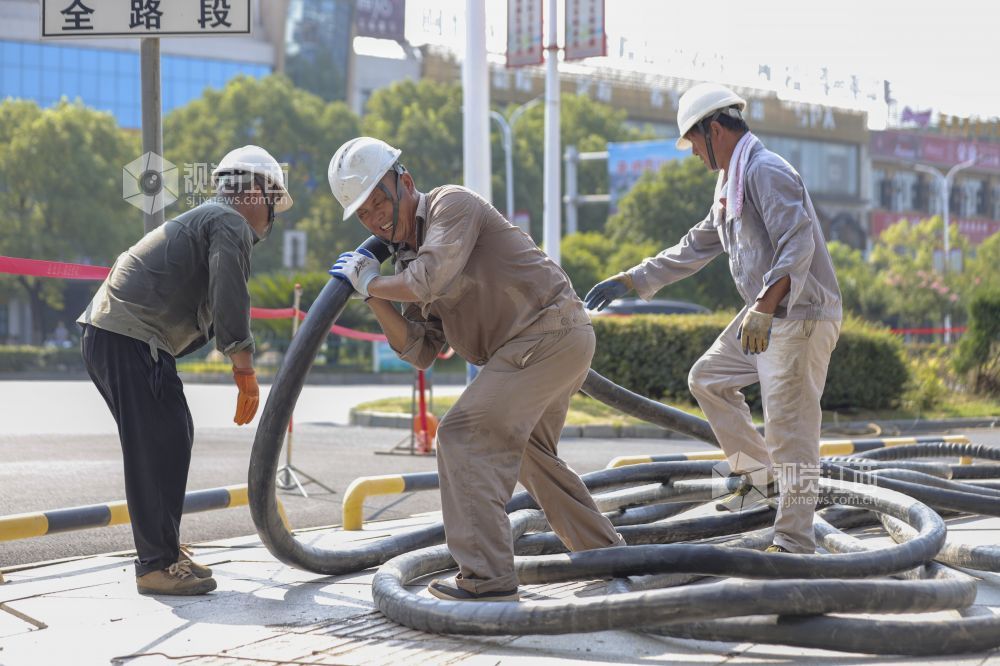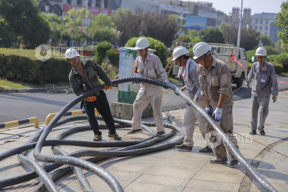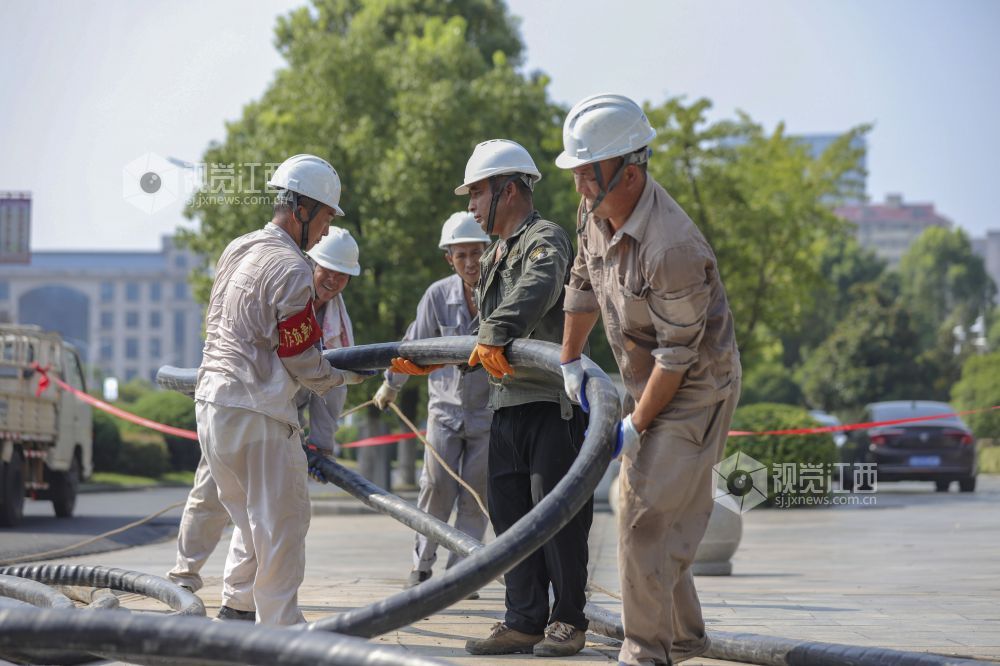 7月27日,在江西省湖口县县城盛源路,国网湖口供电公司的配网施工人员正在敷设10KV电缆。当日8时44分,当地气象台继续发布高温橙色预警信号。