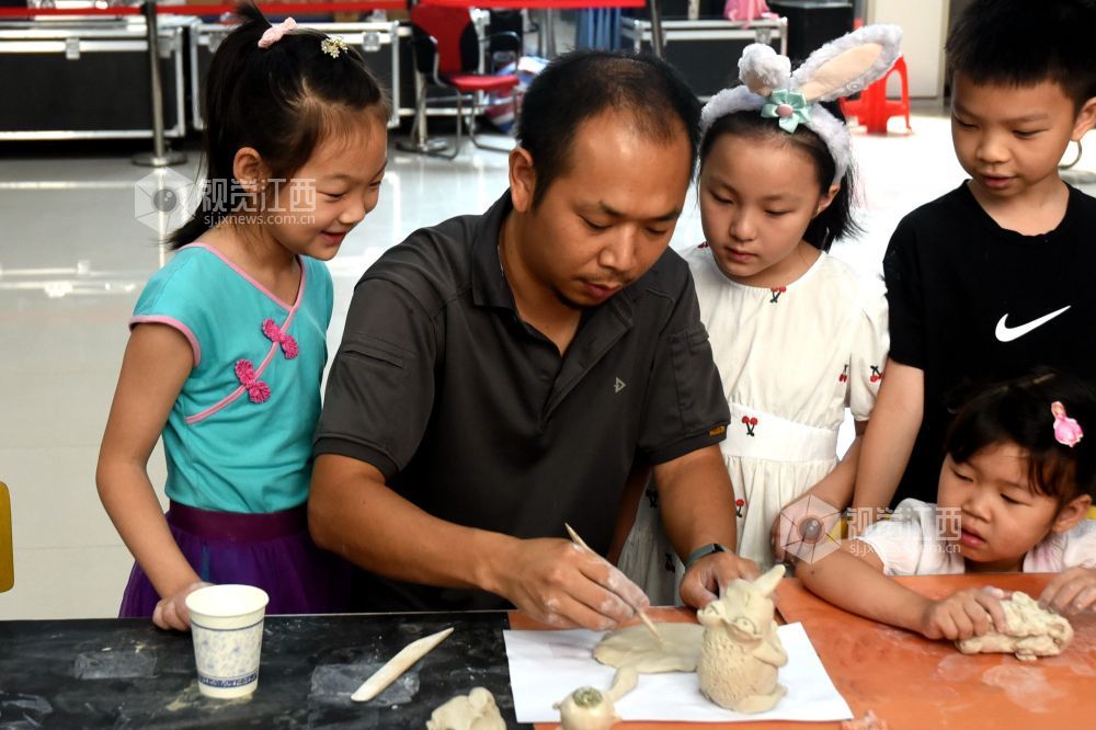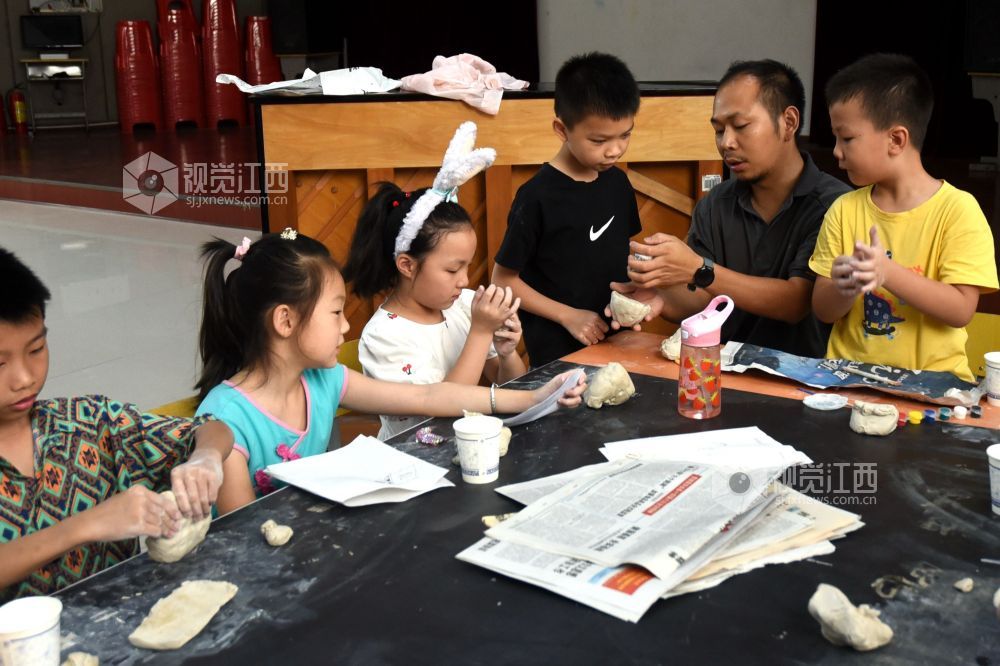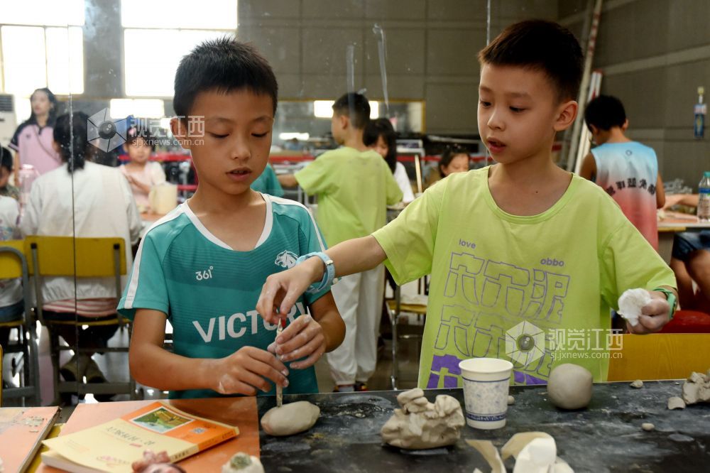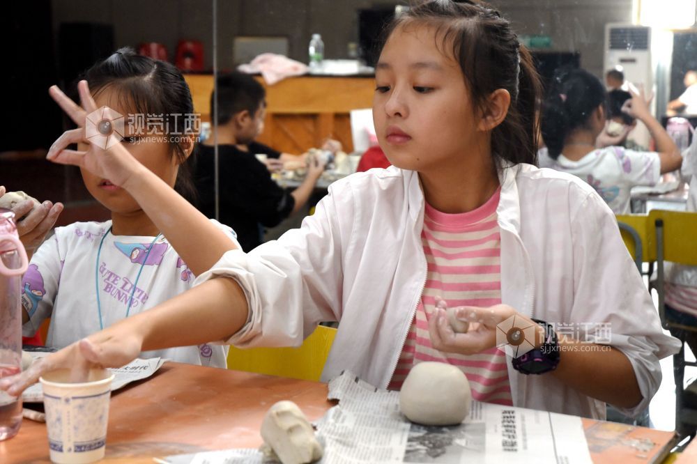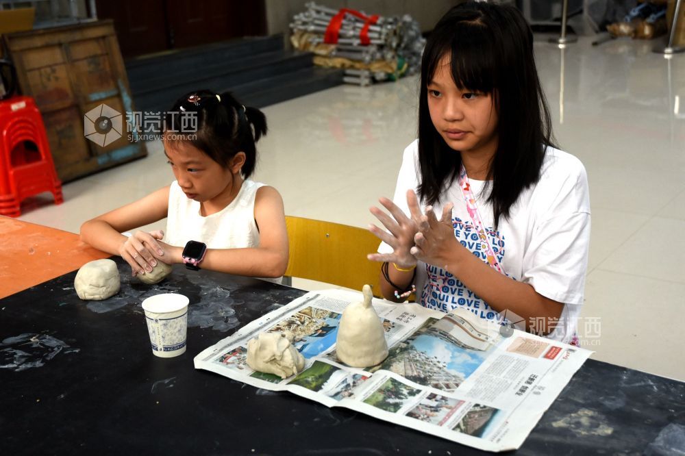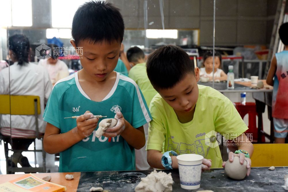 2022年7月29日,江西省抚州市南丰县文化馆内,16名中小学生在白舍窑非遗传承人谢振华的指导下,学习白舍窑手工制作艺术,旨在培养学生兴趣爱好,丰富他们的暑期生活。