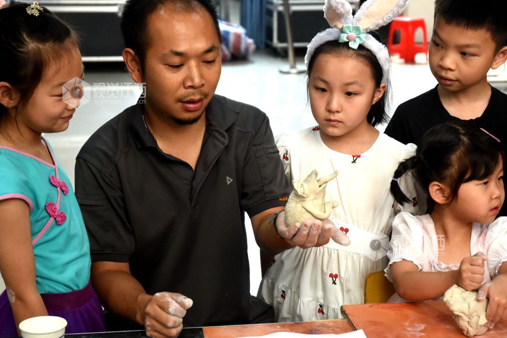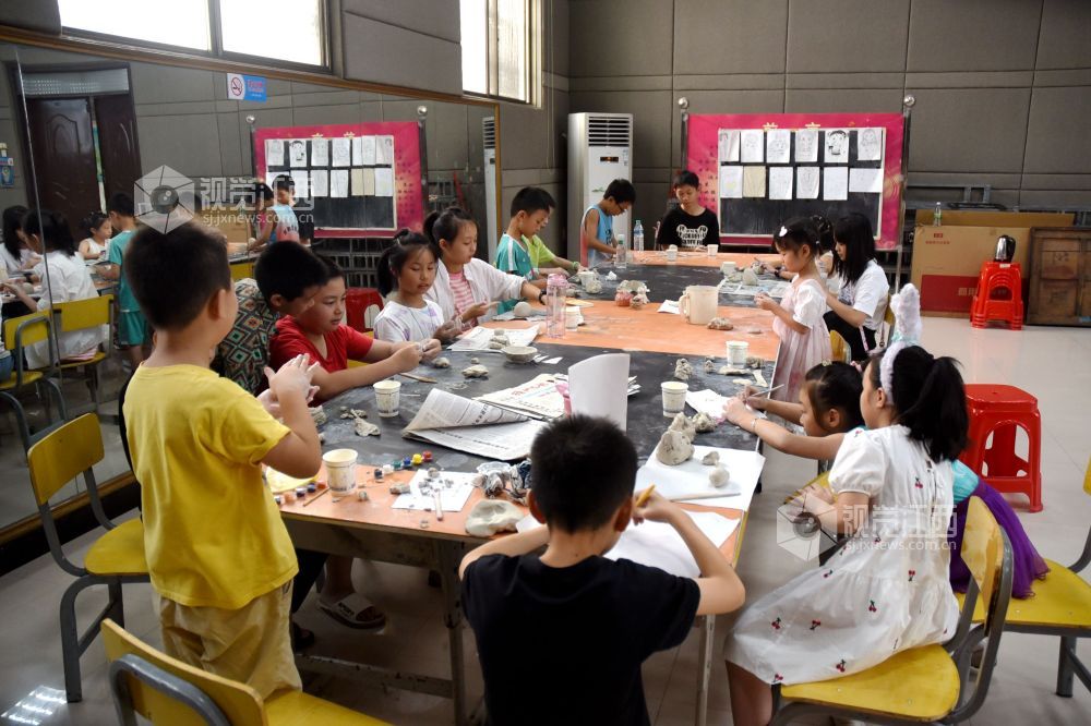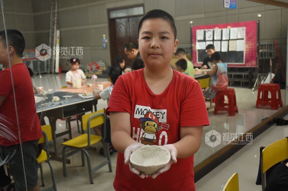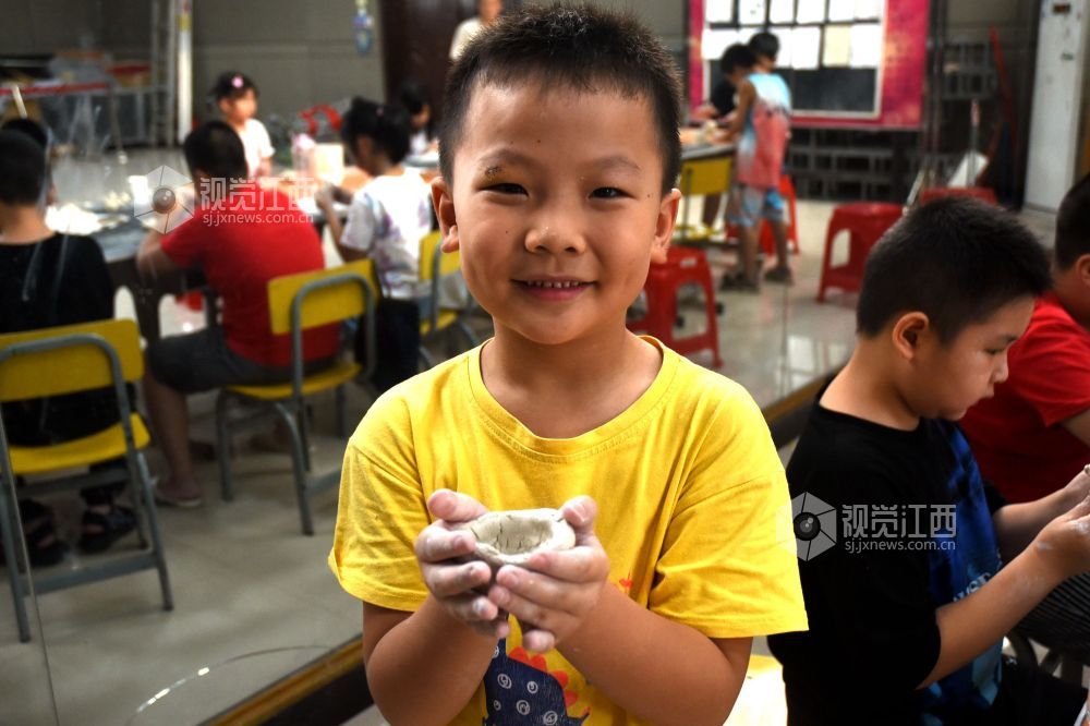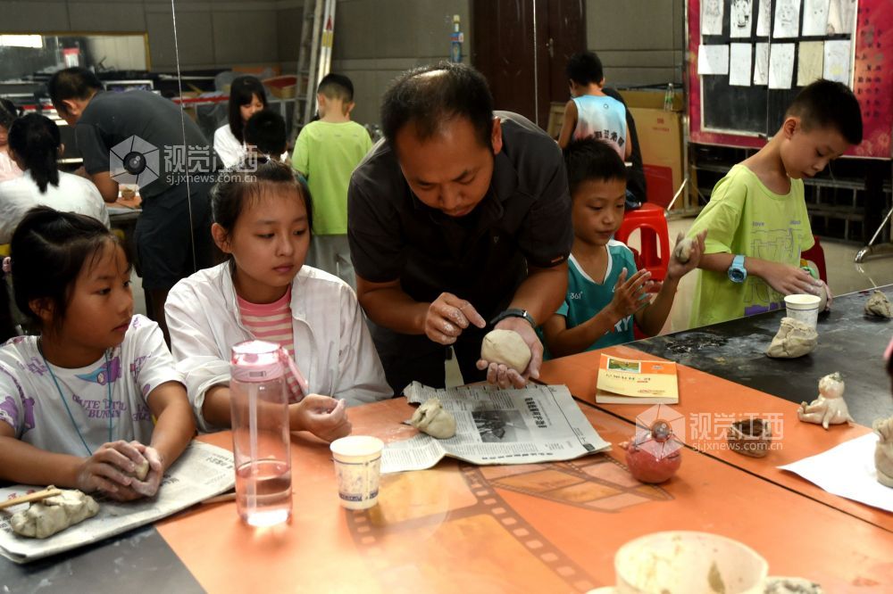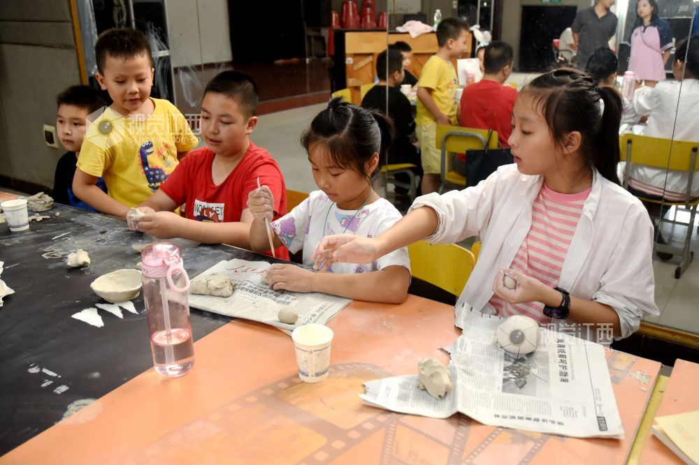 2022年7月29日,江西省抚州市南丰县文化馆内,16名中小学生在白舍窑非遗传承人谢振华的指导下,学习白舍窑手工制作艺术,旨在培养学生兴趣爱好,丰富他们的暑期生活。
