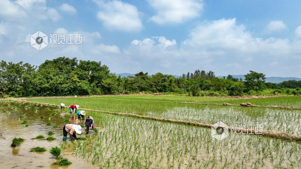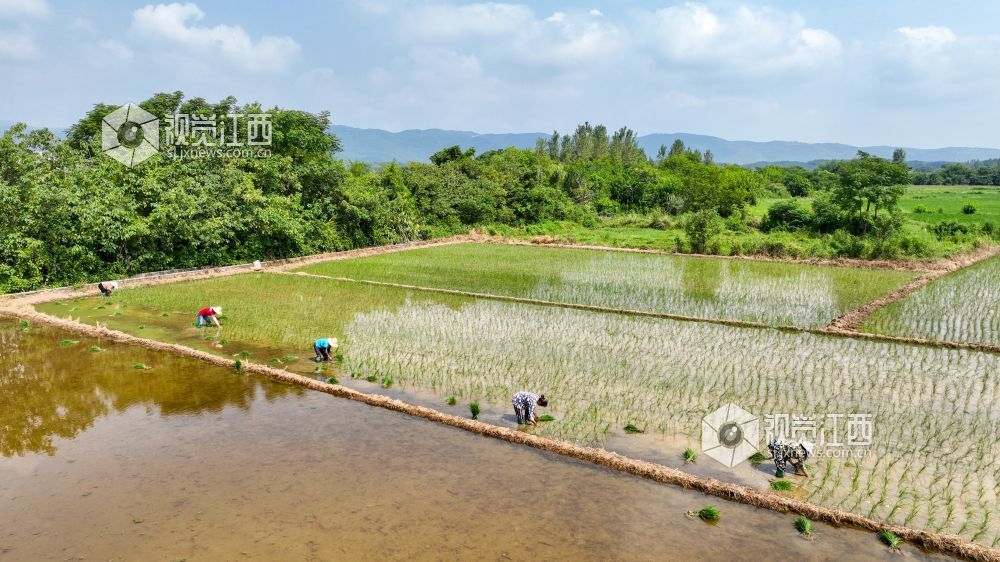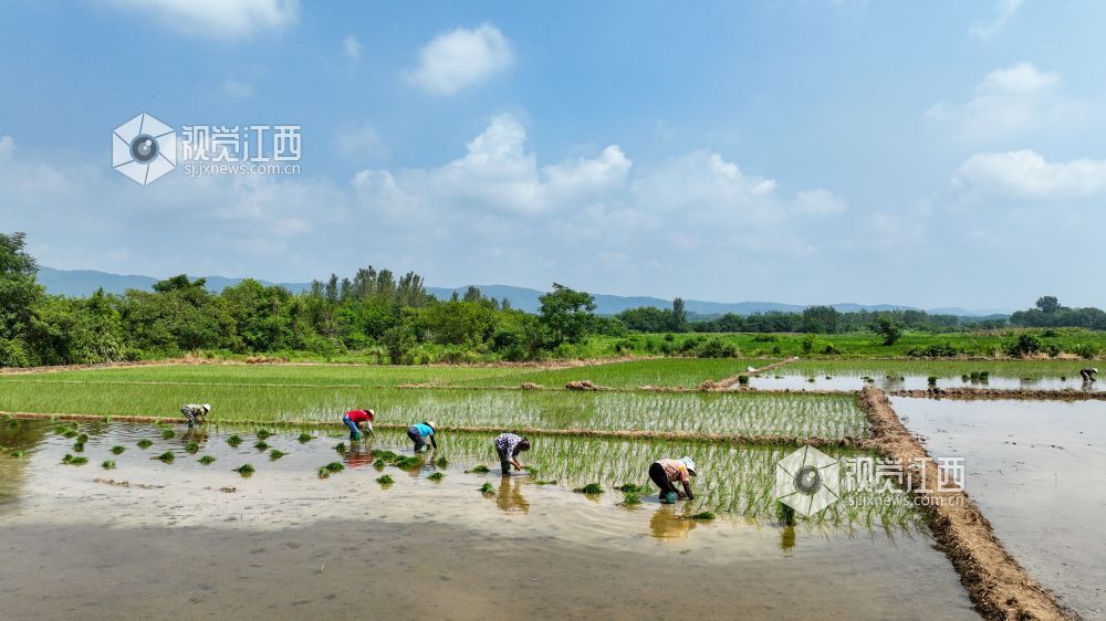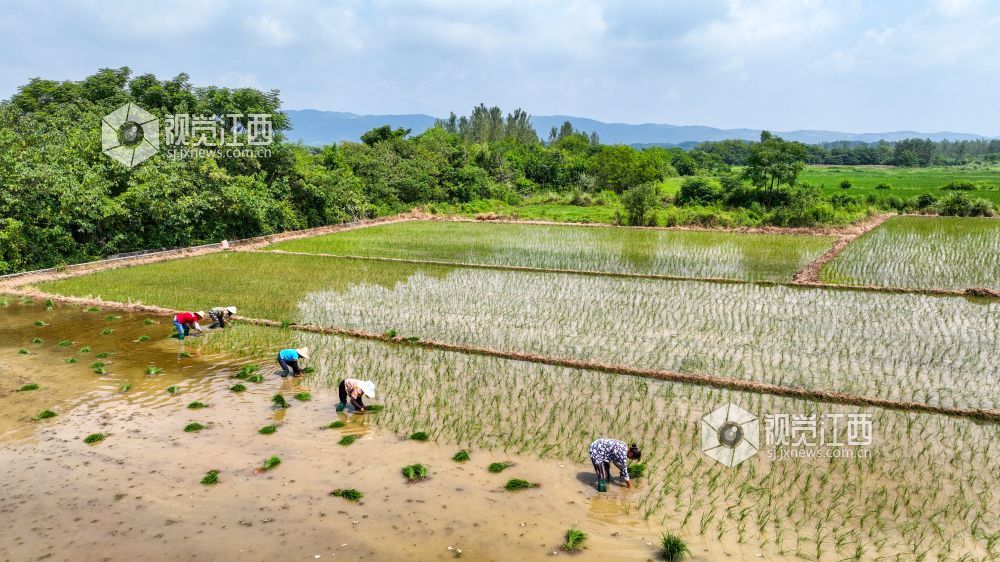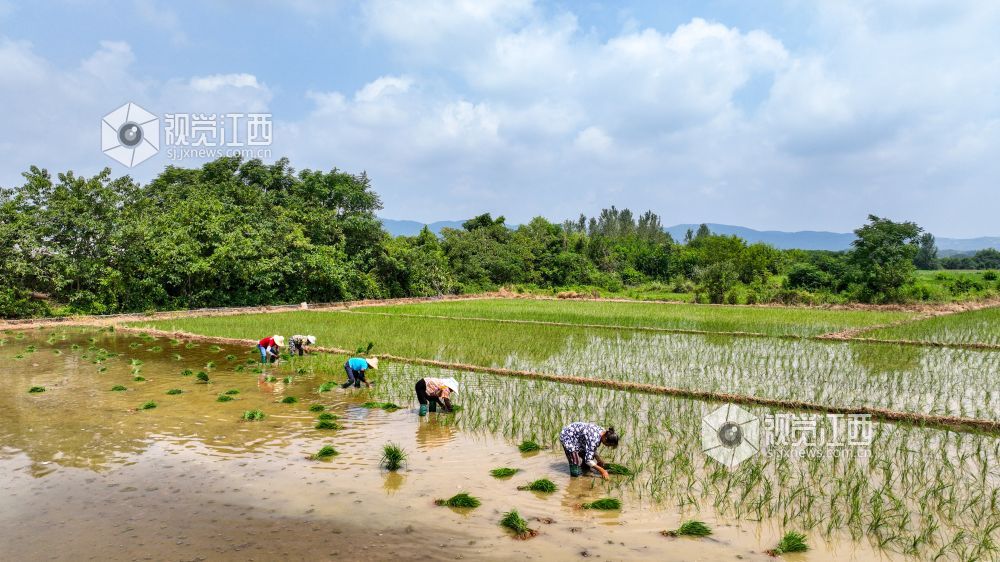 2022年7月30日,江西省瑞昌市范镇良田村,村民在农田里栽插晚稻。