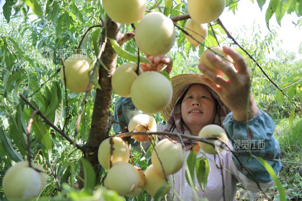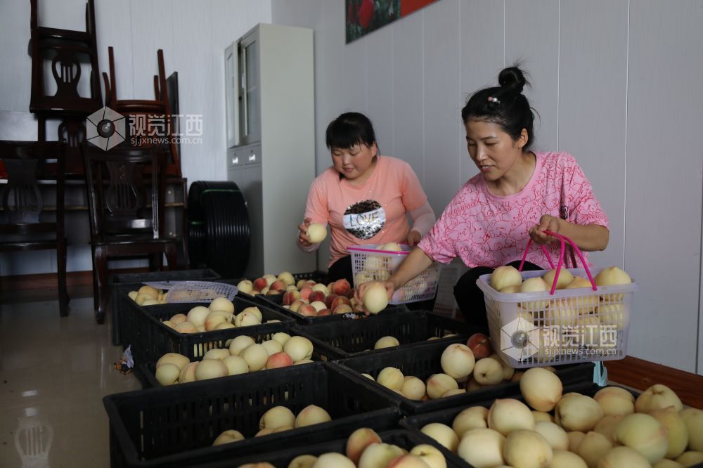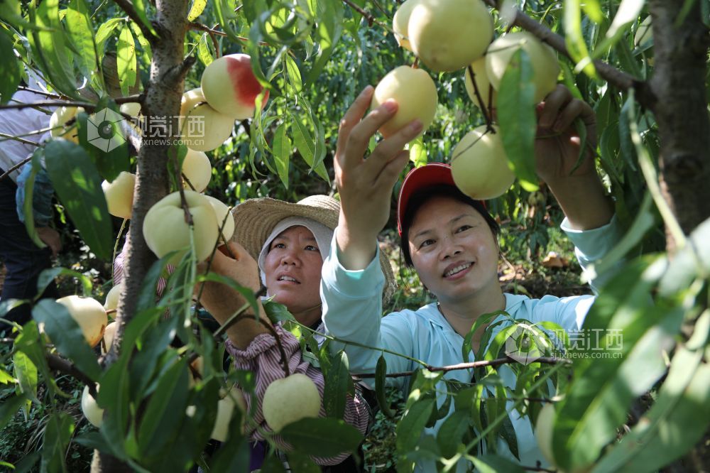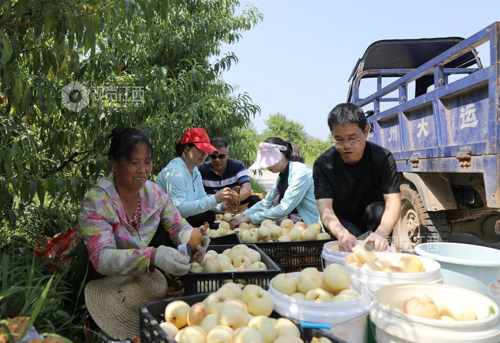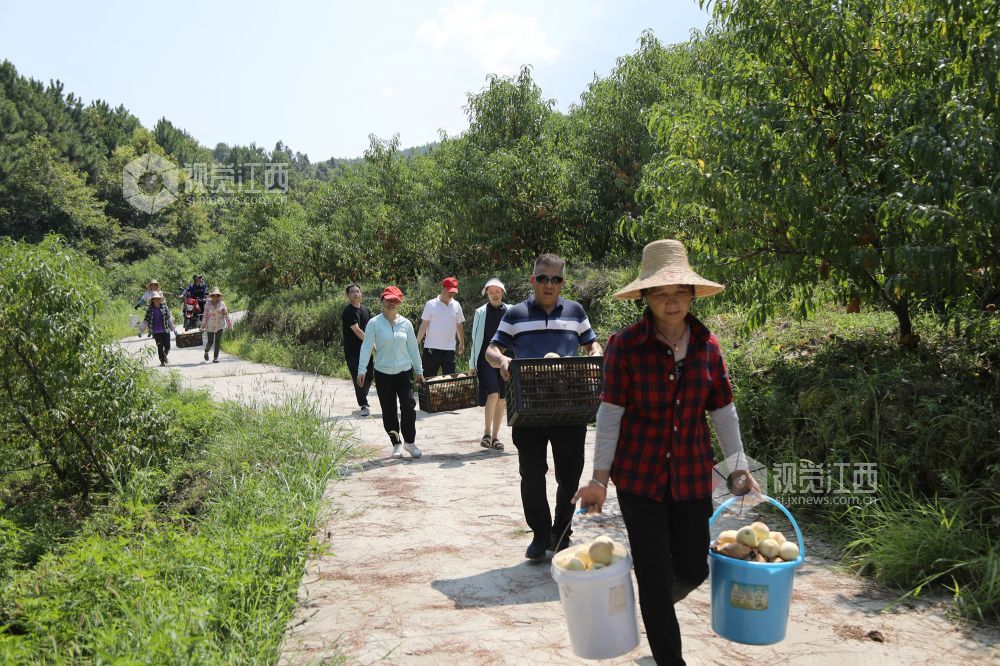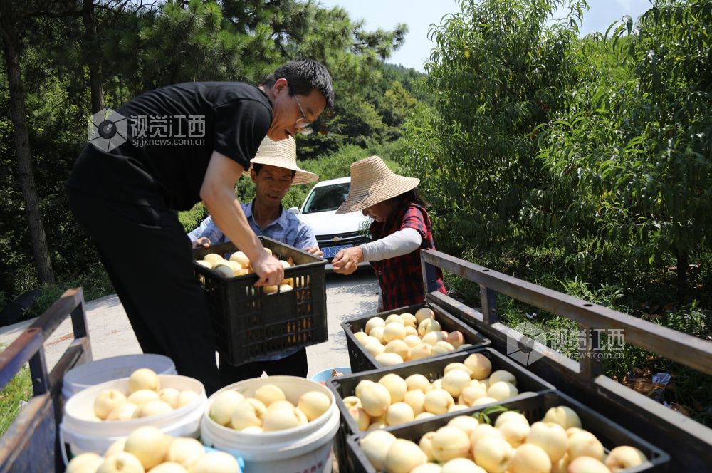 8月1日,走进江西省莲花县良坊镇白沙村秋雪蜜桃基地,只见绿油油的桃树结满了红的、黄的桃子。驻村帮扶的县人大干部与村民一道忙着采摘、挑运、分拣、装箱。