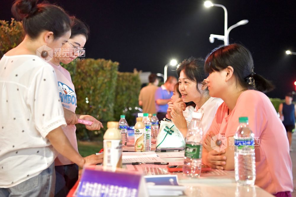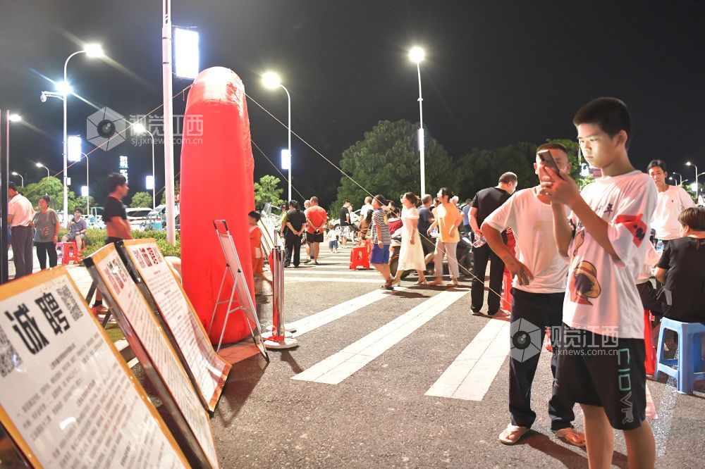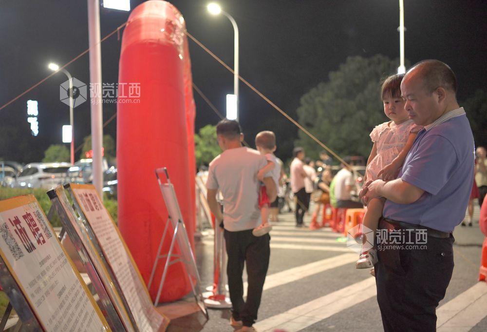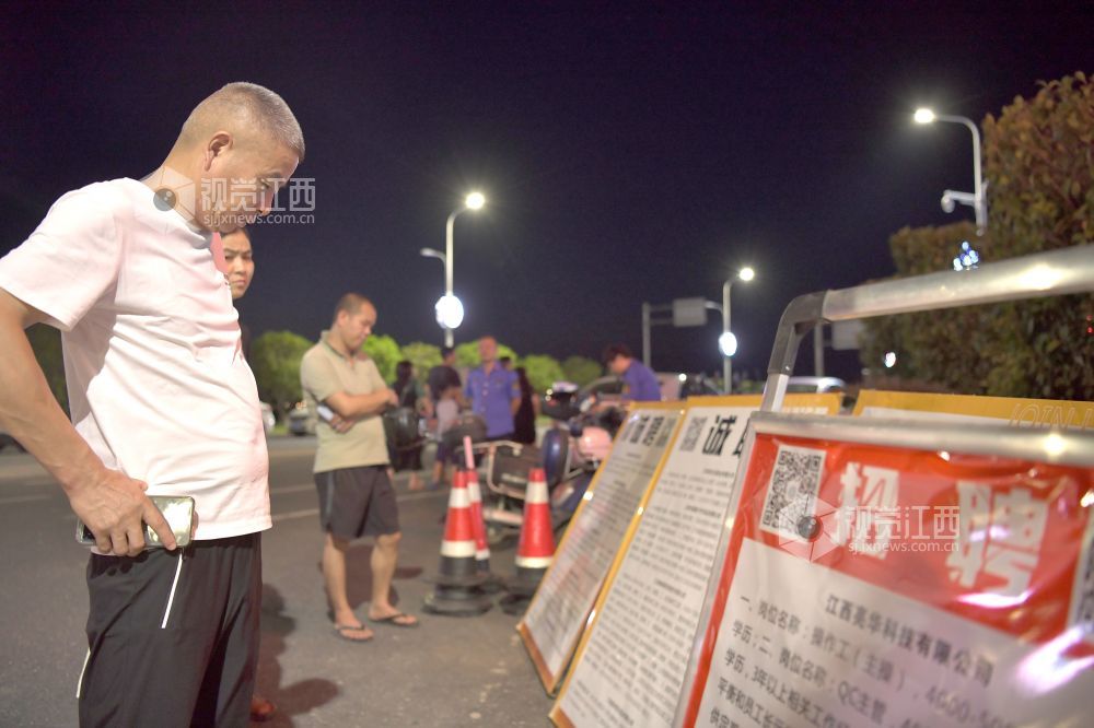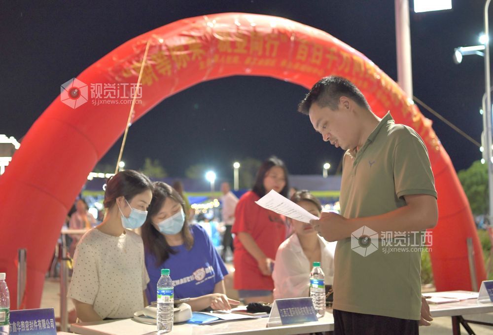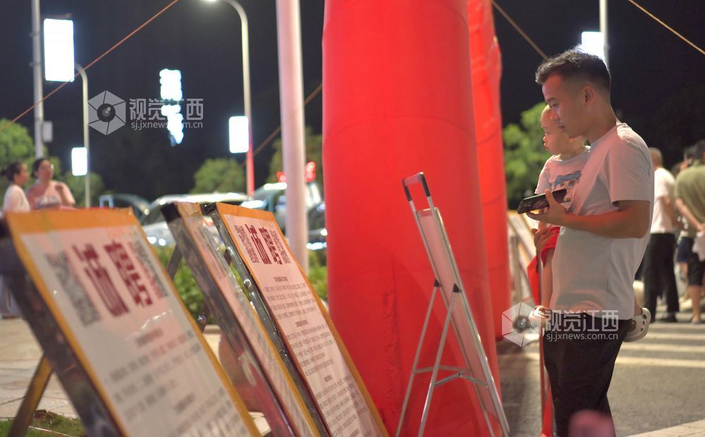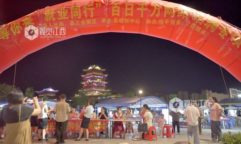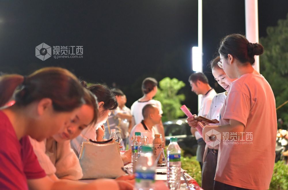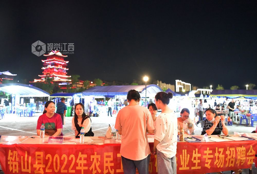 2022年8月4日晚,在江西省上饶市铅山县河口镇武夷阁广场,铅山县“职等你来,就业通行”百日千万网络招聘专项招聘会在此举办。