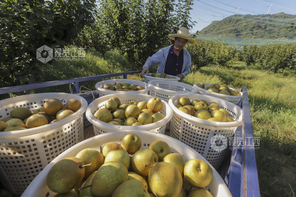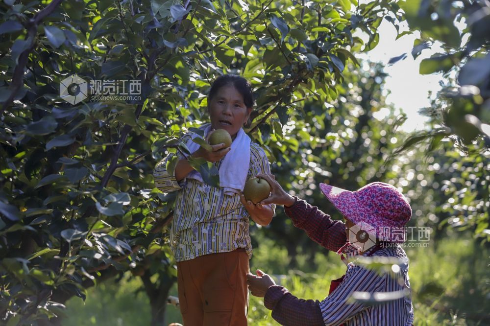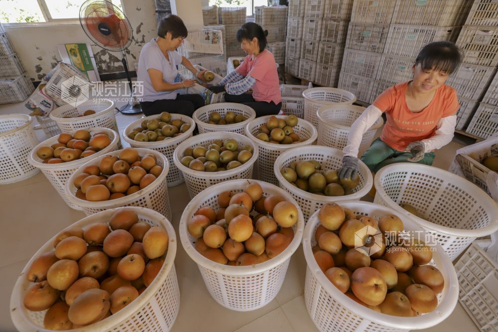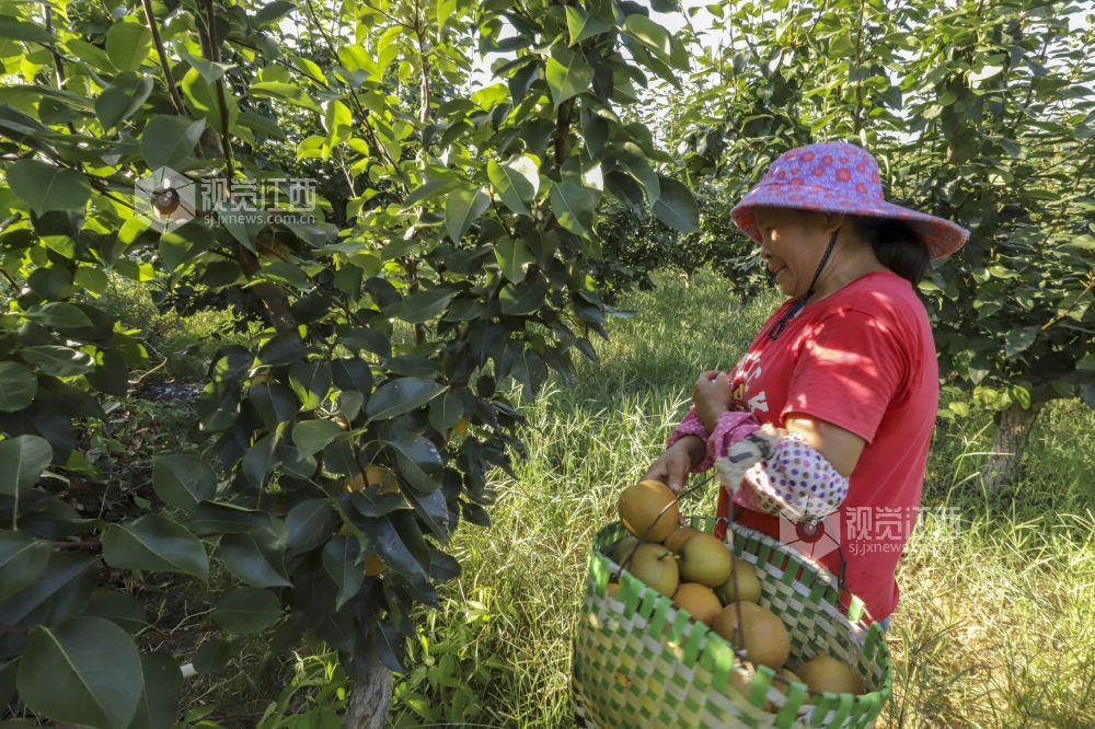 8月5日,江西湖口县石钟早熟梨专业合作社果农在凤凰山种植基地忙着采摘、分拣、包装、销售翠冠梨。