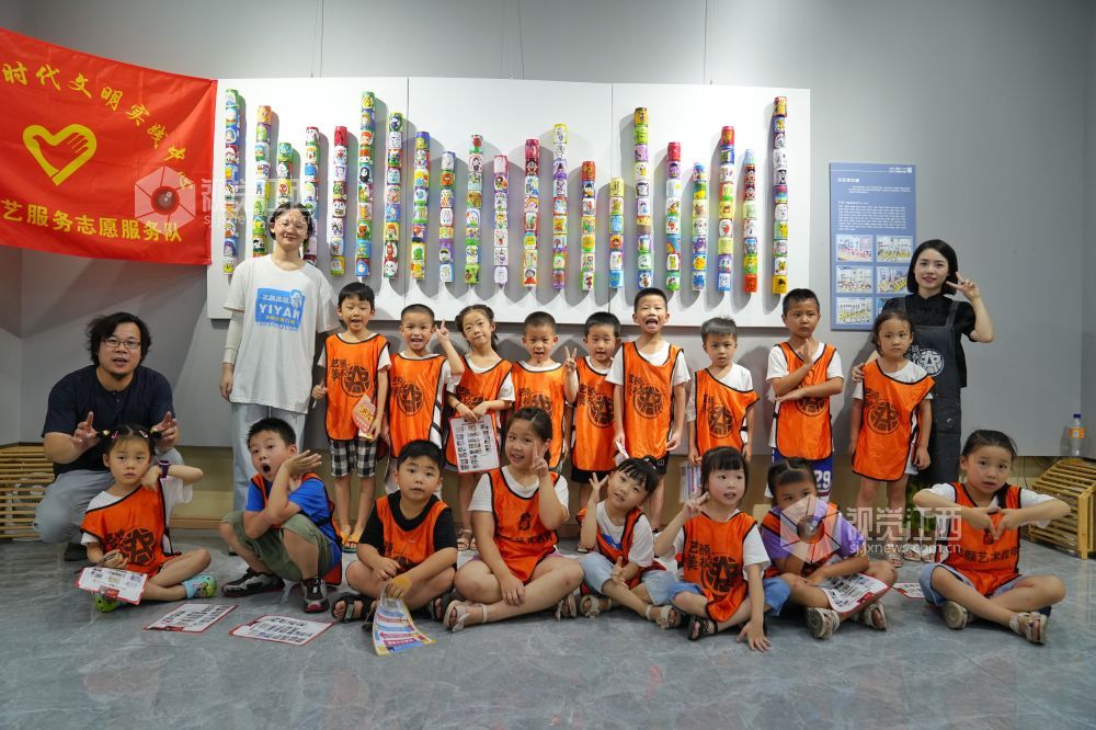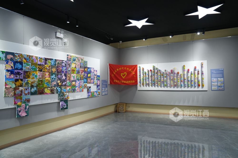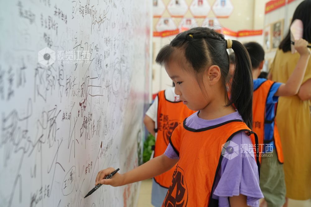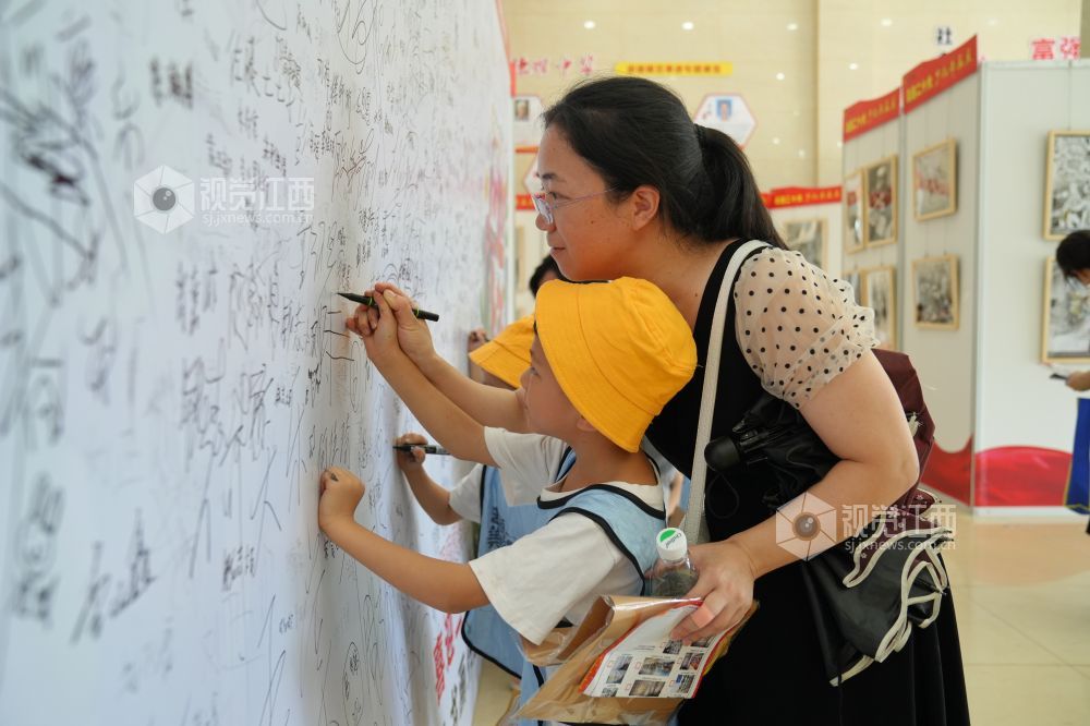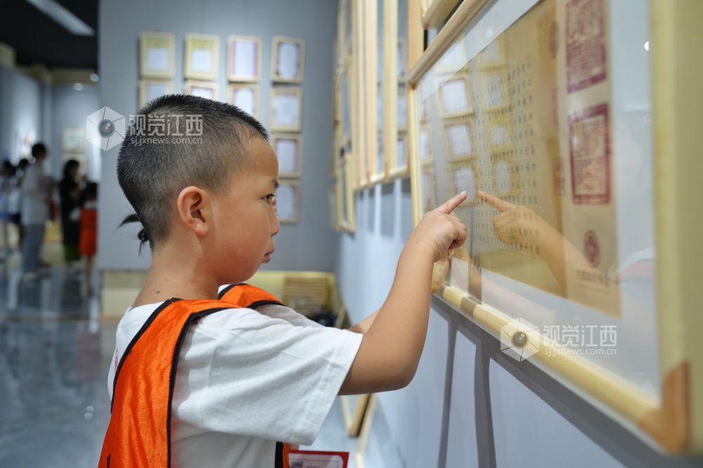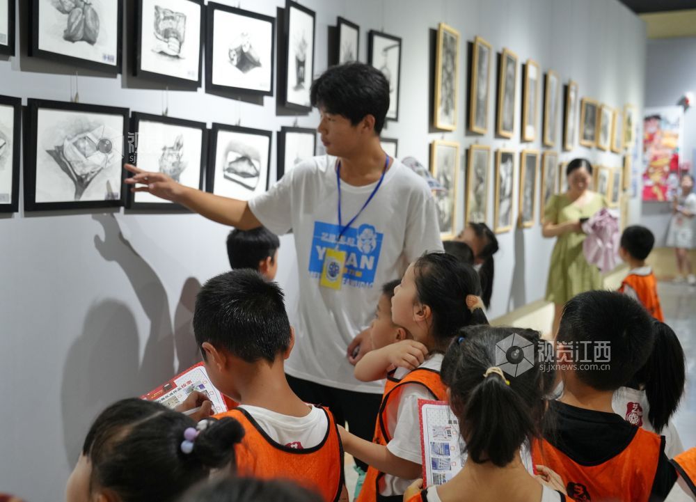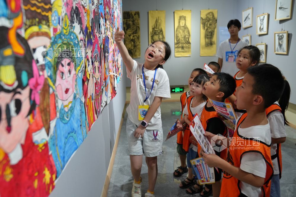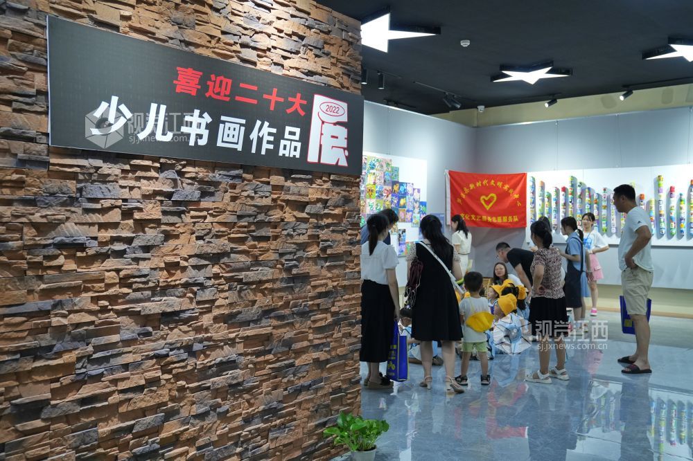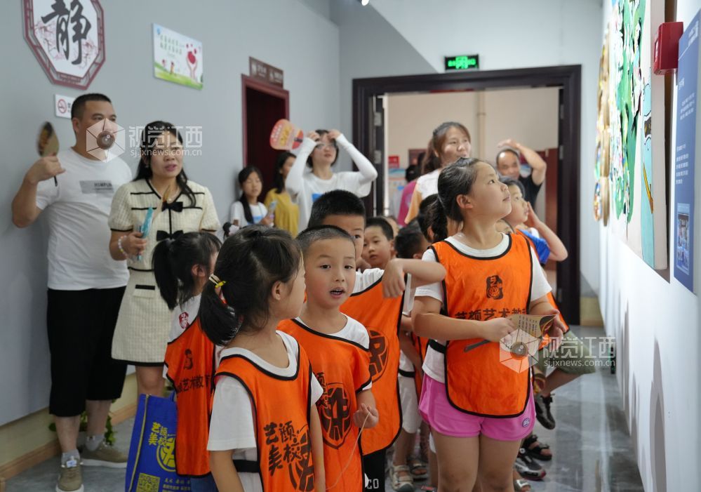2022年8月6日,在江西省萍乡市芦溪县文化艺术中心,孩子们在参观少儿书画作品展。