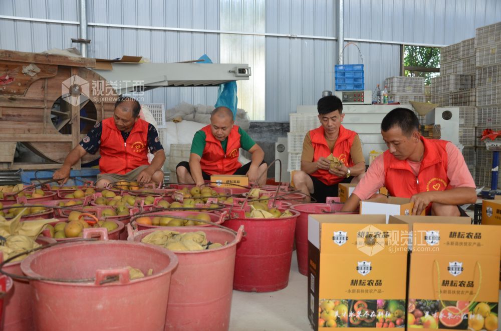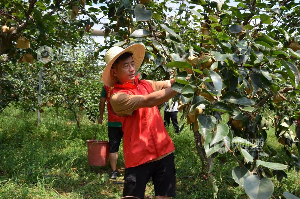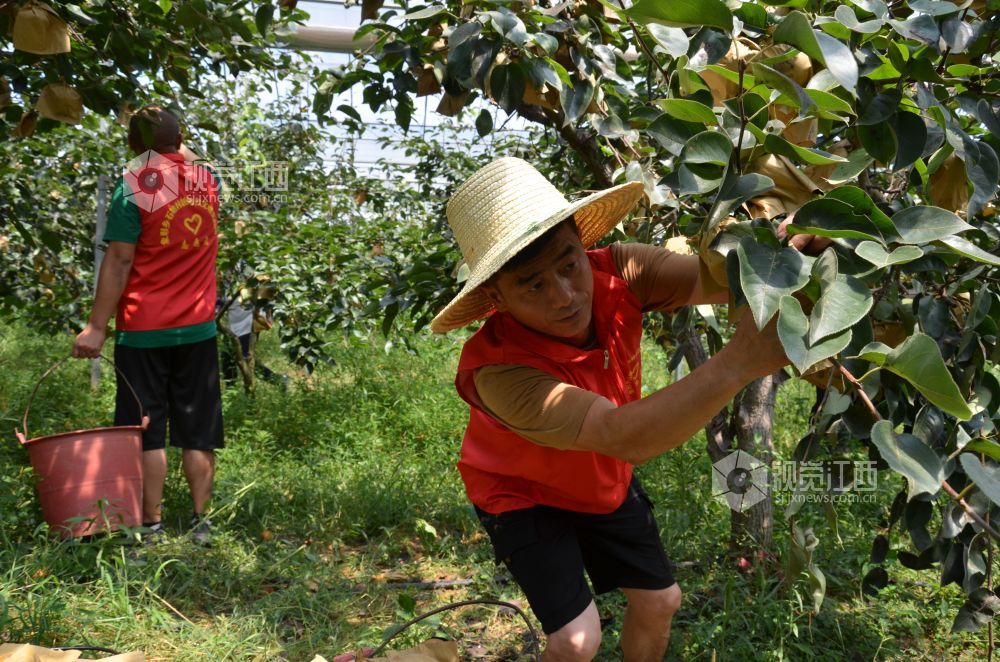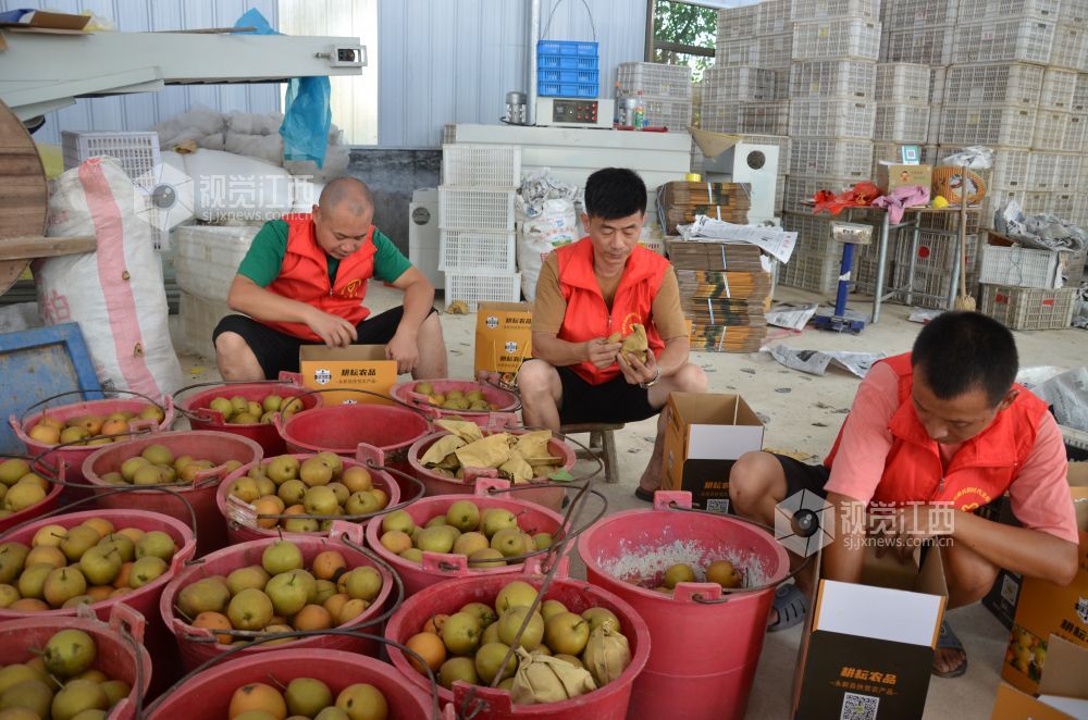 8月5日,在江西省永新县象形乡的贝加尔河农业生态基地的梨园里,该乡的党员志愿者在帮助种植户采摘、分拣、包装梨子,为种植户们解决人手不足的实际困难。