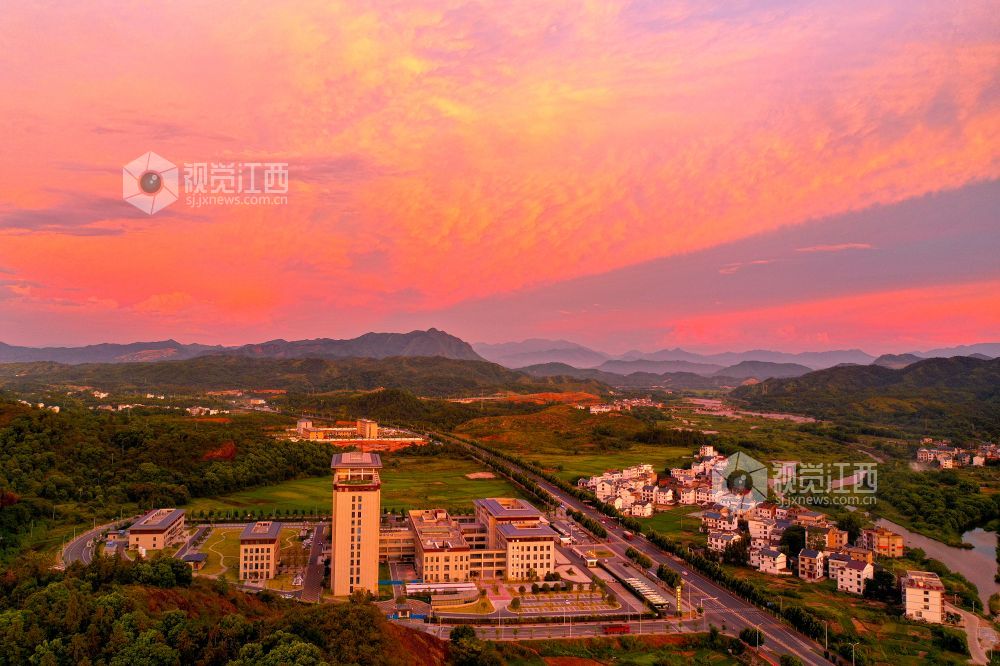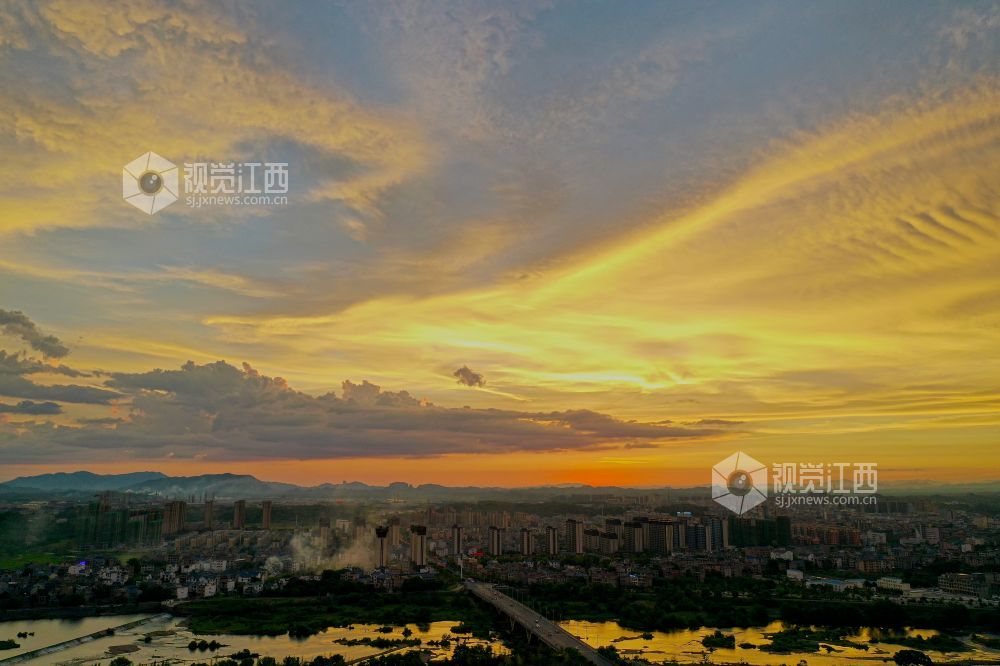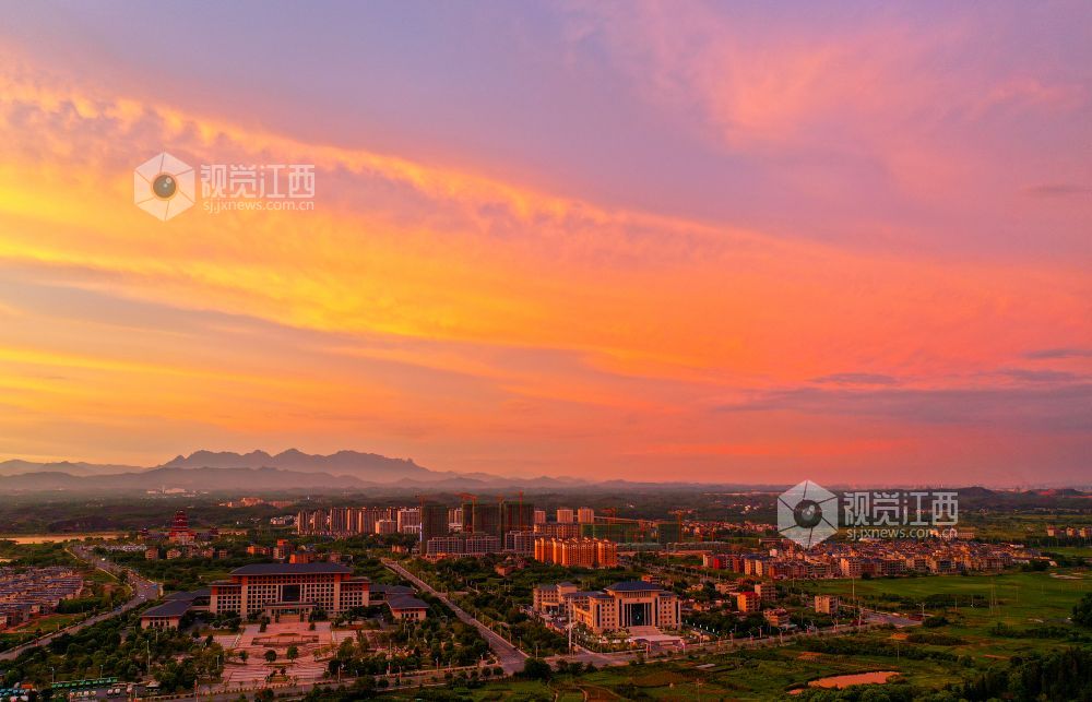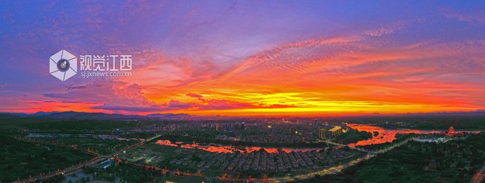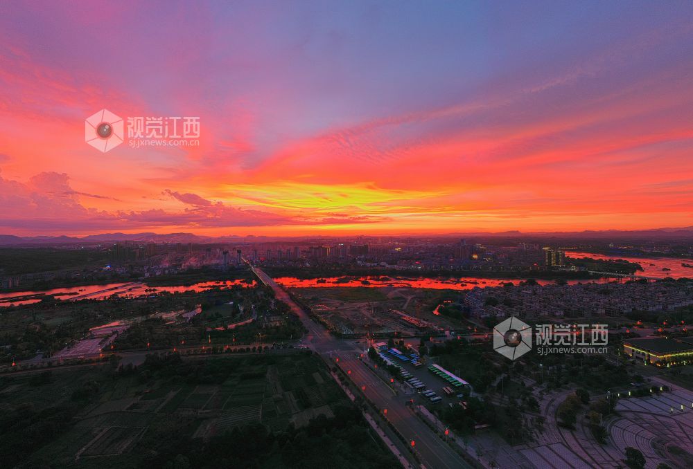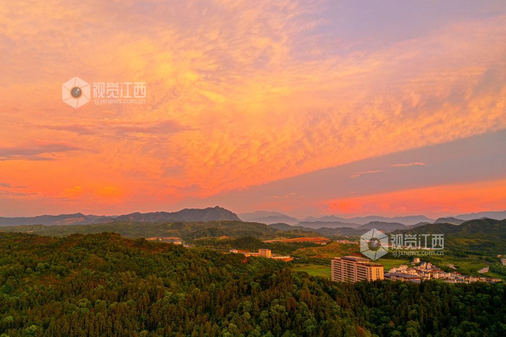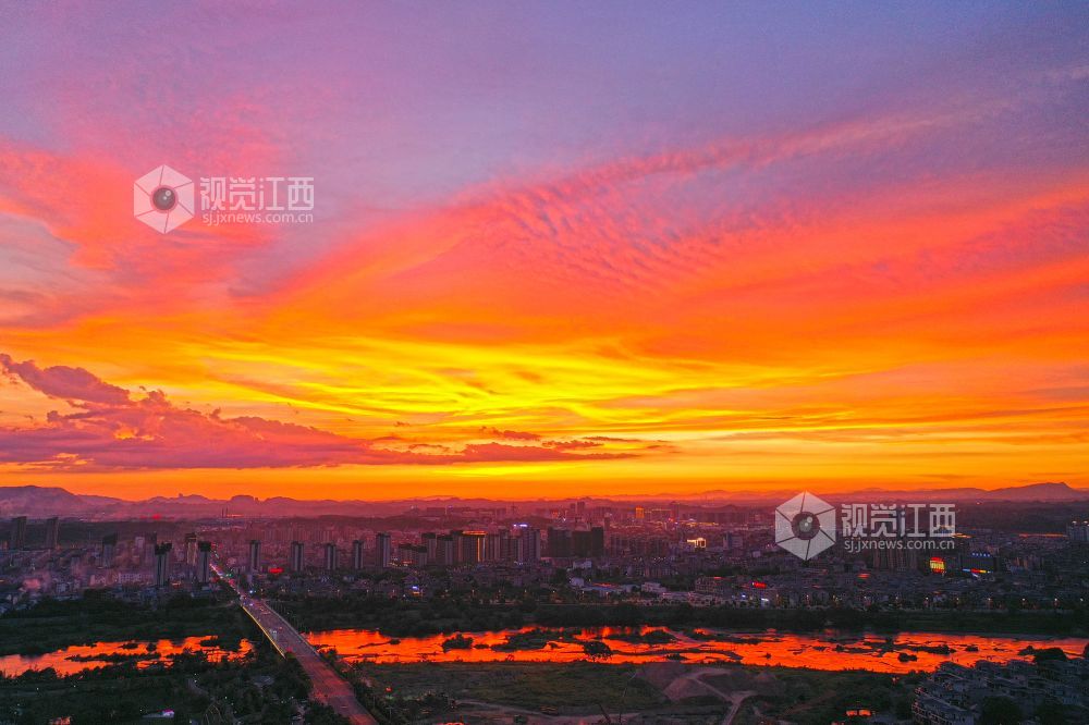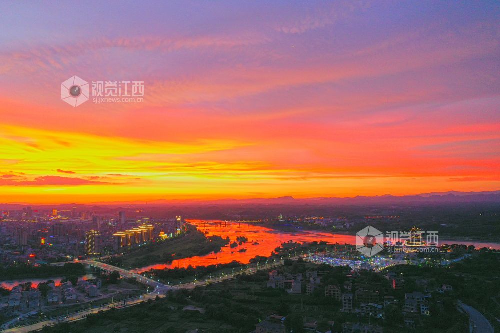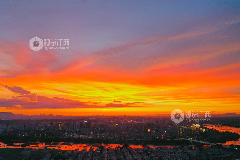 2022年8月6日傍晚,航拍江西省上饶市铅山县河口镇晚霞,火烧云把整个天空染红,蔚为壮观。落日时分,铅山天空出现了诱人的“咸蛋黄”,一抹金黄在整片天空蔓延开来,且越来越红仿佛从天际烧起的熊熊烈火,在渐渐昏暗的夜幕中显得尤为绚烂。