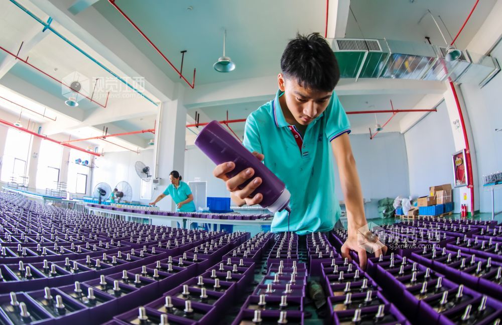2022年8月10日,江西省瑞昌市智造小镇江西泰容电子科技有限公司车间内,工人在生产线上赶制订单。
