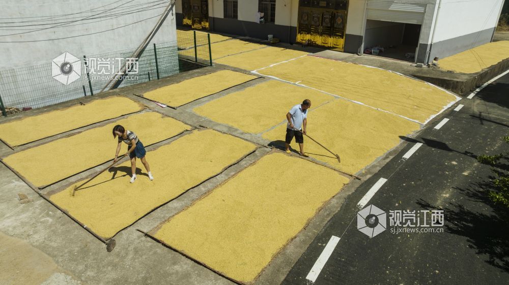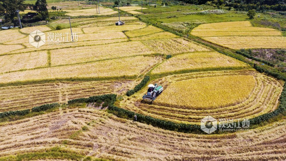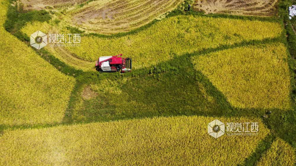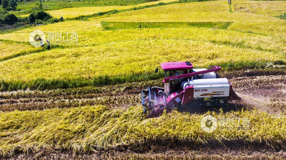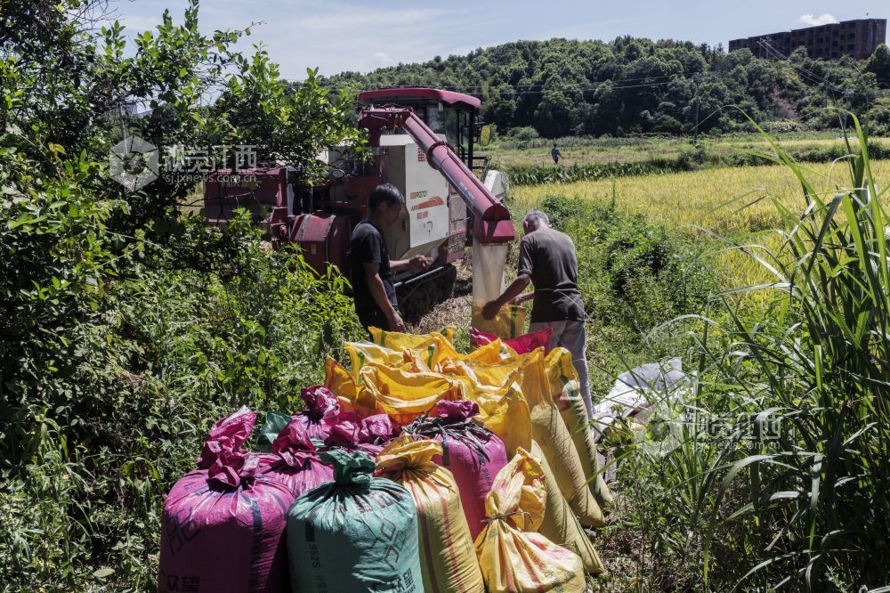 8月10日,江西省新余市仙女湖区河下镇礼泉村委上棚村种田大户刘振兰的水稻田里稻穗飘香,二台联合收割机机声隆隆,往返穿梭,一片繁忙的收割景象。