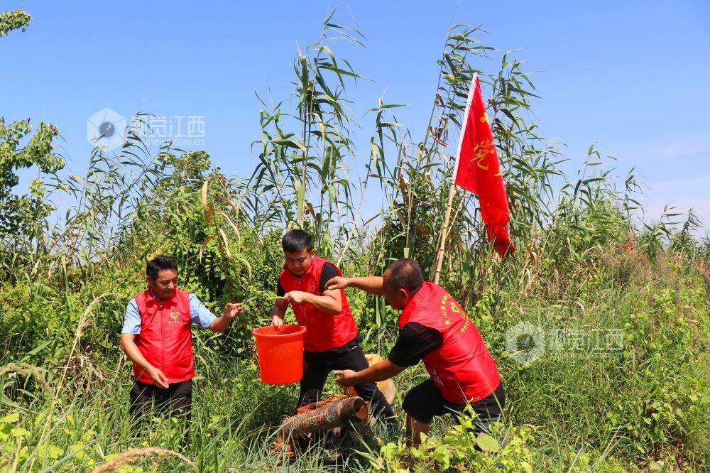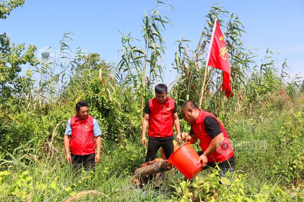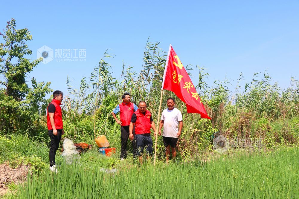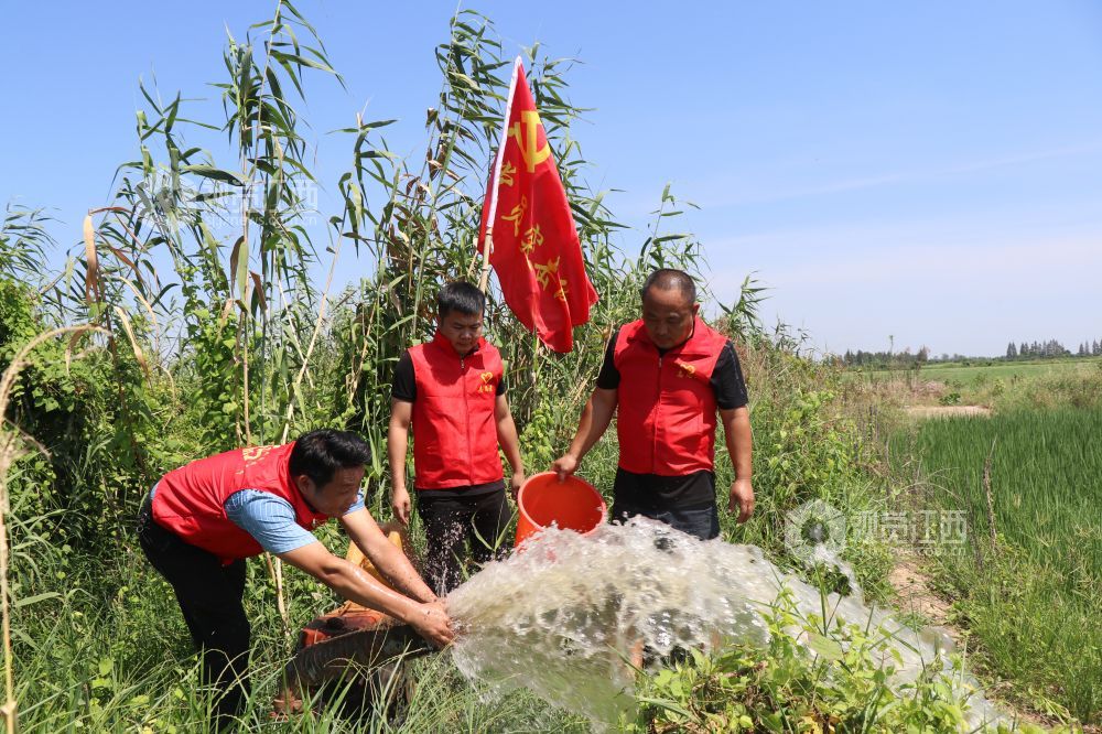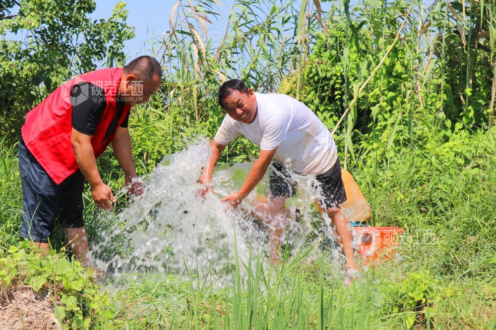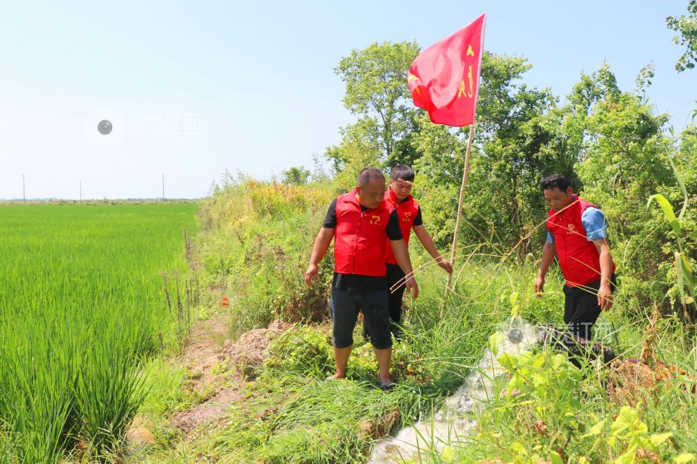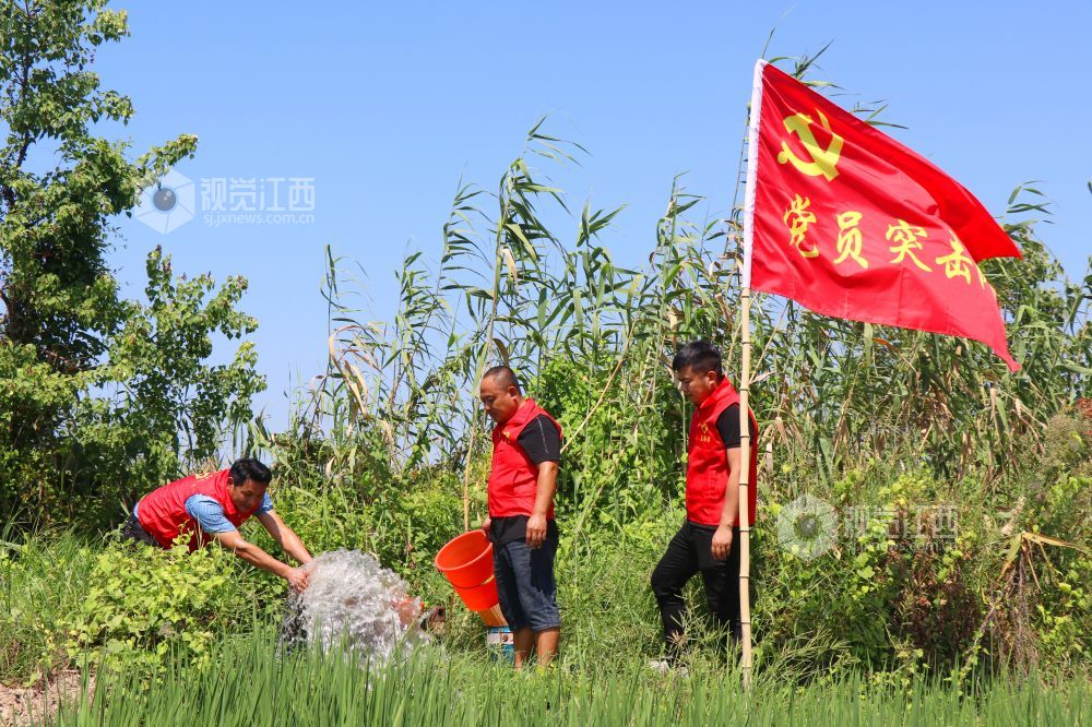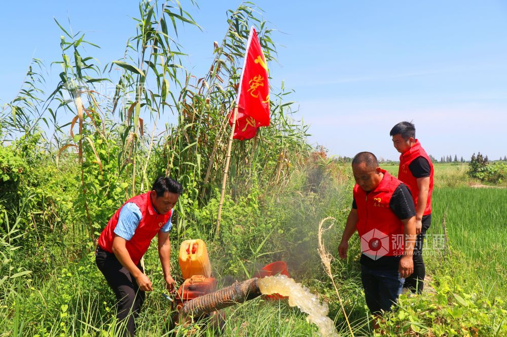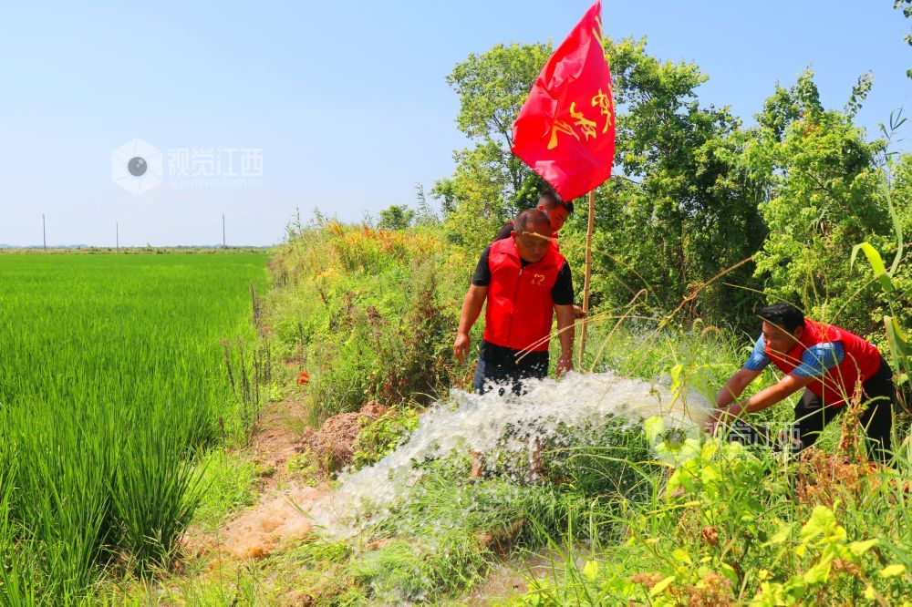 2022年8月13日,江西省余干县康山垦殖场落脚湖分场,党员志愿者在帮助农户抽水灌溉农田。