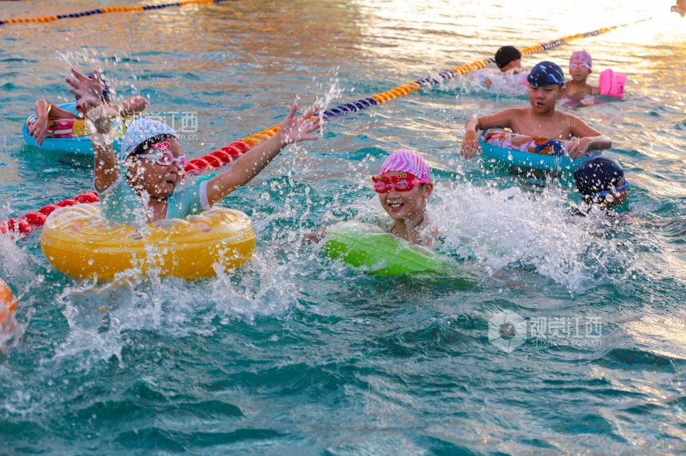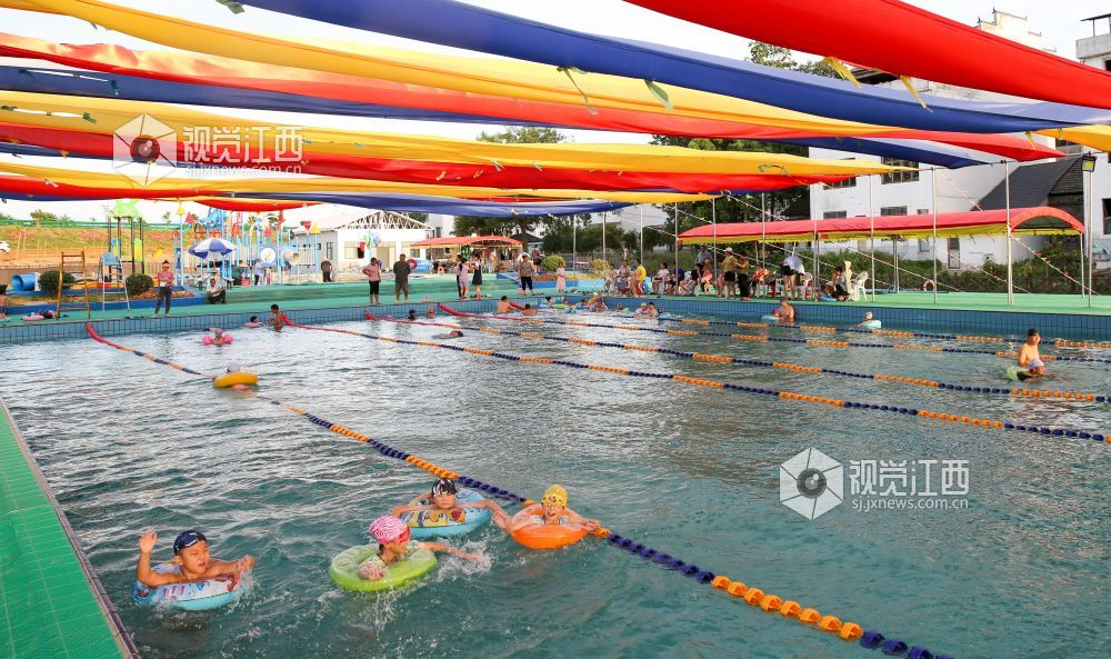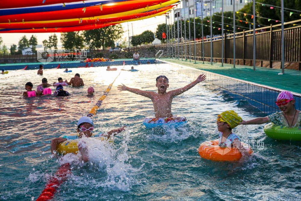 2022年8月13日,江西省瑞昌市赛湖农场的小朋友们在“水上乐园”内游泳、嬉戏。