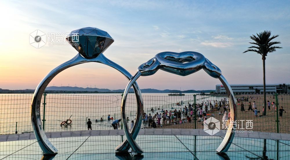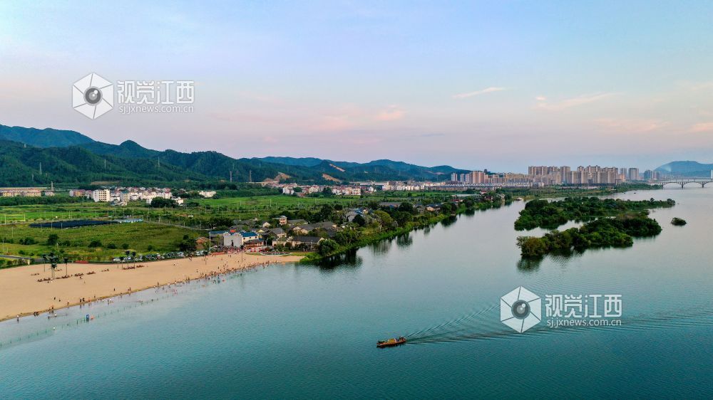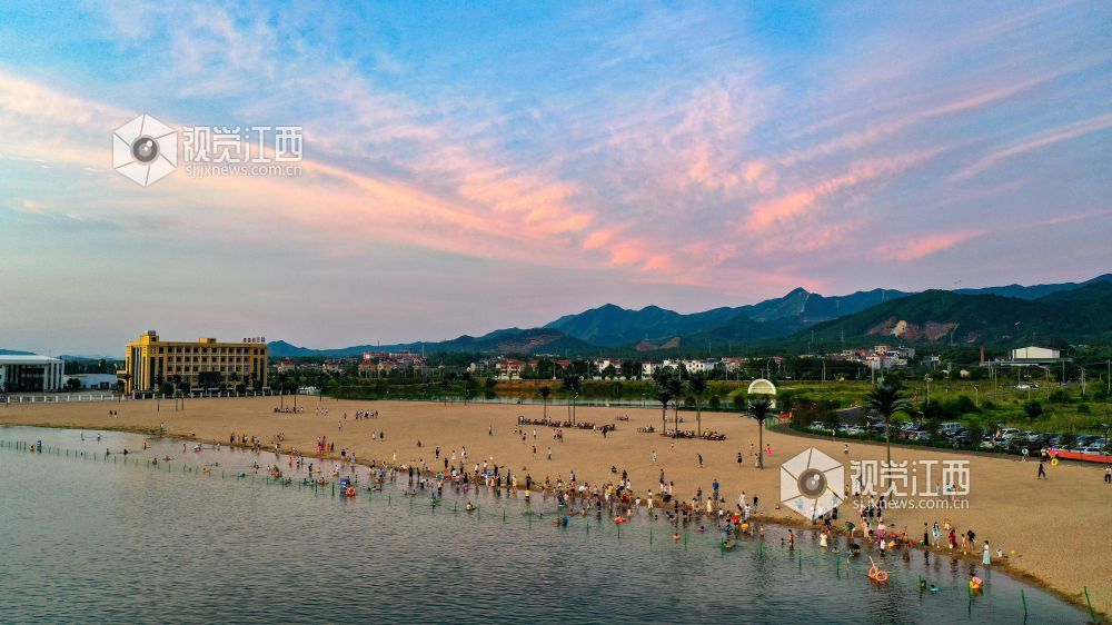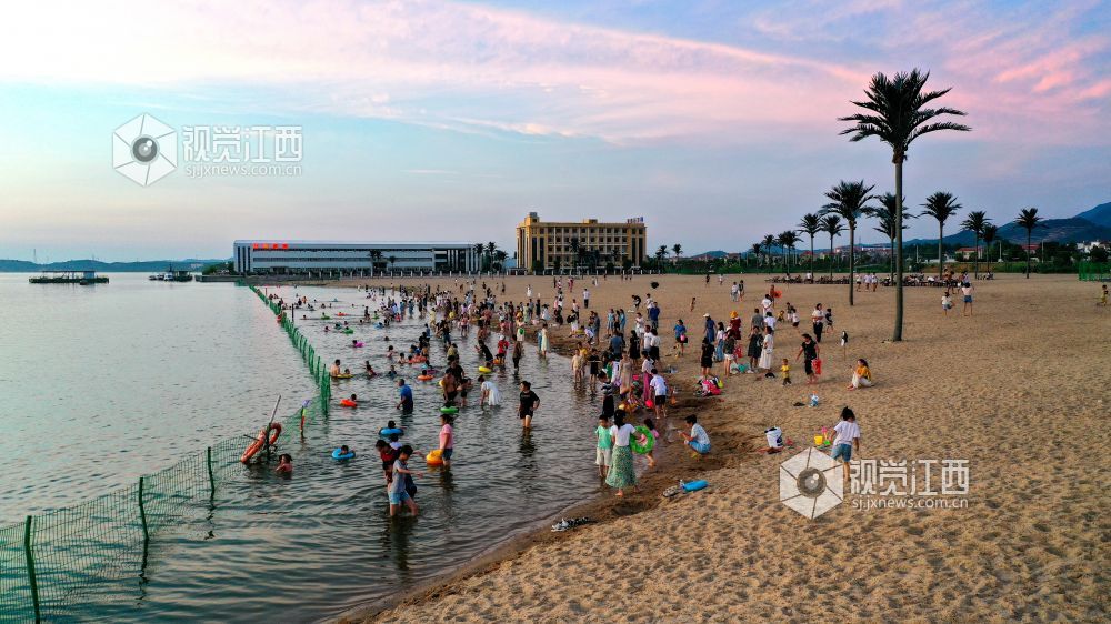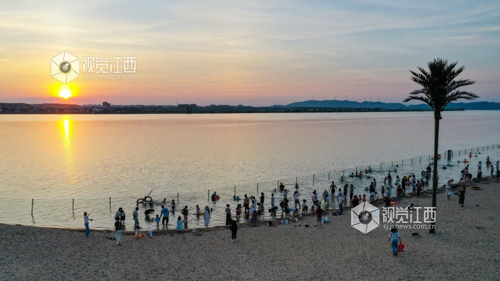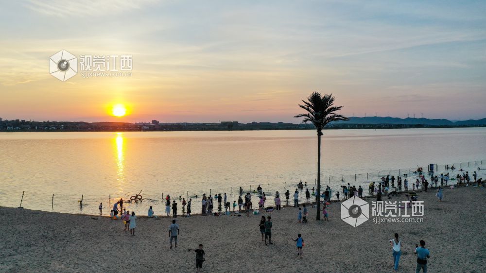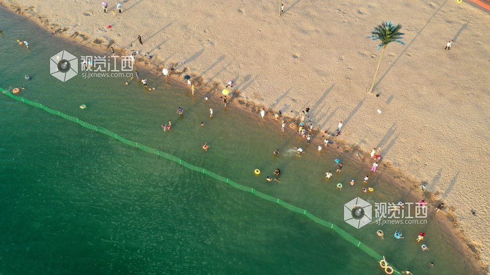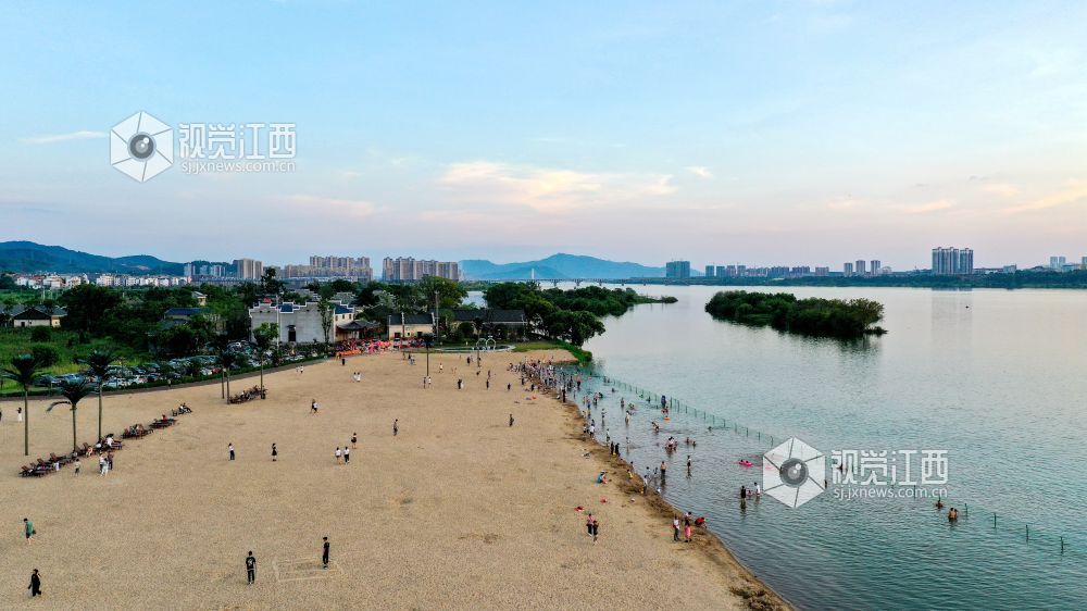 2022年8月15日,江西省吉安市吉水县赣江岸边坝溪古渔村沙滩网红打卡地热闹非凡,众多市民和游客来前来戏水消暑,乐享清凉。