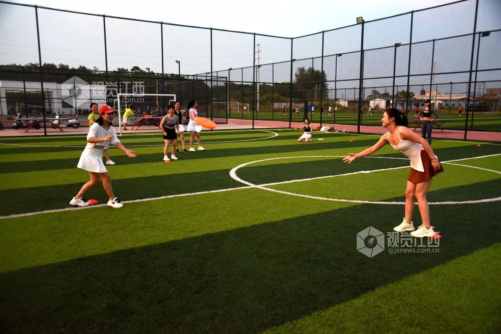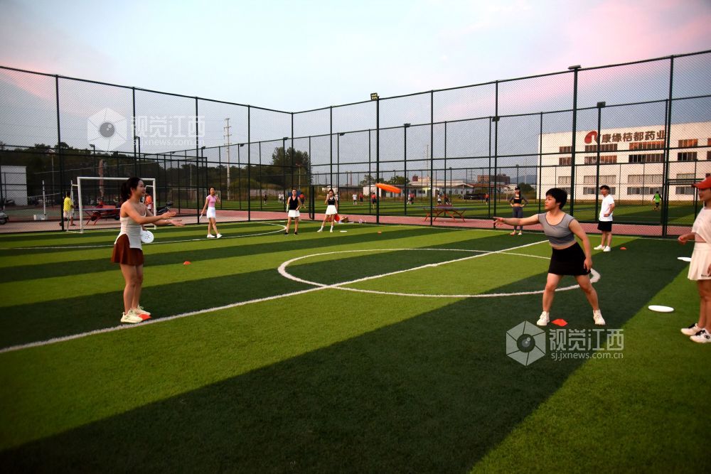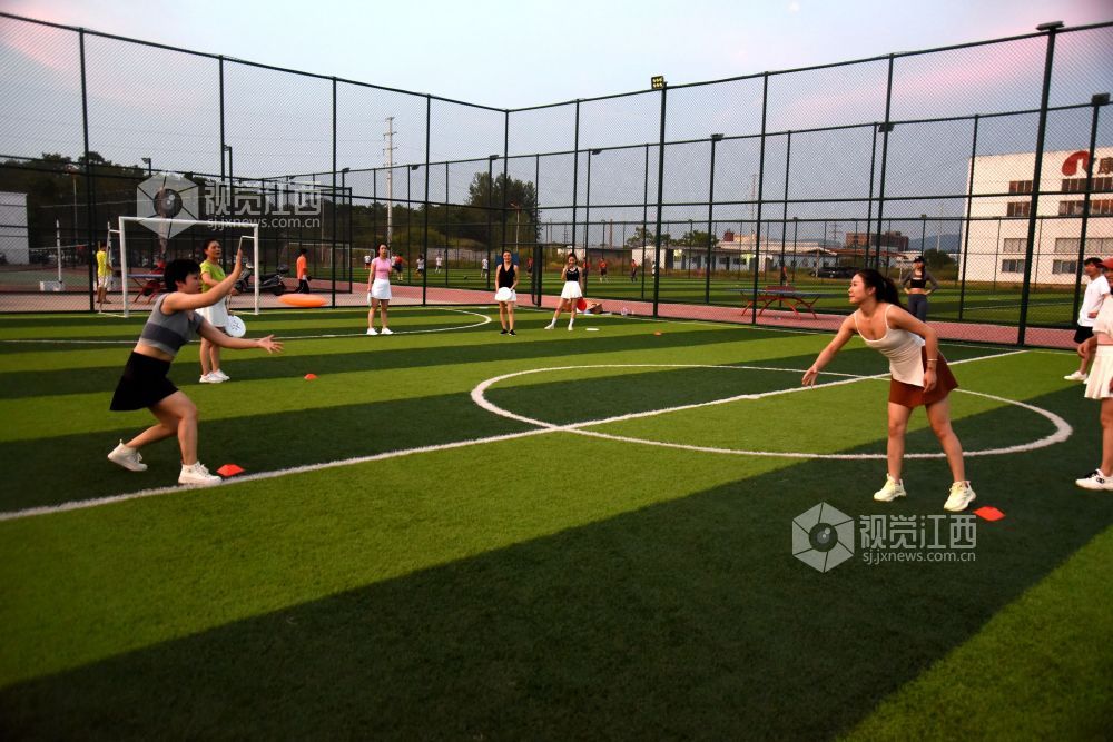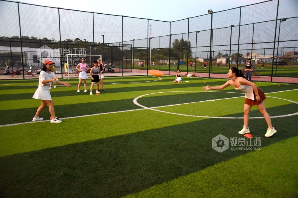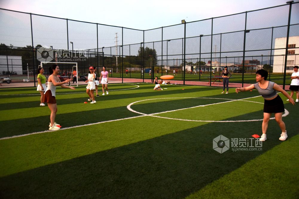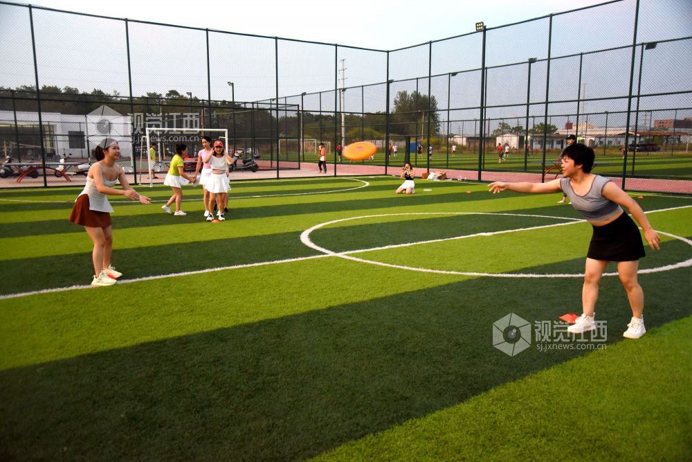 2022年8月16日,在江西省抚州市南丰县河东新区社会运动场上,不少市民在练习飞盘运动。