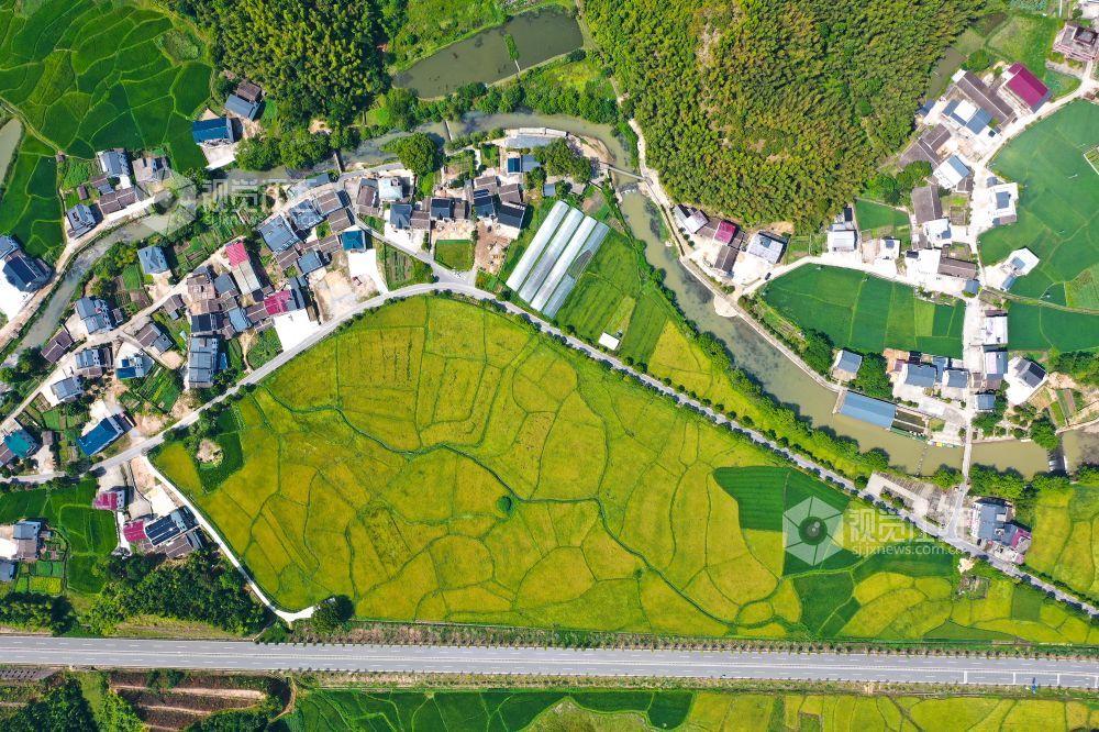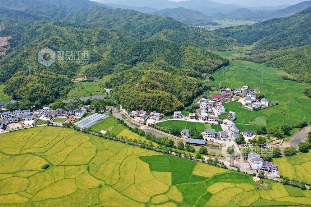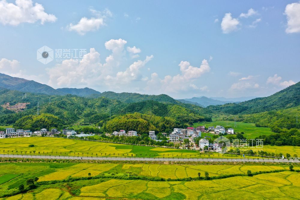 2022年8月17日,航拍江西省上饶市铅山县葛仙山镇民谣水湾,初秋的田园与翠绿的青山相映成趣,“丰”景如画。