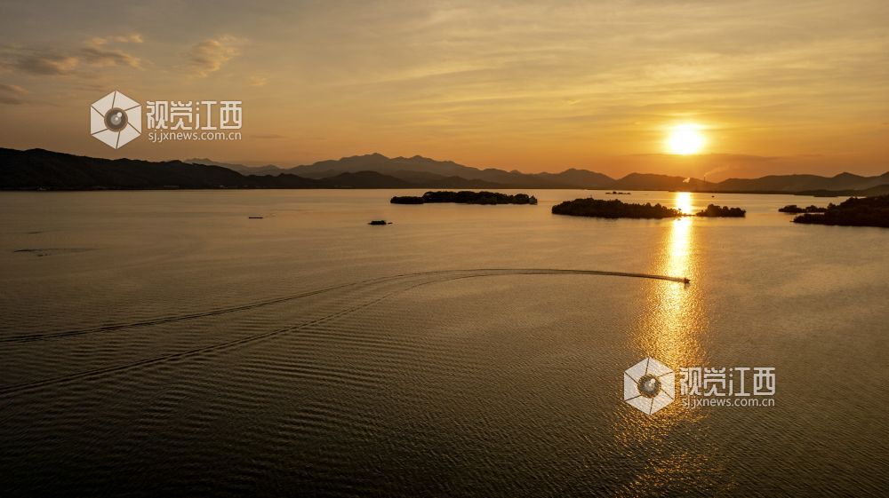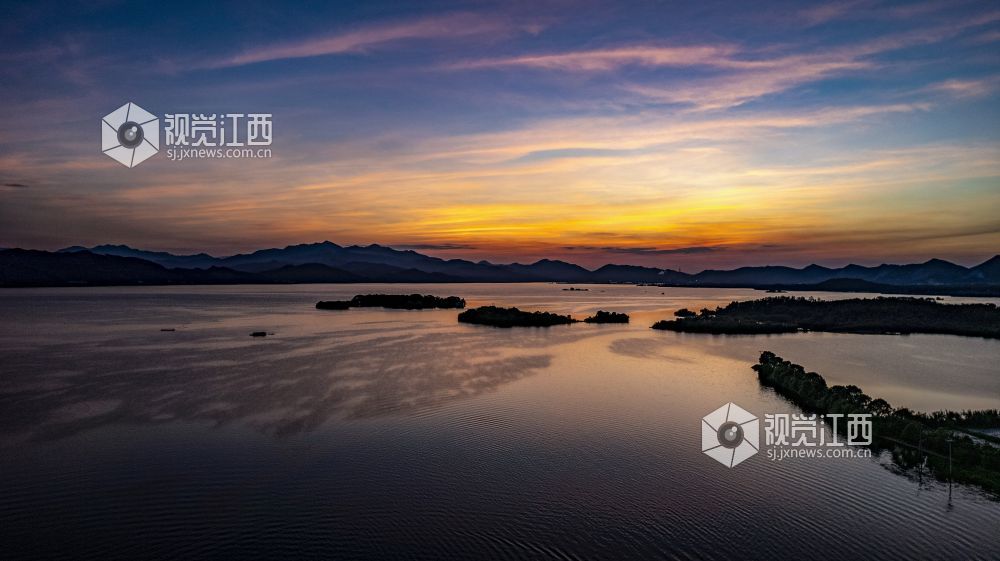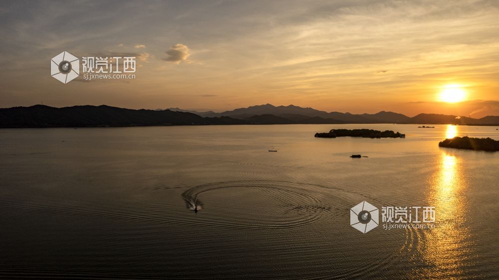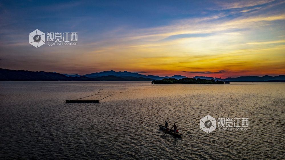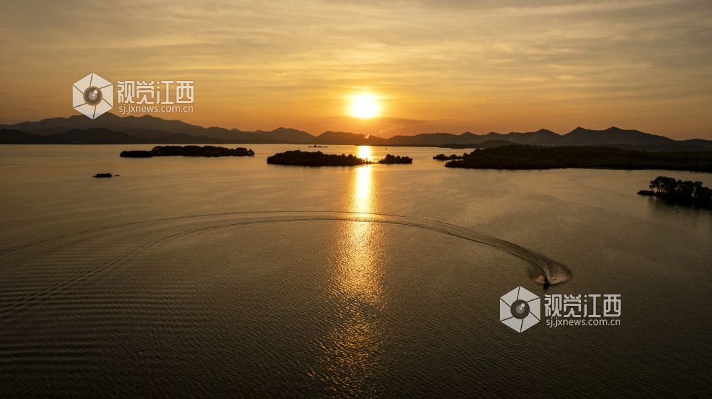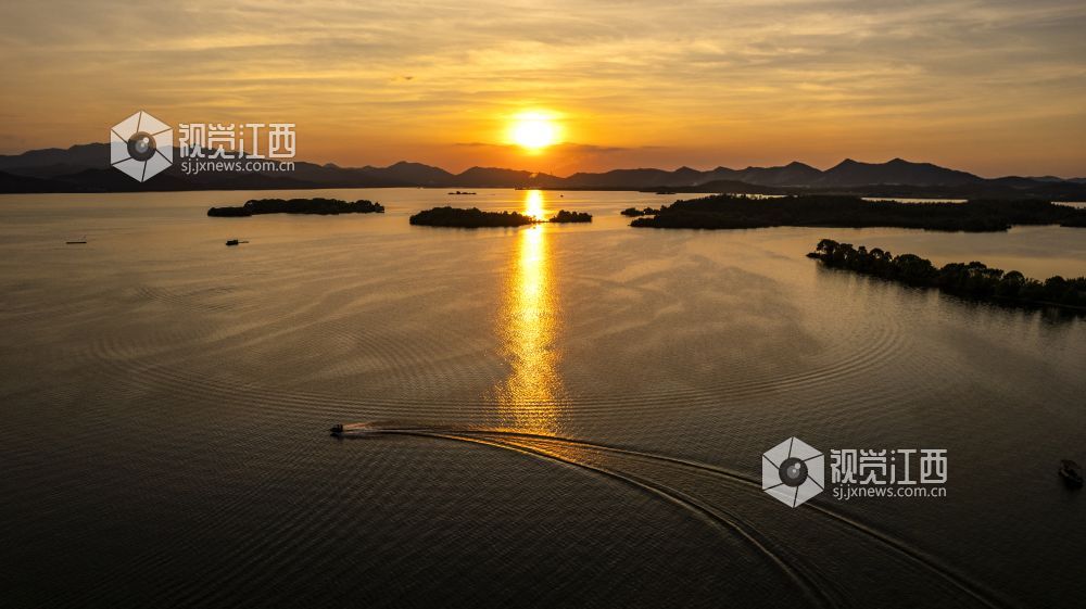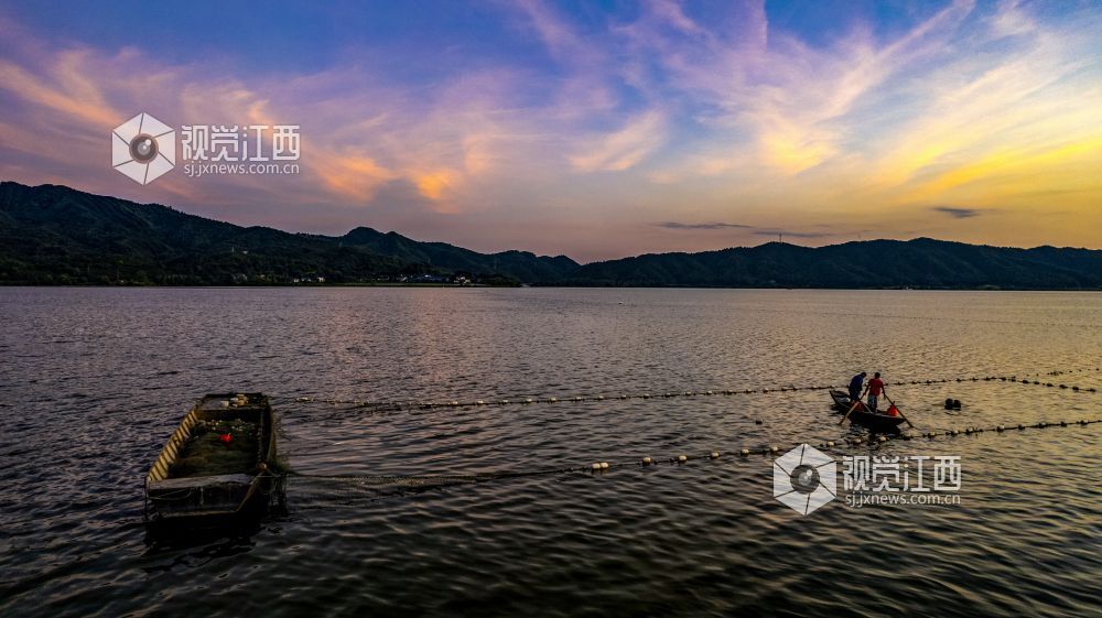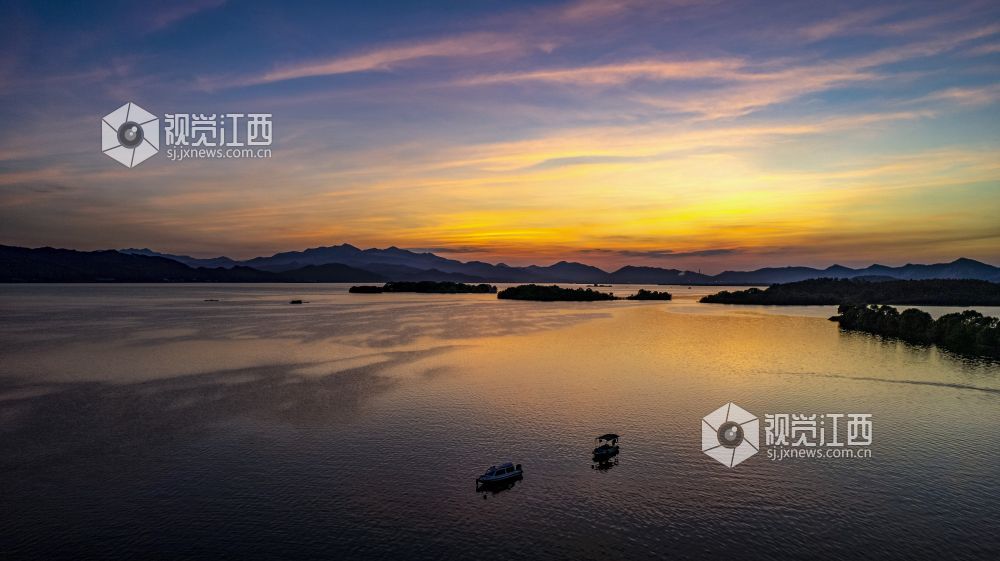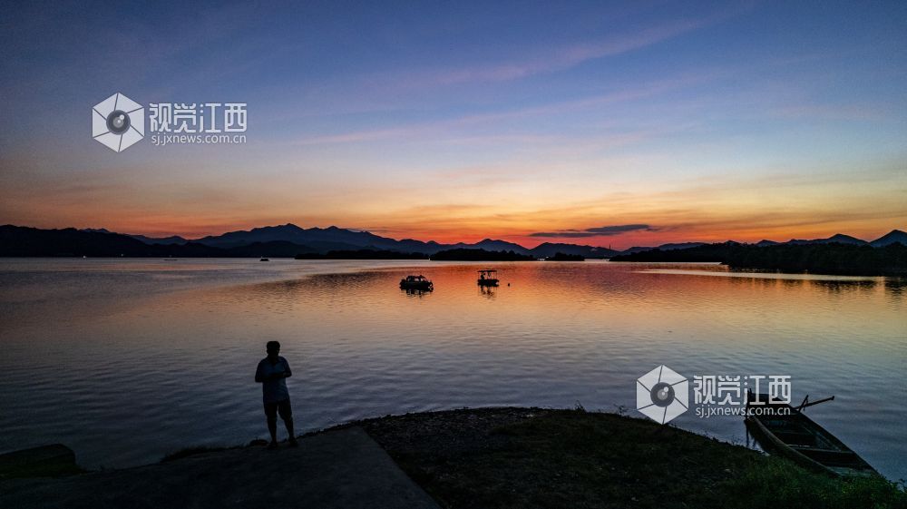 8月19日,江西省新余市仙女湖上空晚霞漫天,倒映水中。在白田村渔业码头处,骑摩托艇玩水的人们及渔民的渔船相映成趣,水天相接,构成一幅美妙绝伦的画面。