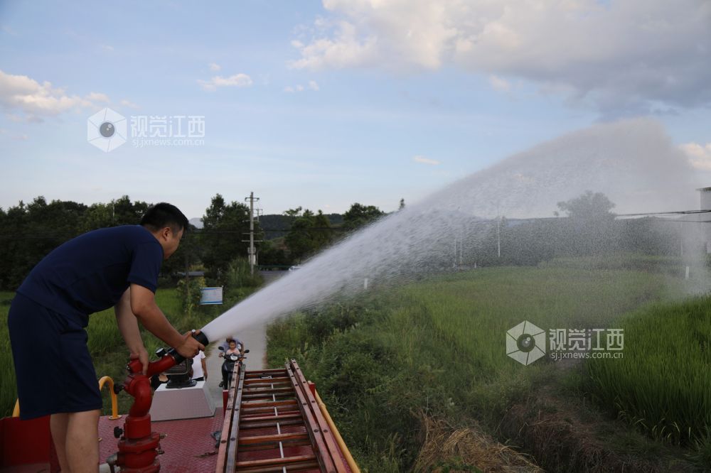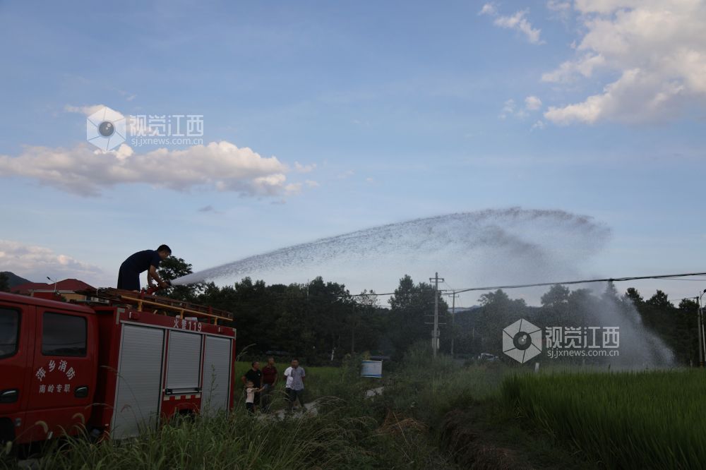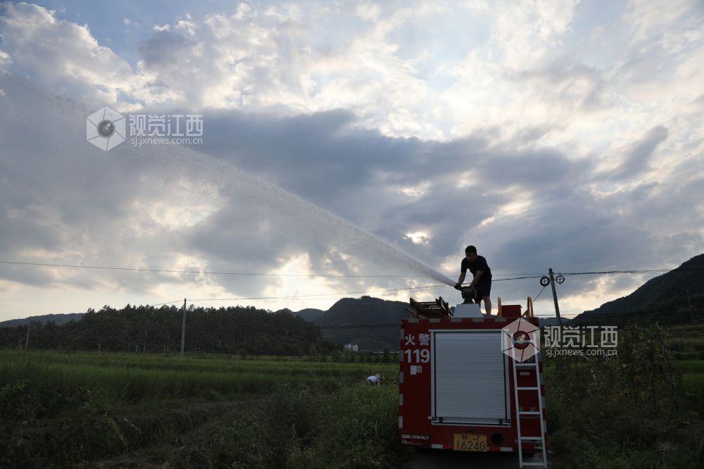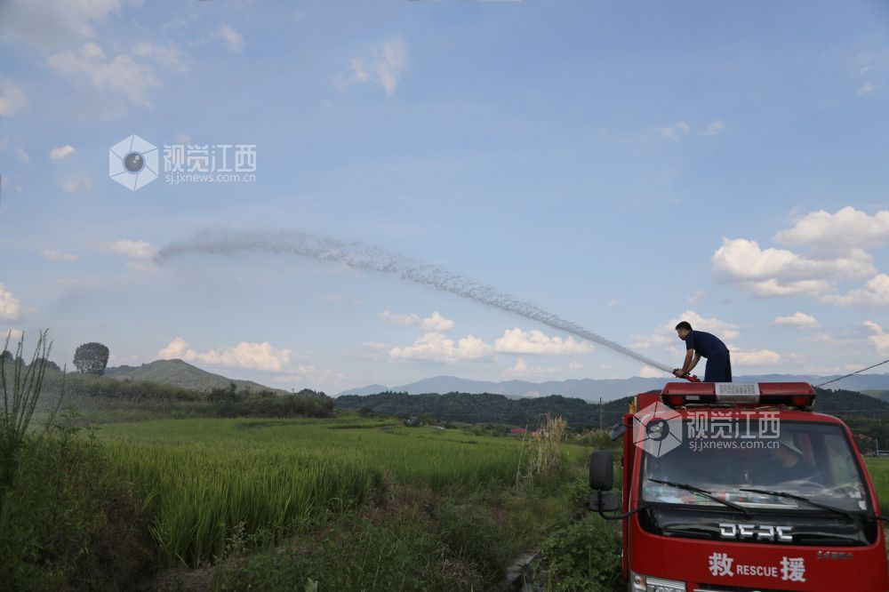 2022年8月19日,江西省莲花县南岭乡塘边村田垄,乡消防站工作人员正在用洒水车运水喷灌干旱的稻田。