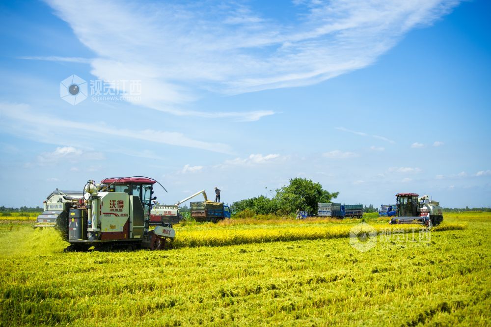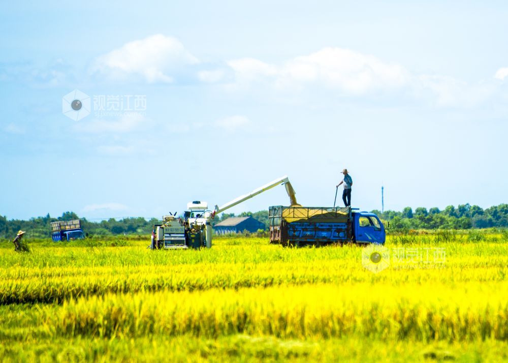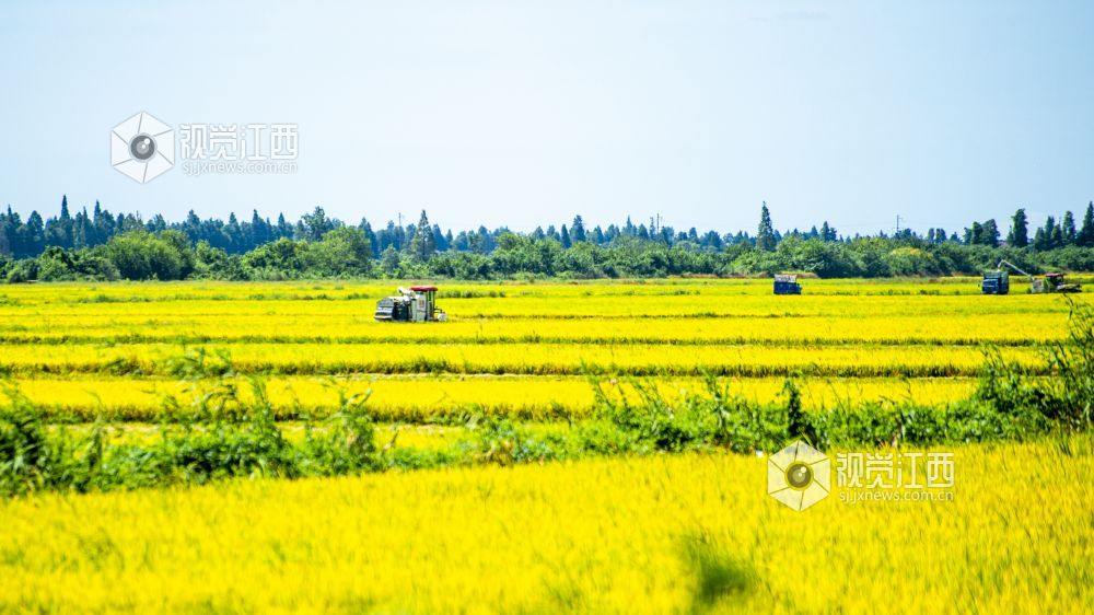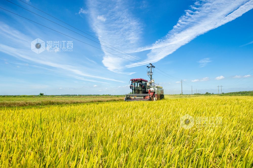 近日,江西省南昌高新区五星垦殖场的万亩良田的早稻成熟了,广袤金黄的稻田里收割机在收割着成熟的再生稻,呈现出一幅“丰”景如画的美丽景色。
