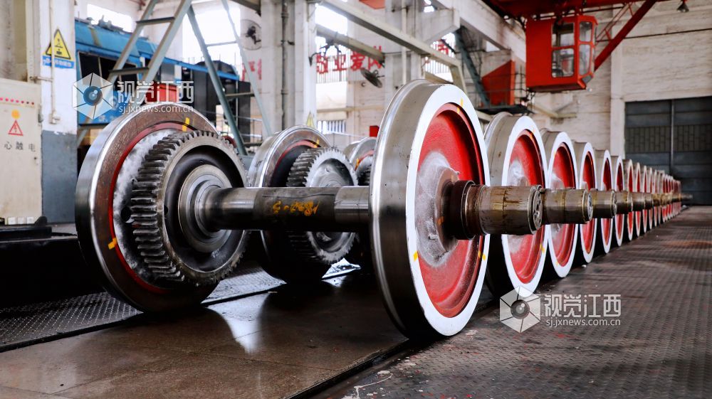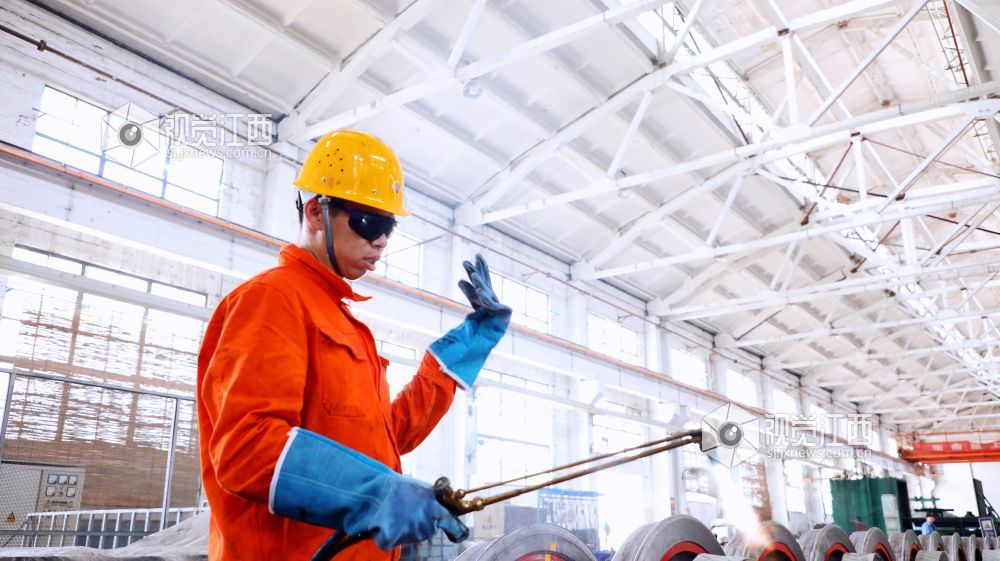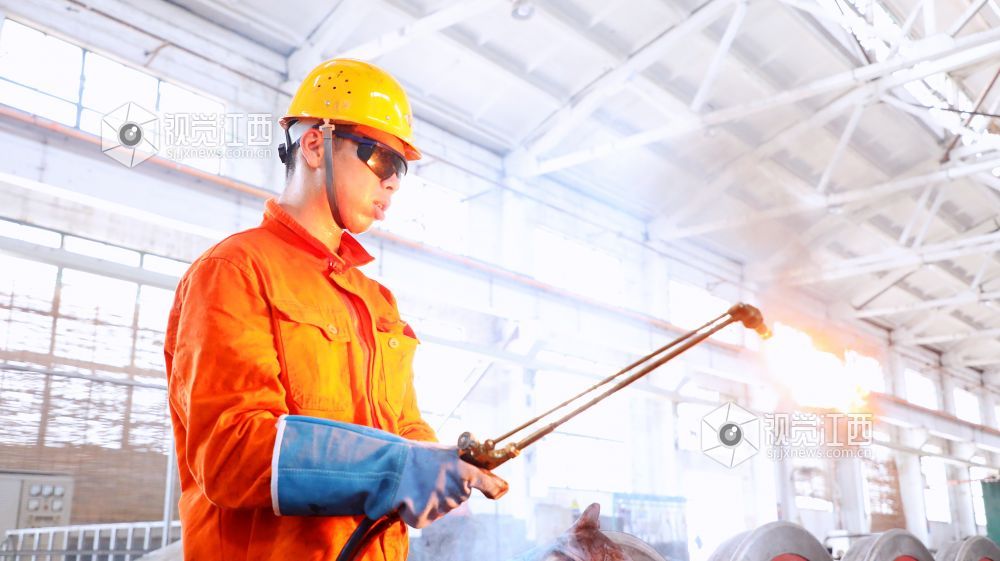 切割轮箍是退箍的第一道工序,黄昆接好氧气、乙炔和割枪的连接管,半蹲在轮对前,用双手托着割枪将氧气、乙炔混合燃烧的高温火焰移至轮箍边缘预热,大约2分钟后,铁质呈现赤红状,黄昆精细调节着割枪阀门,“嘶”的一声,火焰加剧,割枪口喷出约10厘米长的金黄色火焰,火焰触及位置瞬间熔为铁水,产生的火花和熔渣四处飞溅,焊花像烟花一样在轮对四周飞舞。黄昆时而蹲姿、时而侧姿,不停调换着割枪角度,精准操控着割枪,红色火焰顺着轮箍扣环向下慢慢切割,1组轮对、2组轮对……经过一个多小时的切割作业,8组轮对顺利切割完成。收起隐隐冒着热气的割枪、摘下墨镜,汗水不断从黄昆通红的脸上滑落,身上橘红色的工作服被汗水浸透。