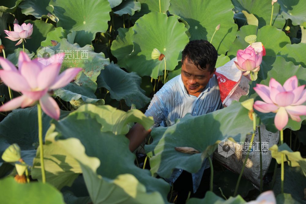 8月24日,在江西省莲花县升坊镇升坊村麻石垅,村民正在采收莲蓬。