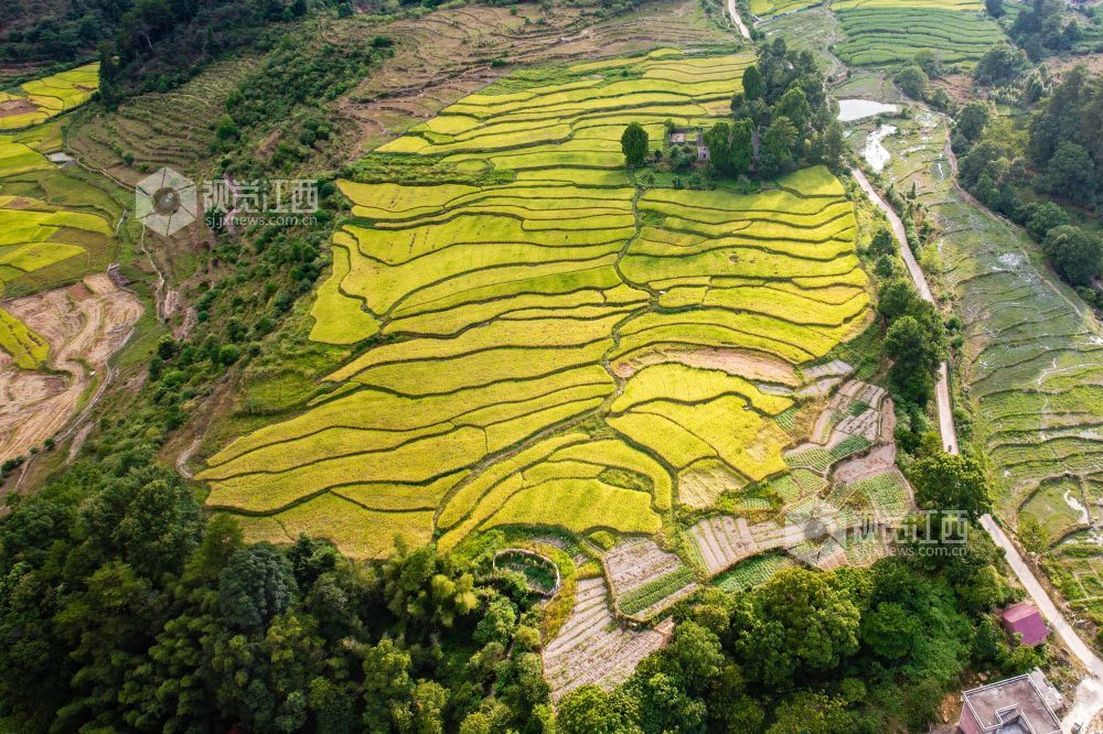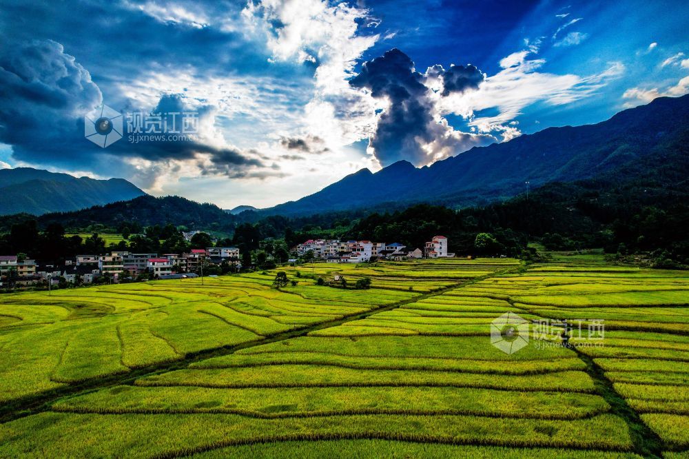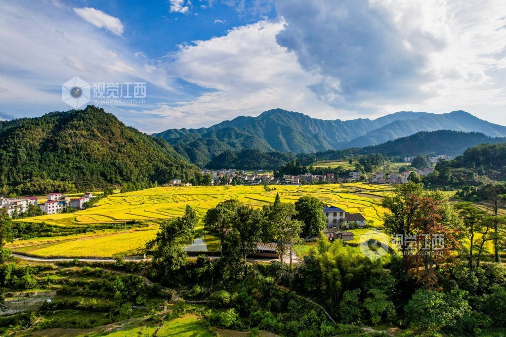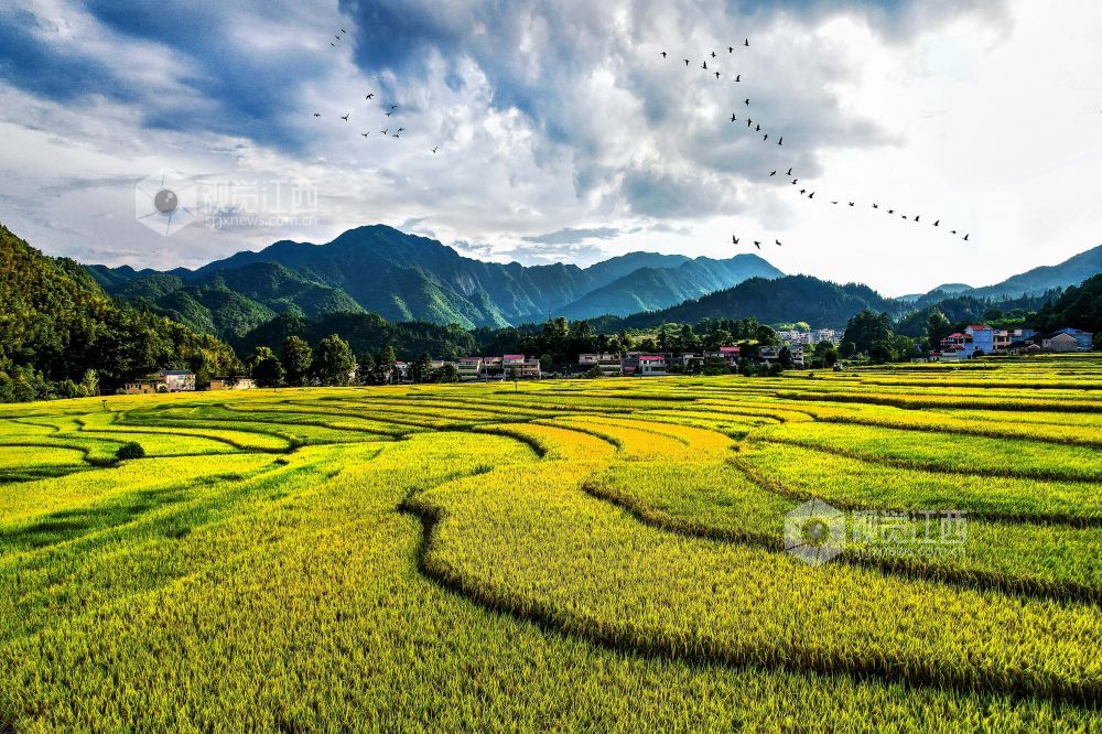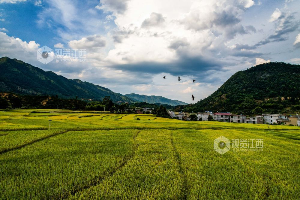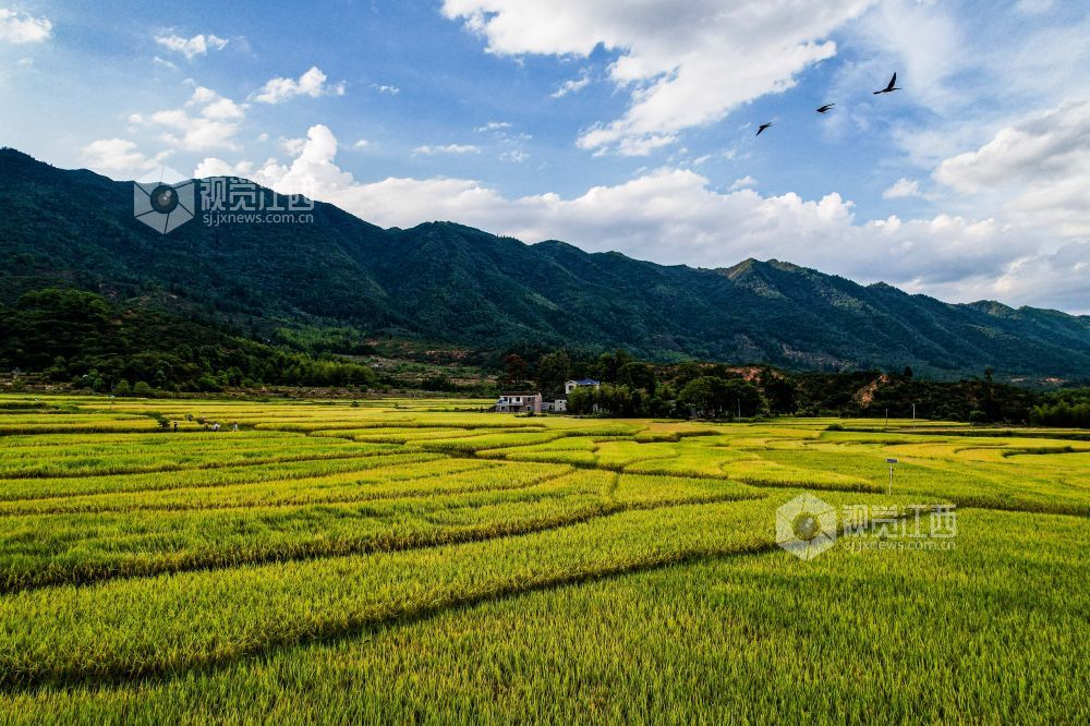 8月28日,从空中俯瞰江西省永新县曲白乡上坪村,起伏的青山、金黄的稻田、飞翔的鹭鸟与红瓦白墙的村庄相映成趣,构成一幅欣欣向荣、生态宜居的生态田园画卷。