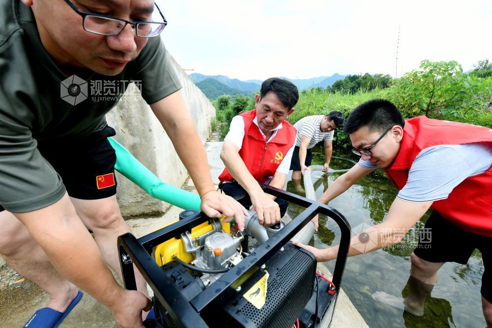 2022年8月28日,江西省德兴市泗洲镇村镇两级党员干部正在该镇潭埠村利用水泵抽水为干枯的稻田浇灌“解渴”。