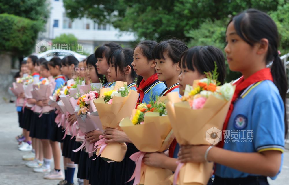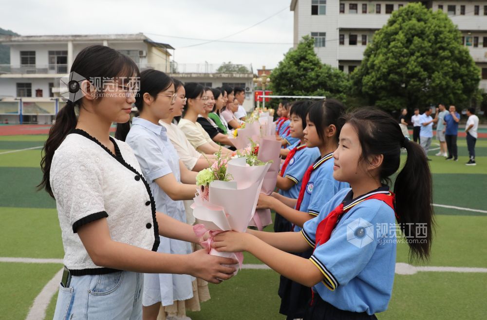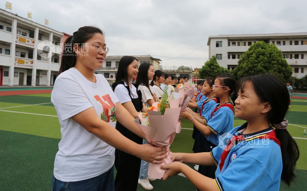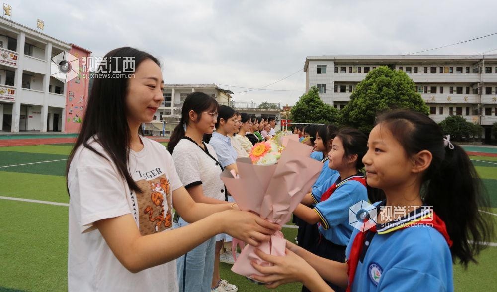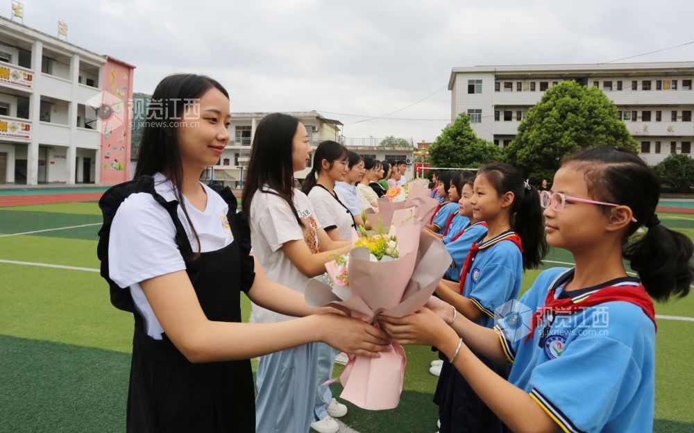 2022年9月1日,开学第一天,江西省瑞昌市南义镇中心小学学生将鲜花献给刚刚踏上教师岗位的17位新老师,表达他们对老师的祝福,让老师们感受到从事教师职业的幸福。