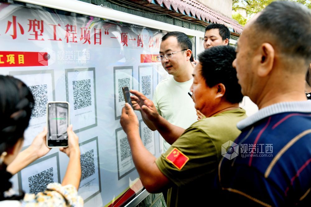2022年9月2日,江西省德兴市香屯街道香屯村村民正在用手机扫描项目的二维码,了解本村正在实施项目的相关信息。