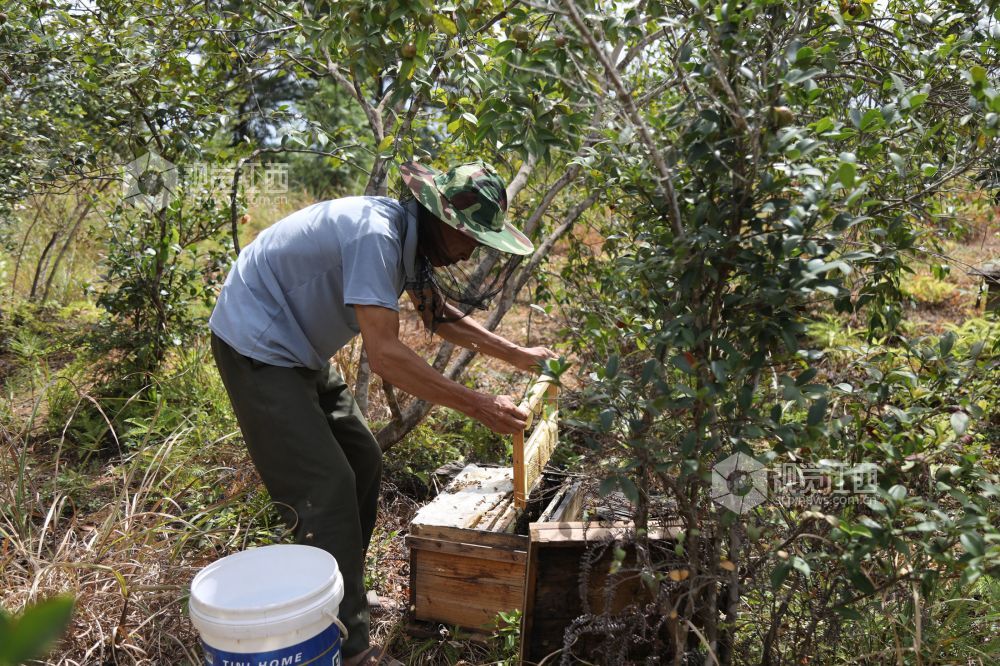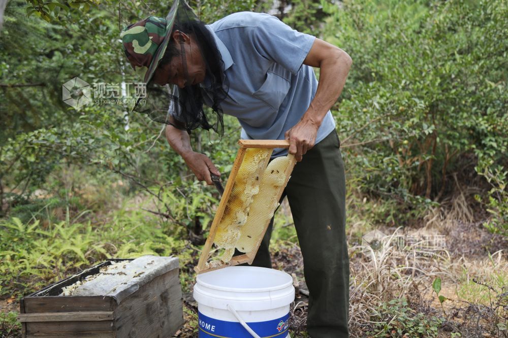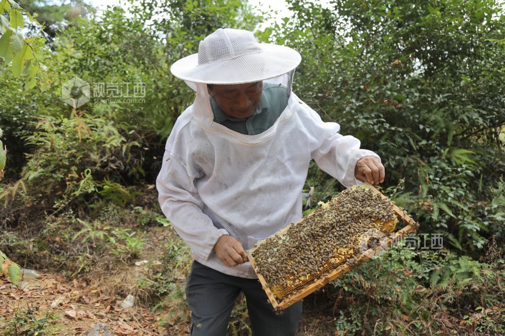 9月8日,江西省莲花县闪石乡井屋村村民正在查看蜂箱,采割蜂蜜。
