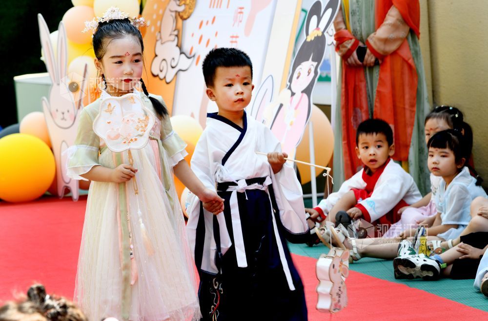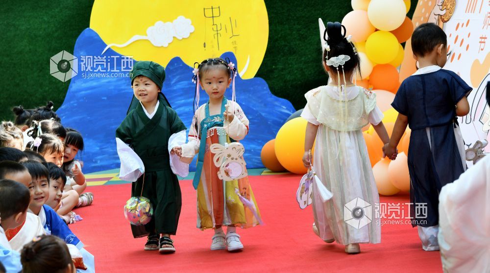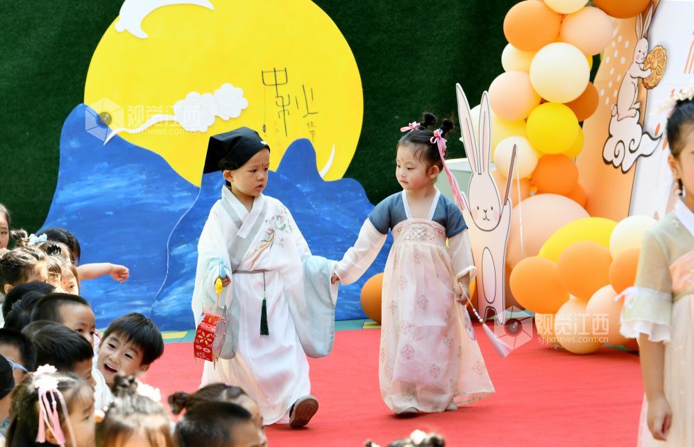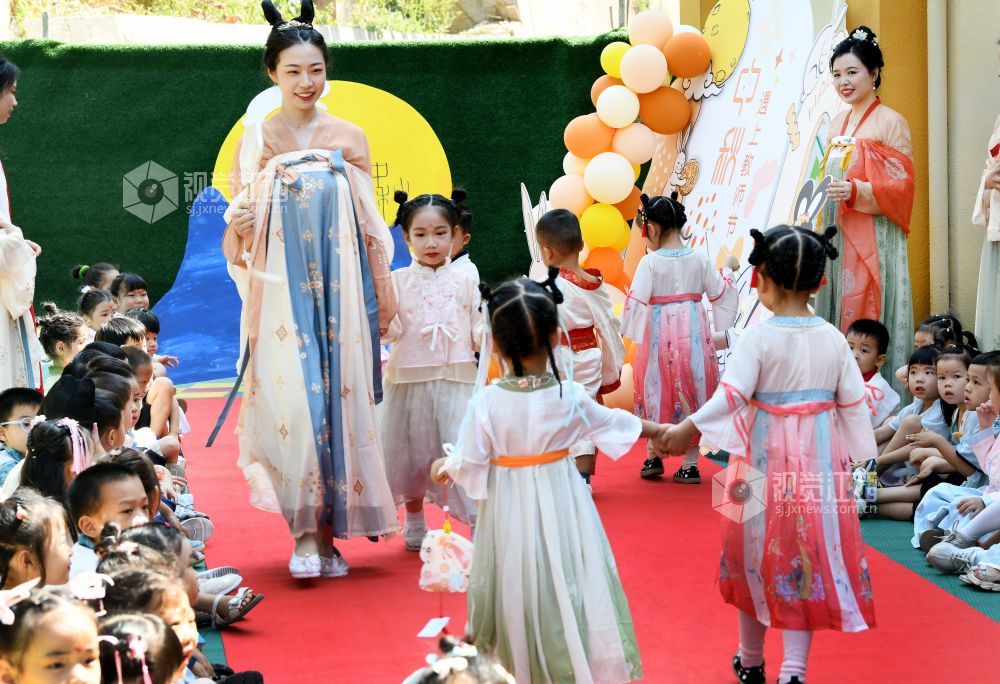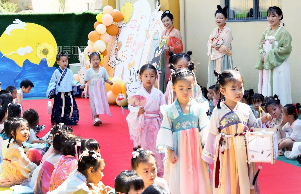 2022年9月9日,江西省德兴市城南幼儿园的小朋友开心走红毯、秀汉服,喜迎中秋佳节的到来。
