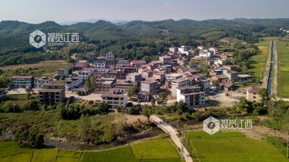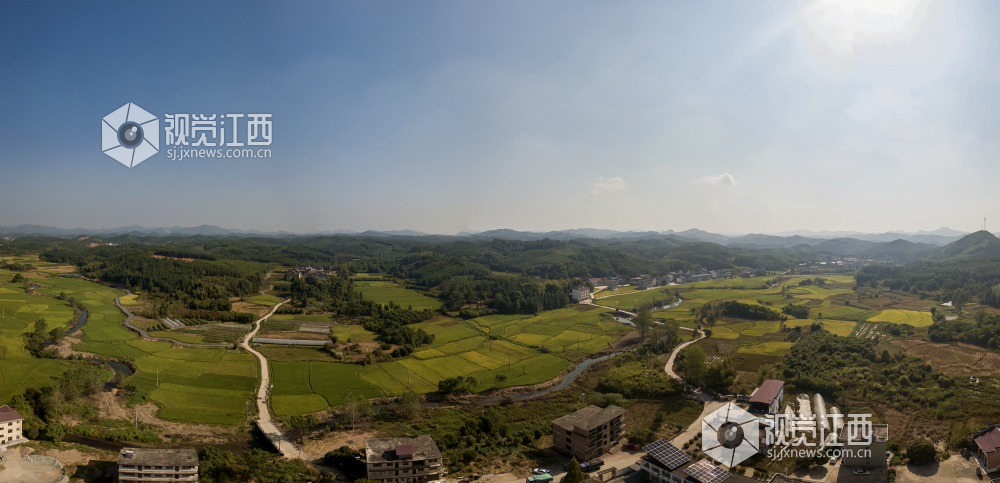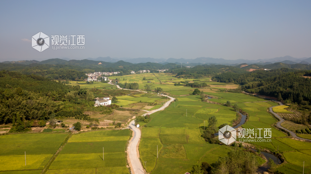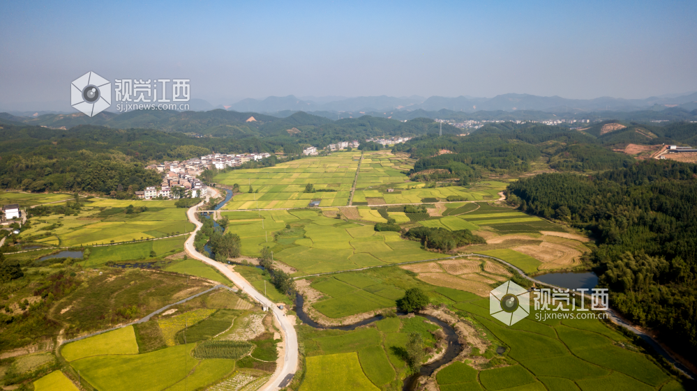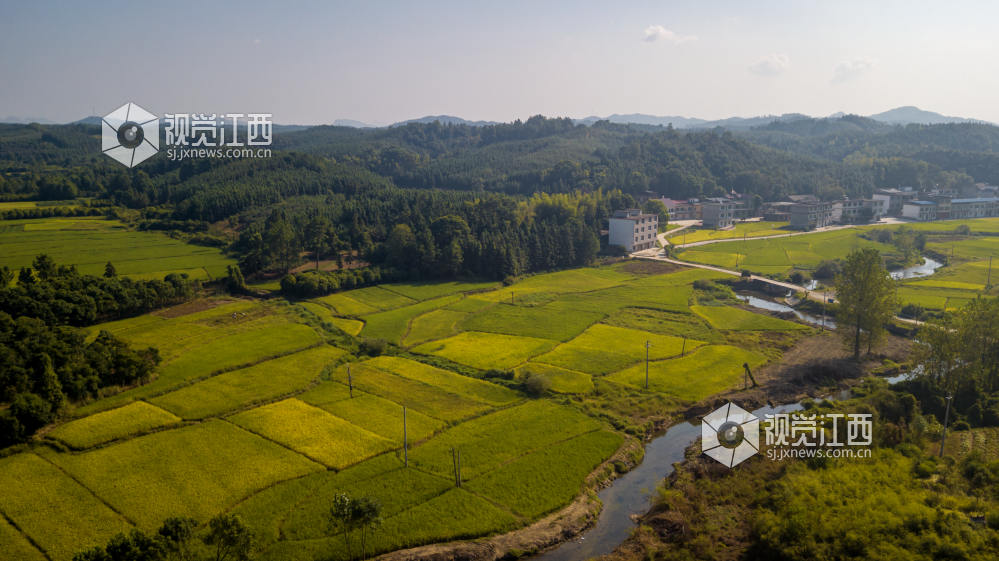 金秋时节,稻花飘香,2022年9月15日,俯瞰江西省分宜县洋江镇前江村,金黄的稻田与青山、民居相映成趣,构成了一幅美丽的乡村秋日田园画卷。