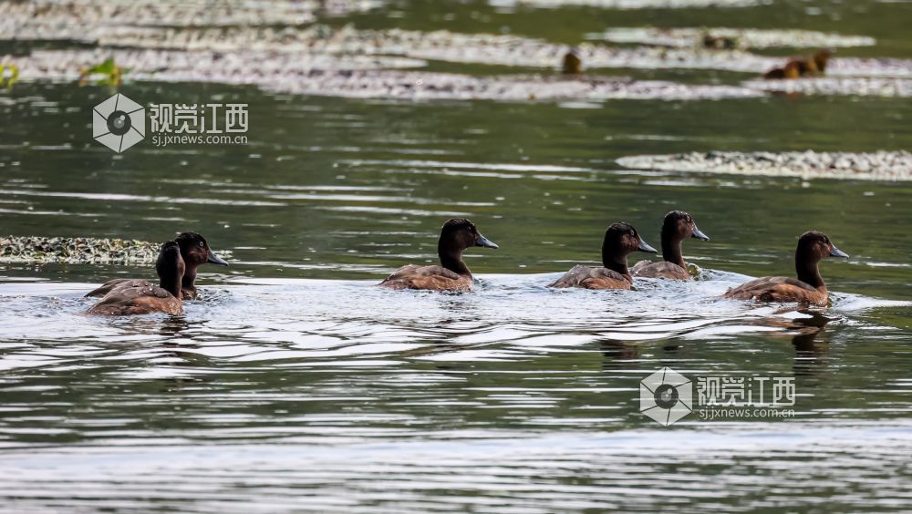 2022年9月26日,江西省瑞昌市安定湖省级湿地公园,几只青头潜鸭雏鸟在水面上游弋嬉戏。
