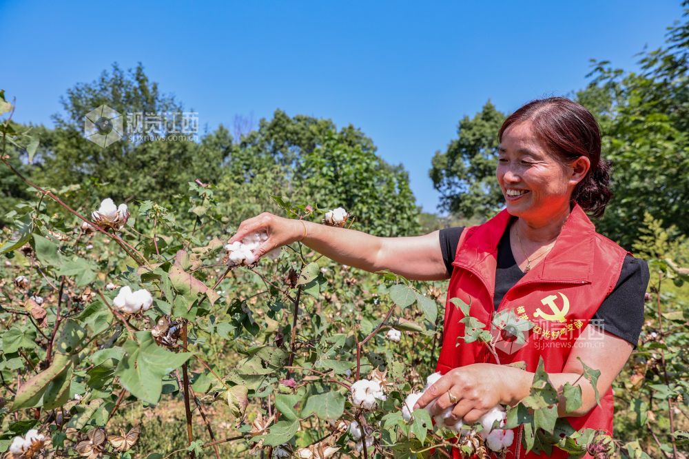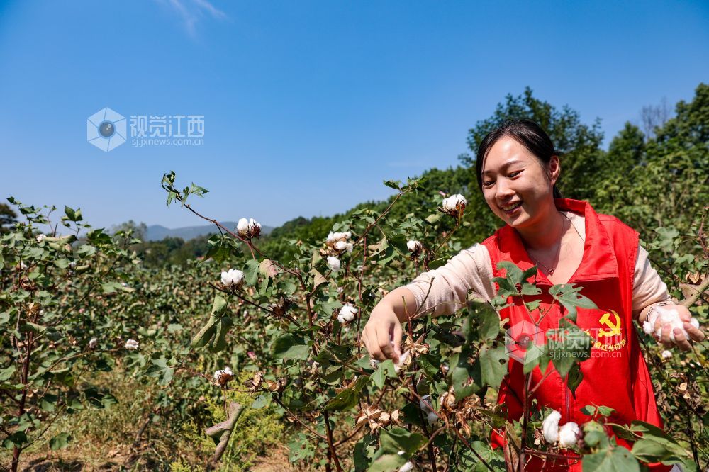 2022年9月27日,江西省瑞昌市横港镇红光村村集体经济棉花种植基地,党员志愿者正在采摘棉花。