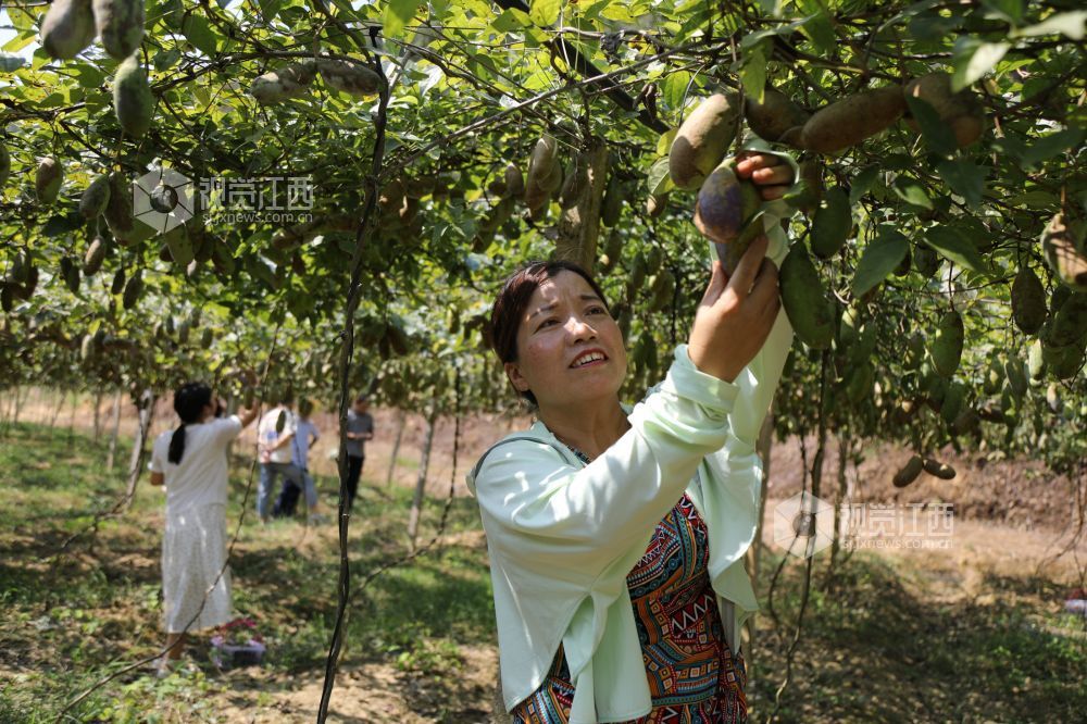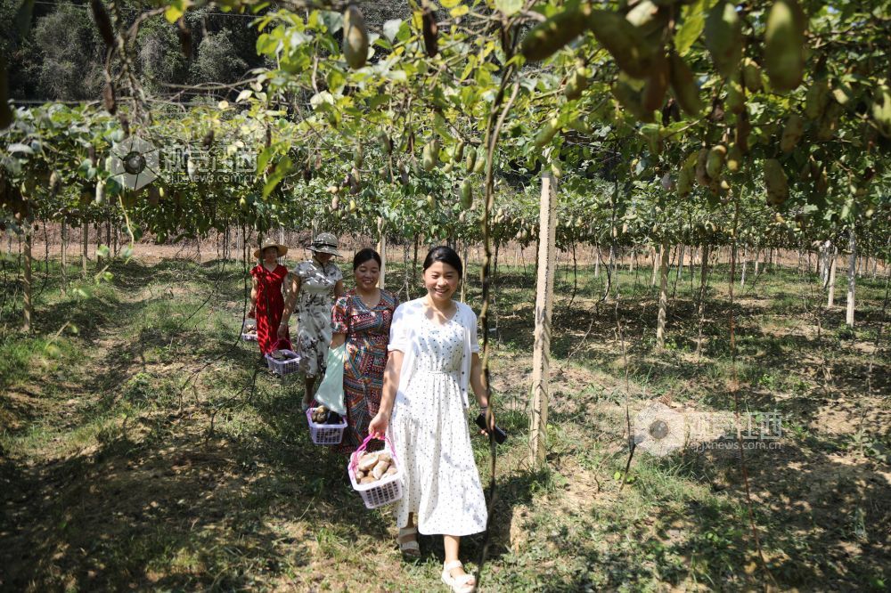9月30日,江西省莲花县荷塘乡文塘村八月瓜种植基地,一排排整齐搭建的铁丝网架上密密麻麻爬满了藤蔓,藤蔓下结满了一串串,一堆堆的八月瓜,成熟的八月瓜炸开了一条大口,胖乎乎白糯糯的果肉暴露在空气中,飘出诱人的果香,令人垂涎欲滴。游客穿梭其间,开心采摘。