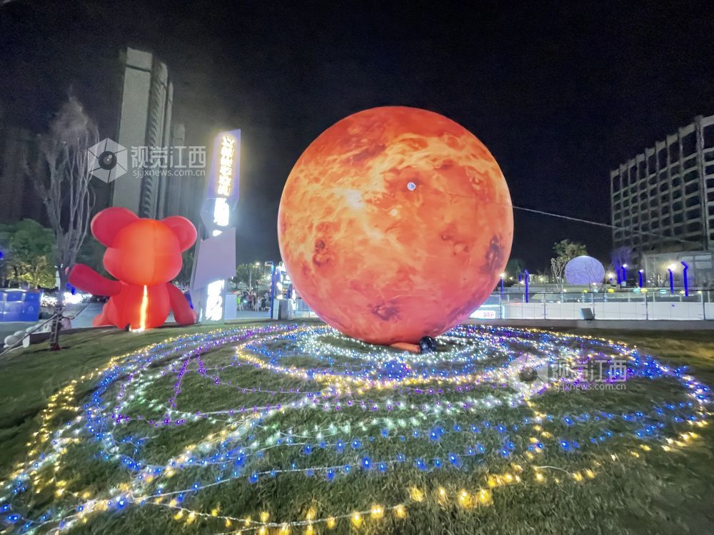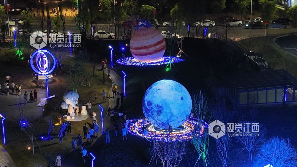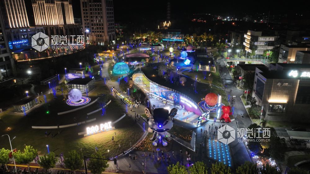 街区位于上饶高铁经济试验区文创共享空间,街区以四季为画轴,以上饶文化为底色,呈现了“数字、生活、打卡、流量、年轻”五大元素的精美画卷,营造出宇宙世界的梦幻感与科技感。这是2022年10月2日在江西省上饶高铁经济试验区拍摄的一组画面。
