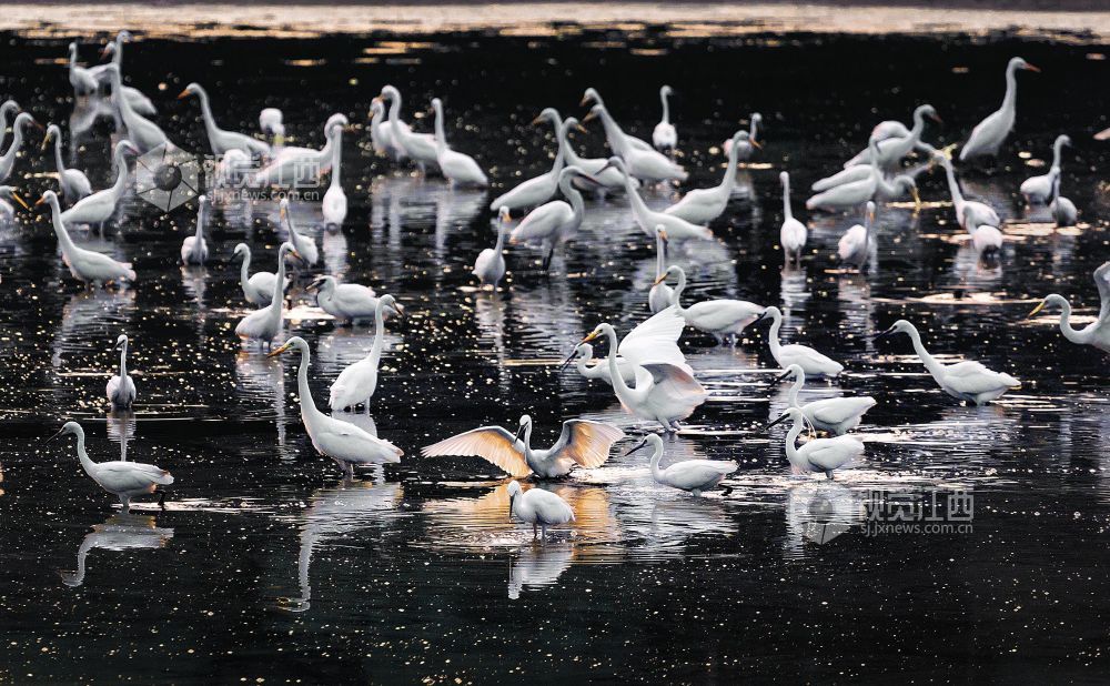 10月1日,江西省永新县台岭乡程家村出现数百只白鹭群聚嬉戏的壮观景象。成群结队的白鹭时而掠水飞翔,翩翩起舞,时而展翅空中引颈欢歌吟唱,成为了乡村一道靓丽风景。