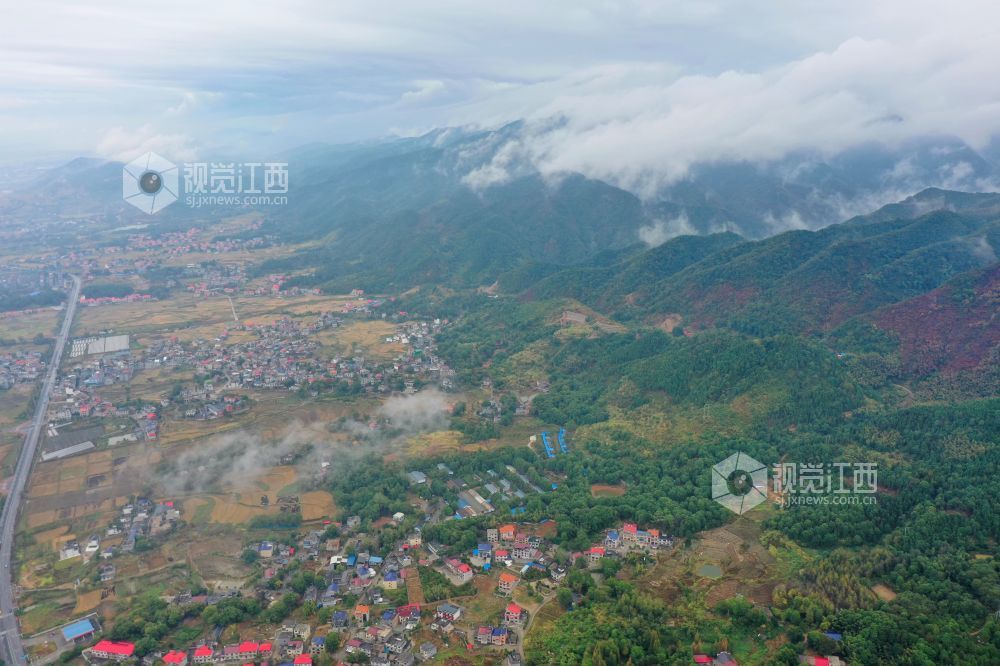 2022年10月9日,秋雨过后,俯瞰江西省萍乡市芦溪县芦溪镇云雾缭绕,山间白云与村道、民居、田园等相映成趣,构成一幅清新靓丽的山村画卷。