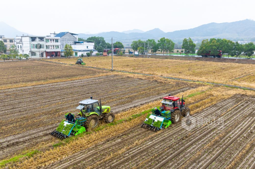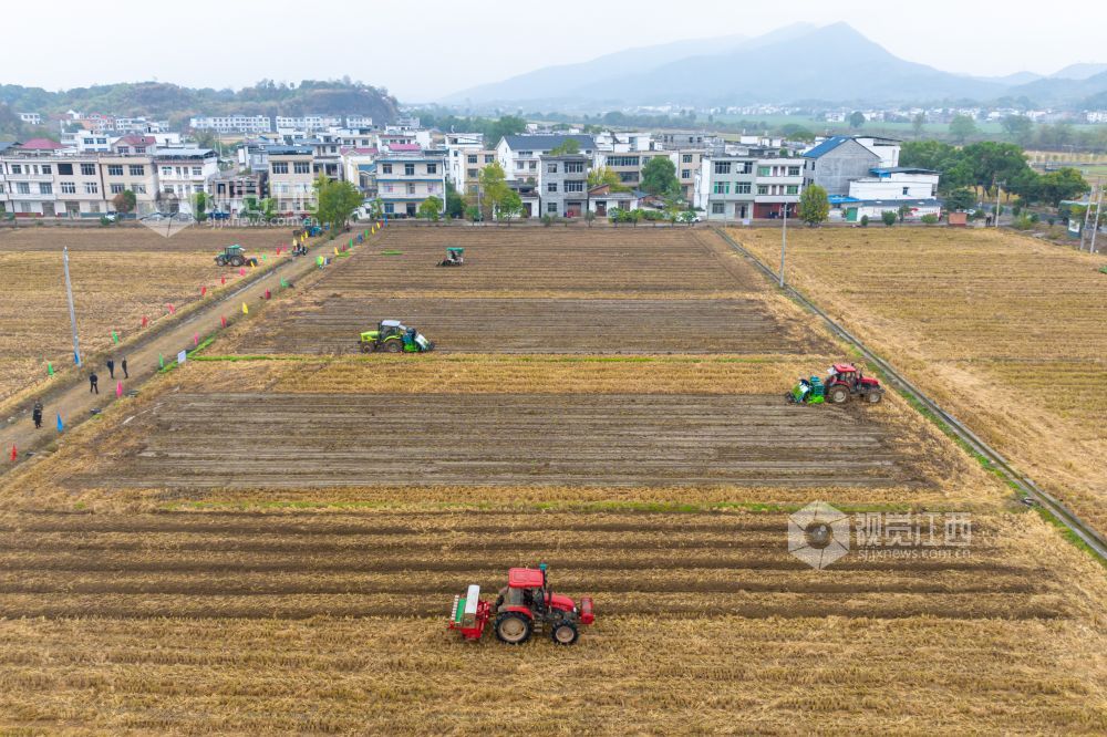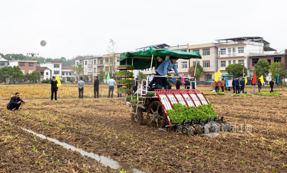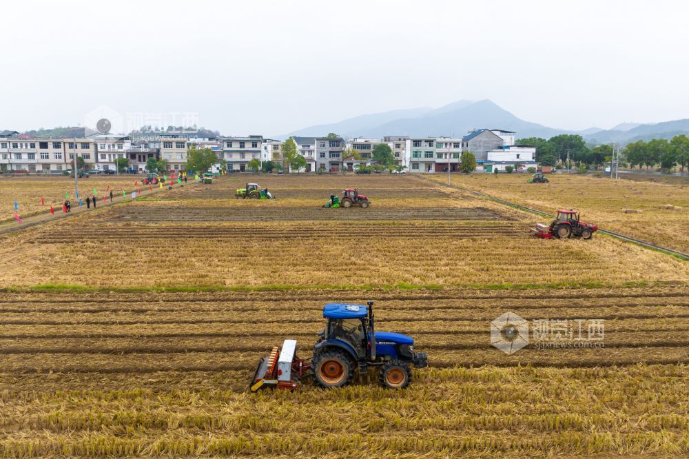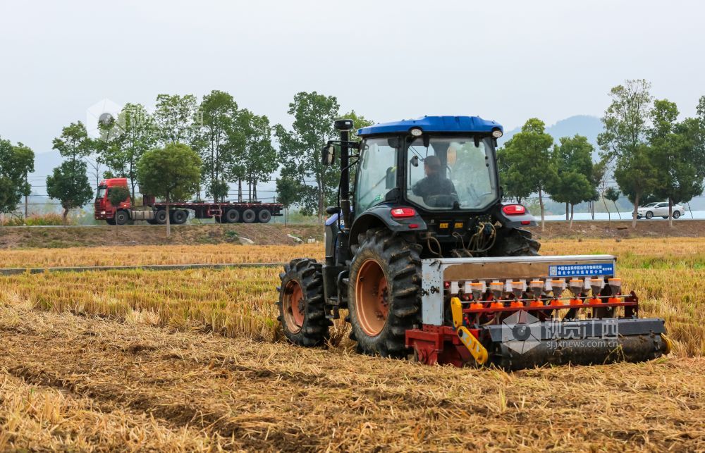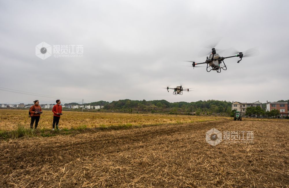 2022年10月27日,江西省九江市瑞昌市范镇源源村,九江市农业冬种推进会现场,农机手在操作无人机和大型机械助力油菜播种。