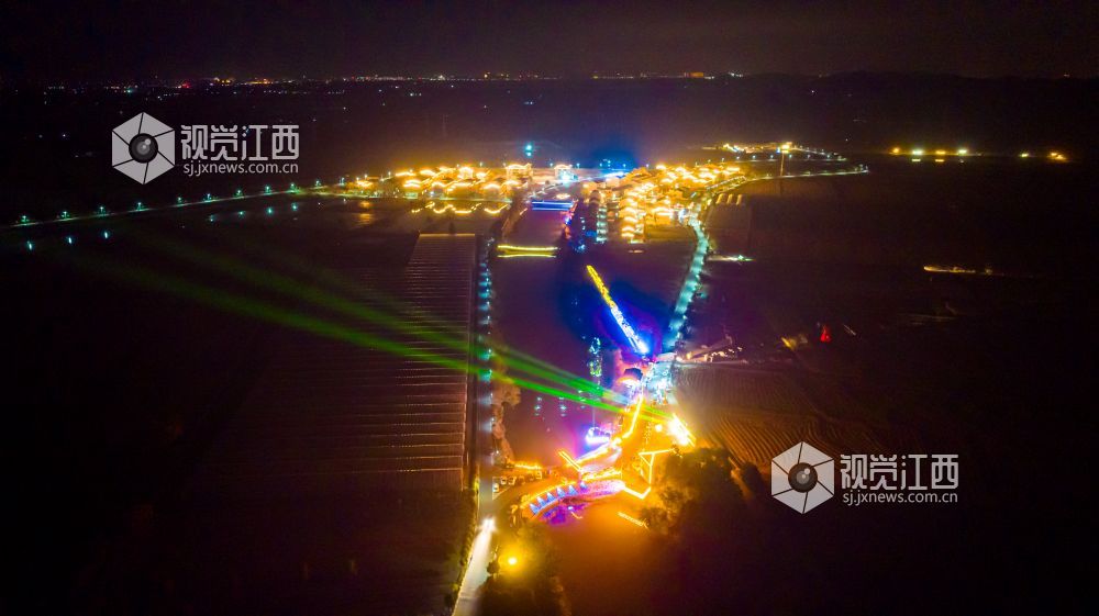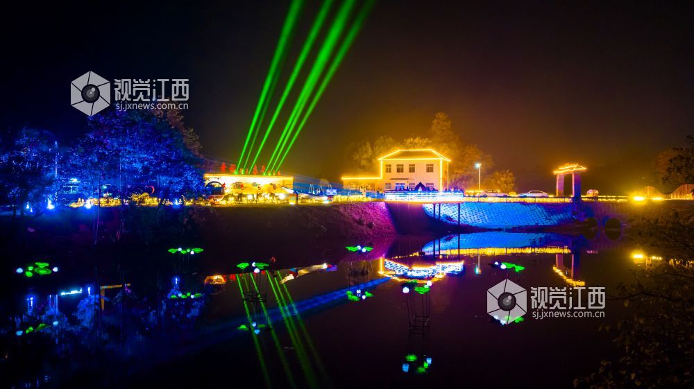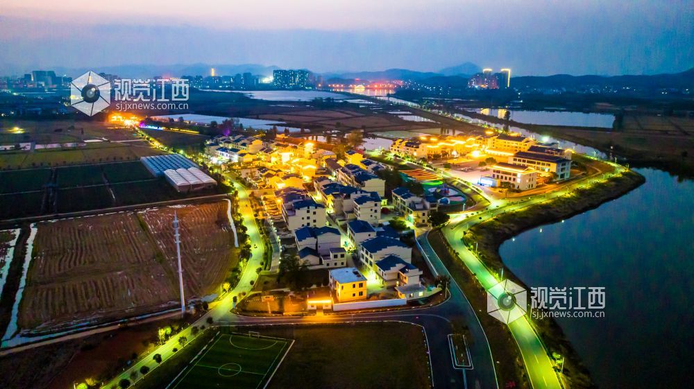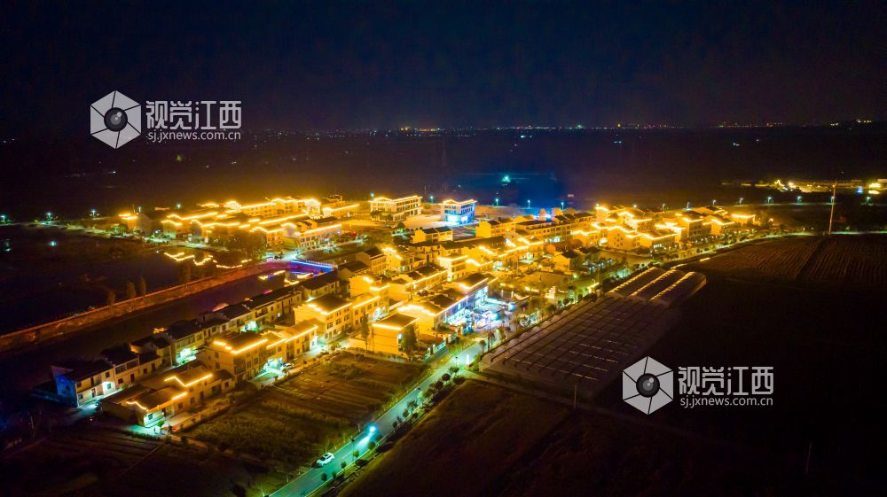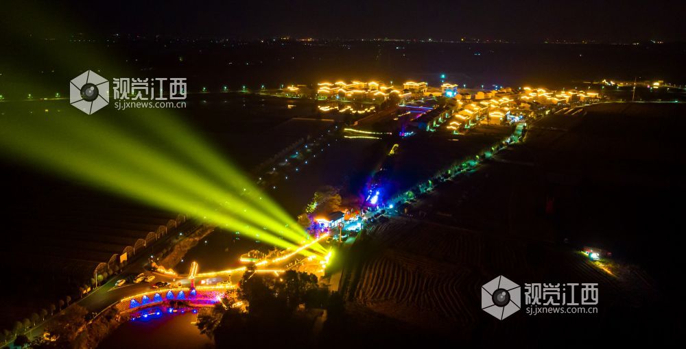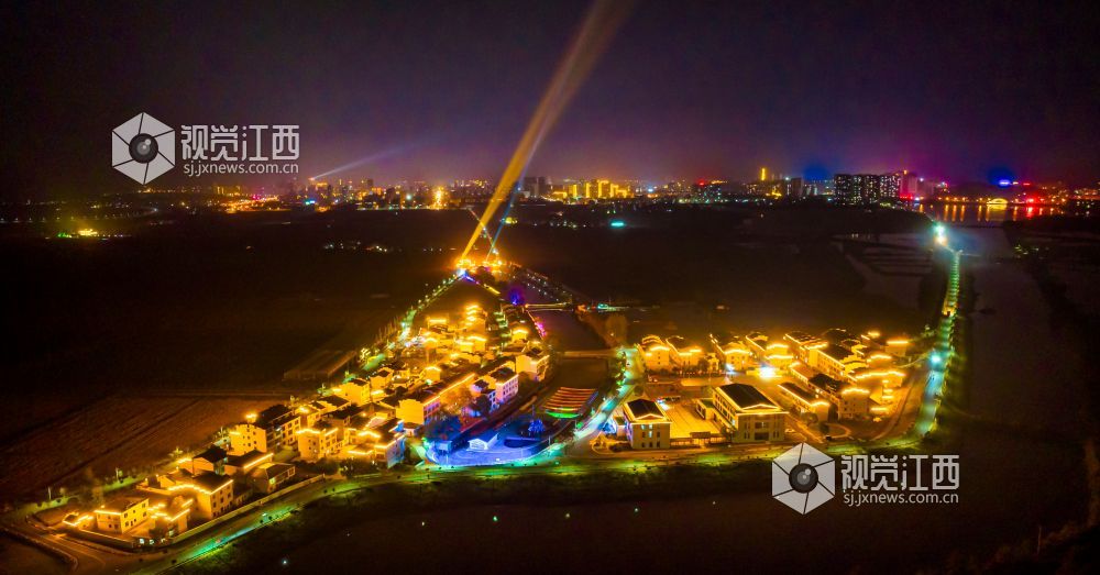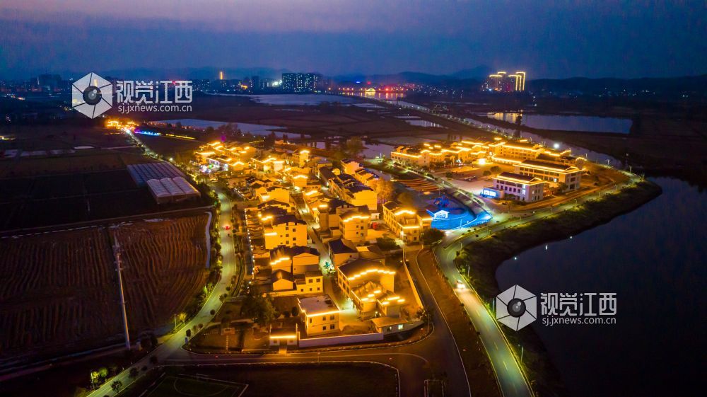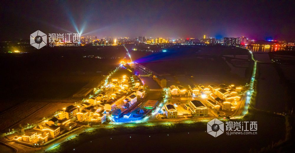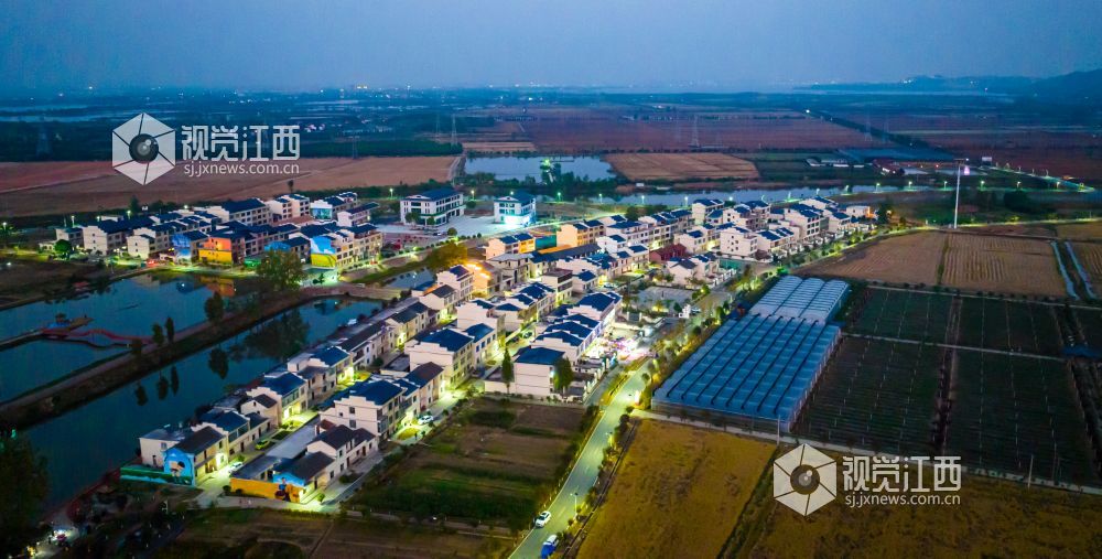2022年10月30日,江西省瑞昌市赛湖农场螺蛳港新村流光溢彩,夜色迷人。