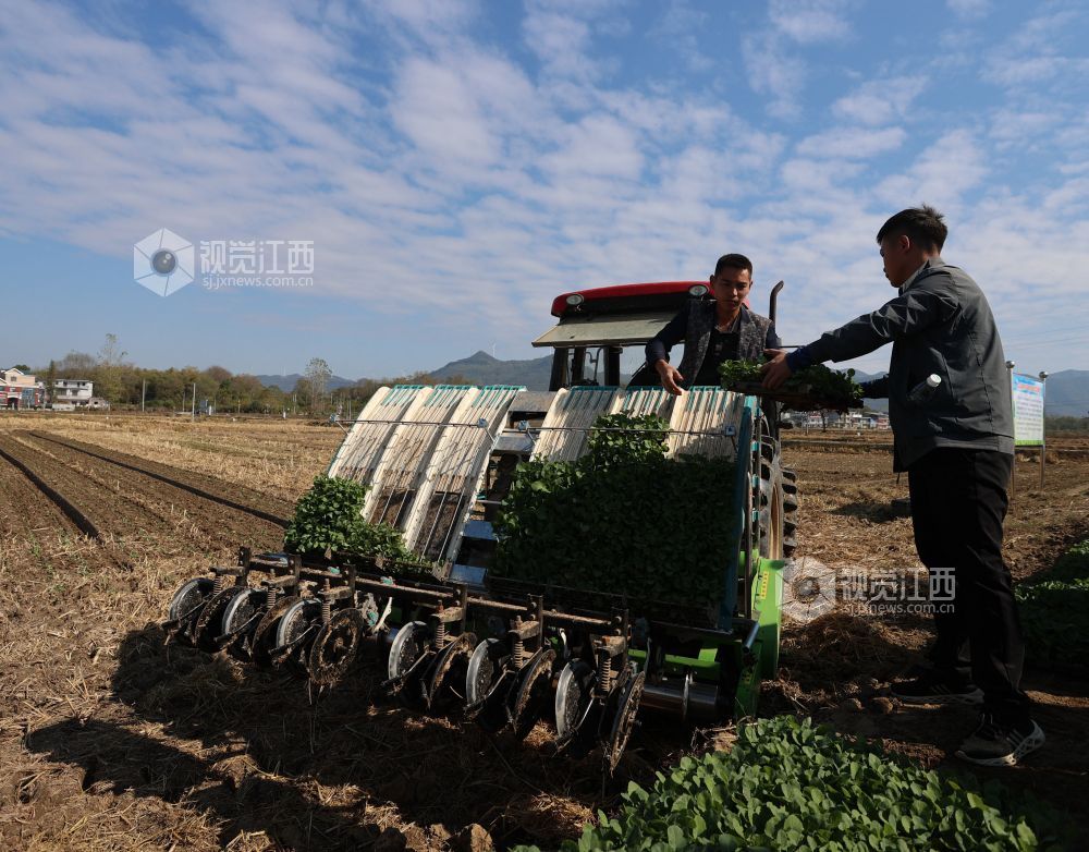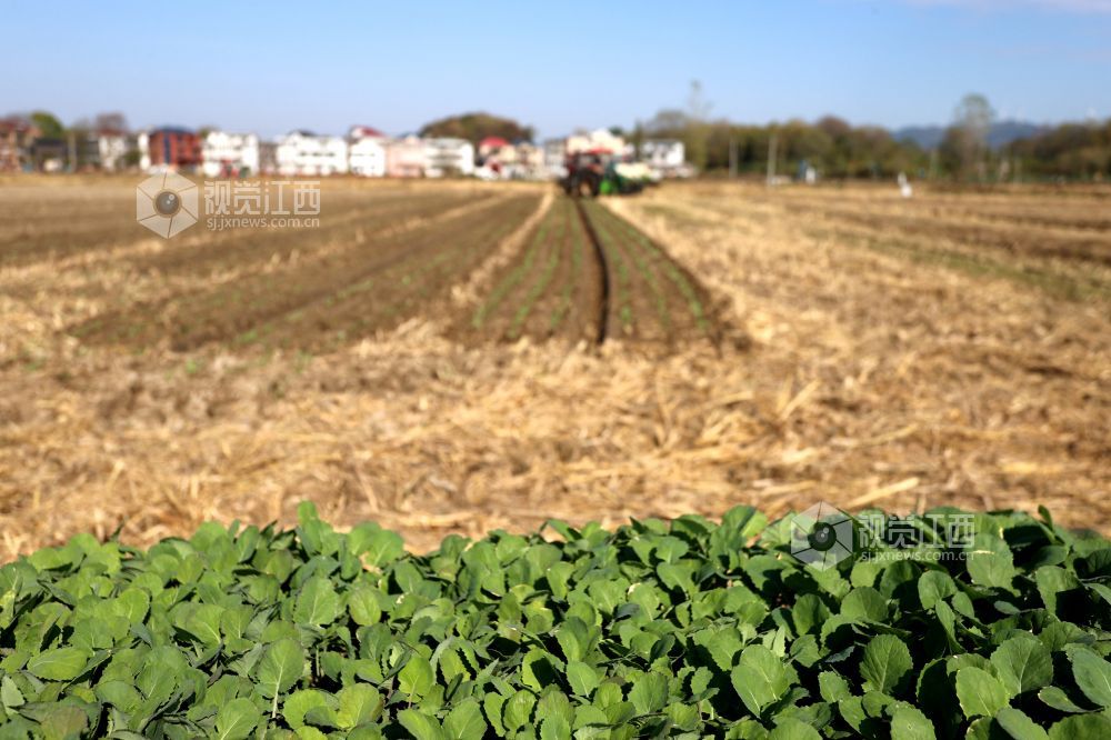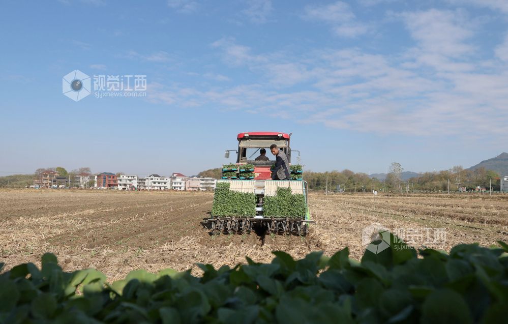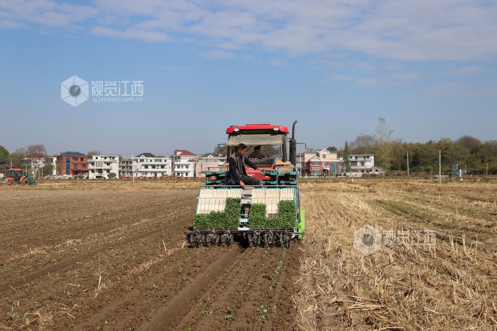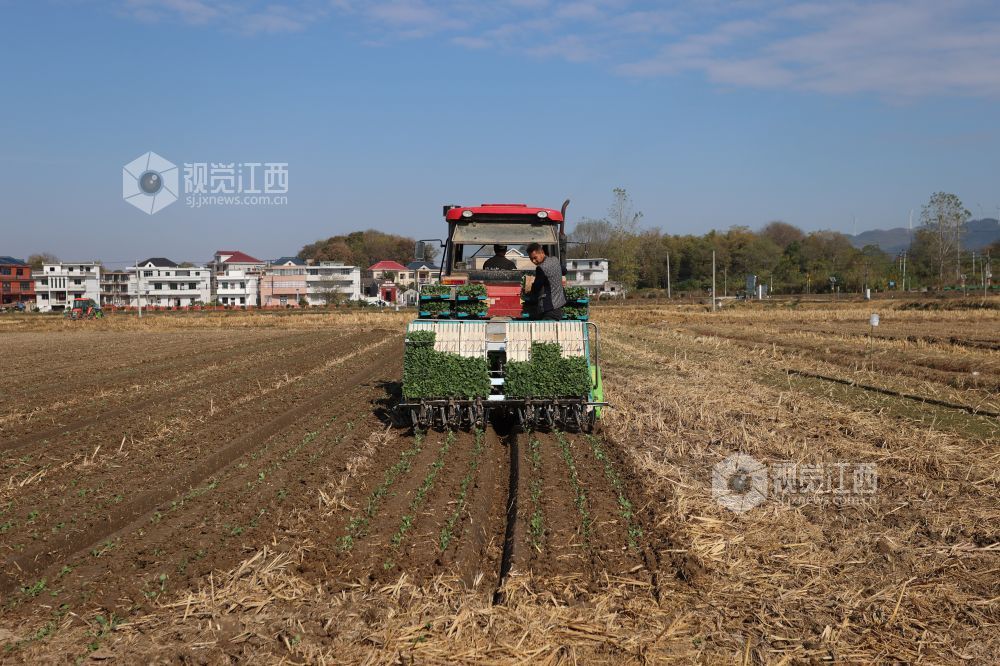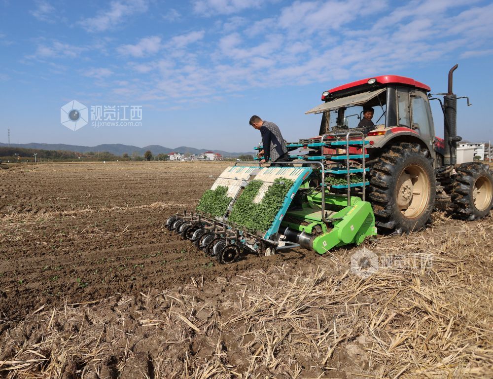 2022年11月6日,在江西省九江市湖口县武山镇武前村万亩稻油轮作示范基地,农户正用机械将油菜苗培育成机插水稻一样的毯状苗进行移栽,助力油菜种植高效完成。