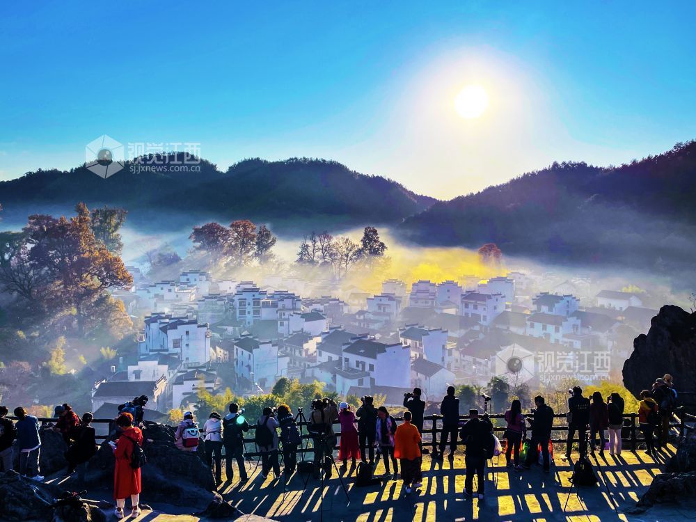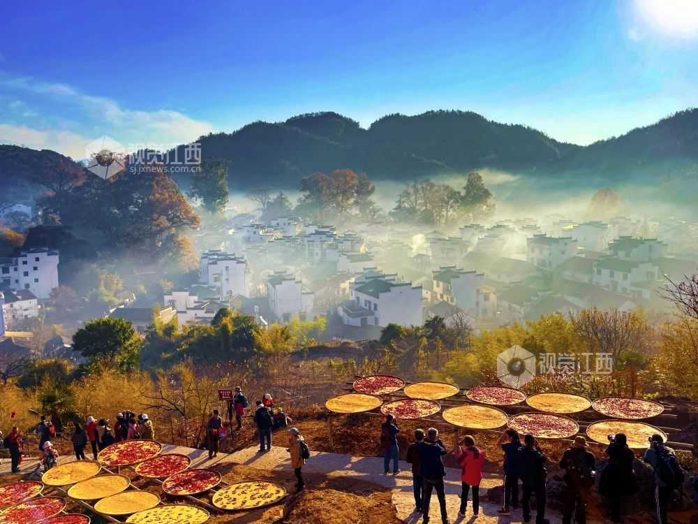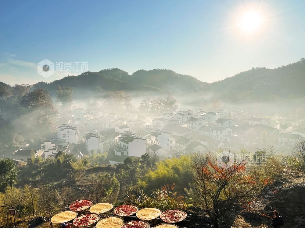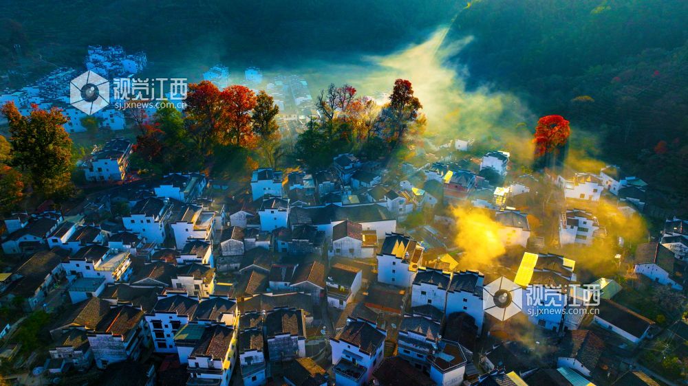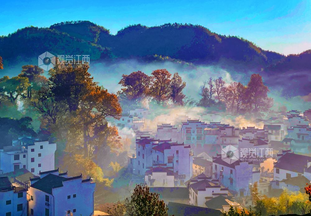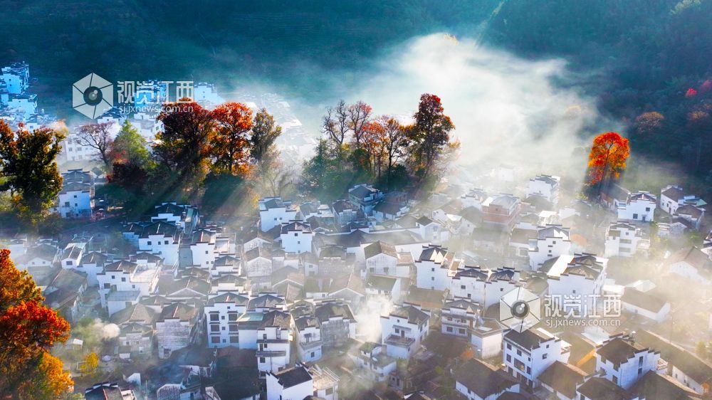 2022年11月12日清晨,江西省婺源县大鄣乡石城红枫叶景区烟波缥缈,如诗如画。红红的枫叶,徽派古民居,村民晒秋民俗,吸引了不少中外游客及摄影爱好者。