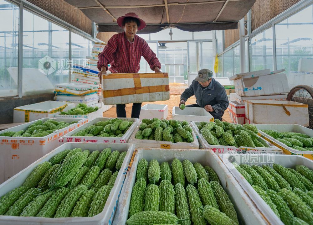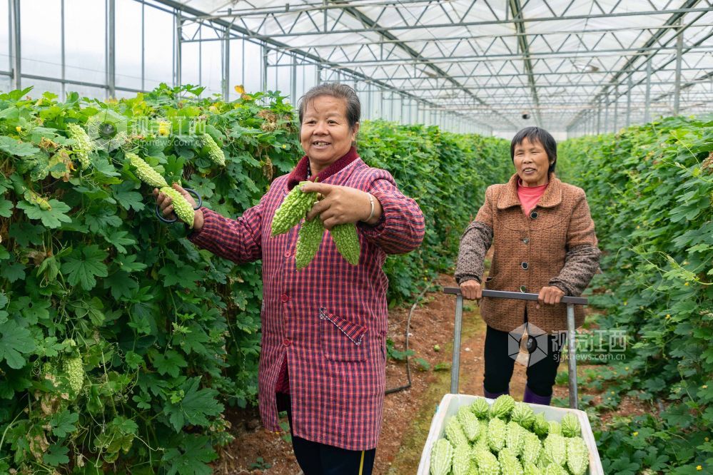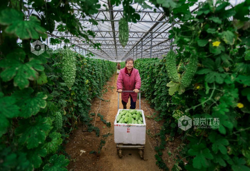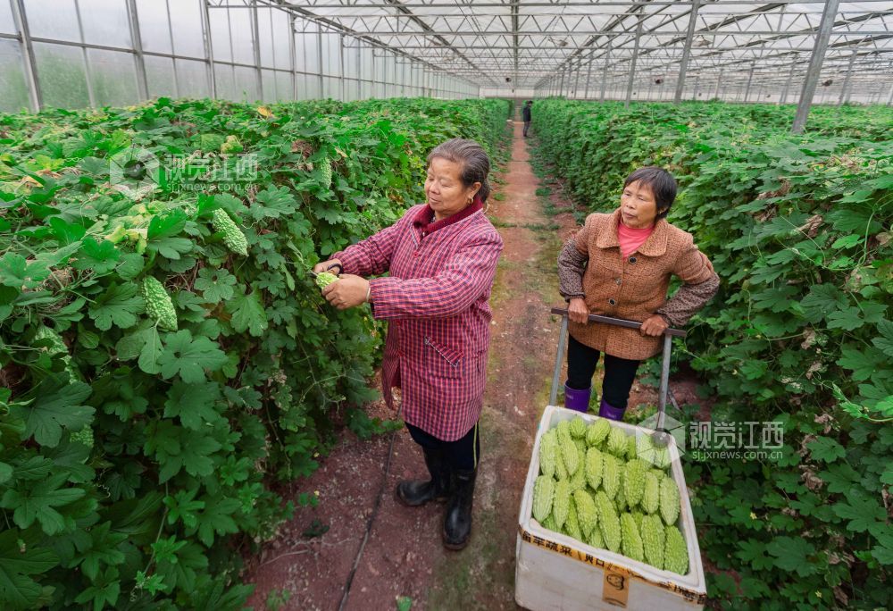 11月15日,江西省永新县农业科技示范园蔬菜种植基地,一派热火朝天的景象,菜农们正忙着采摘苦瓜、辣椒等蔬菜,供应市场。