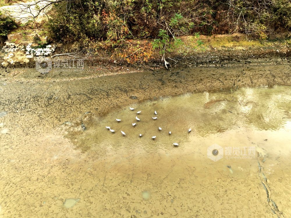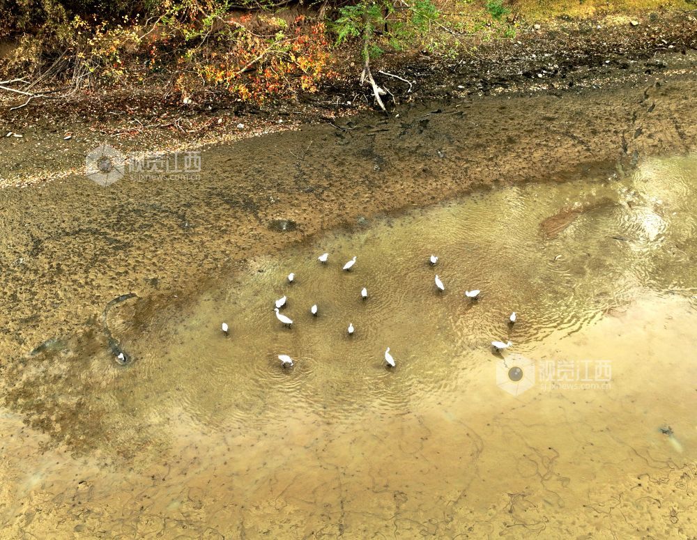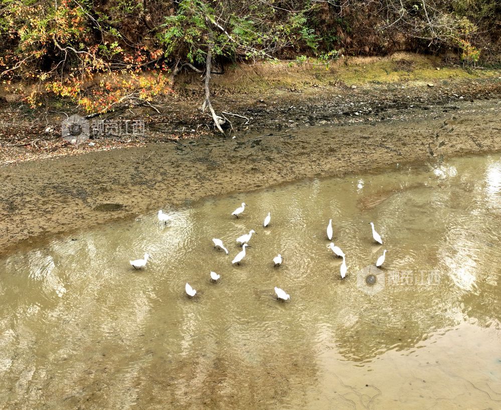 2022年11月15日,江西省九江市湖口县,成群的白鹭聚集在水塘浅水处,悠闲地在水中觅食、嬉戏,构成了一幅美丽自然生态画卷。