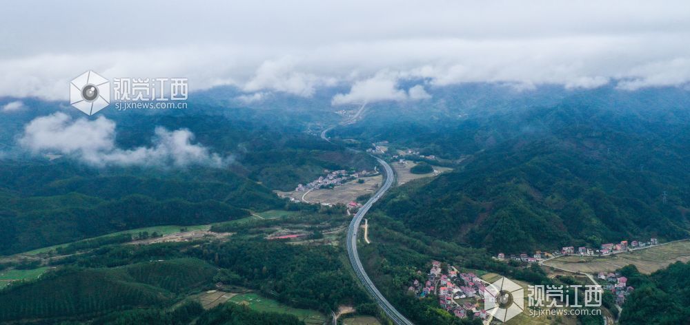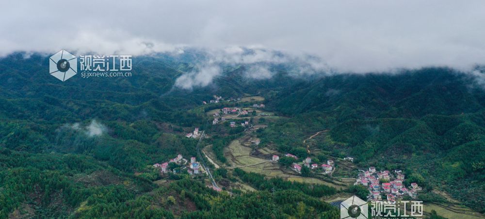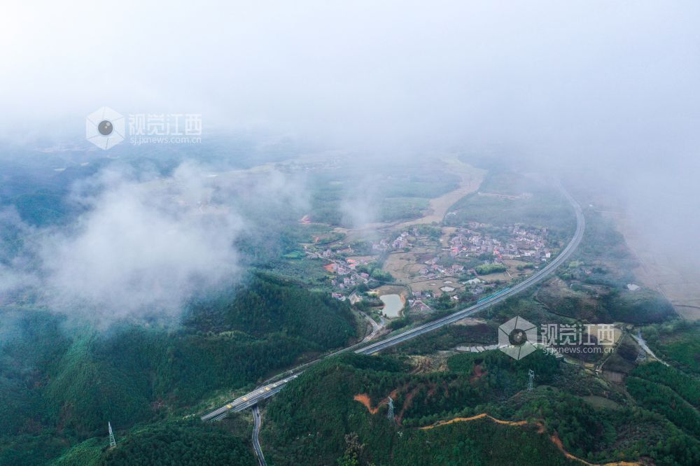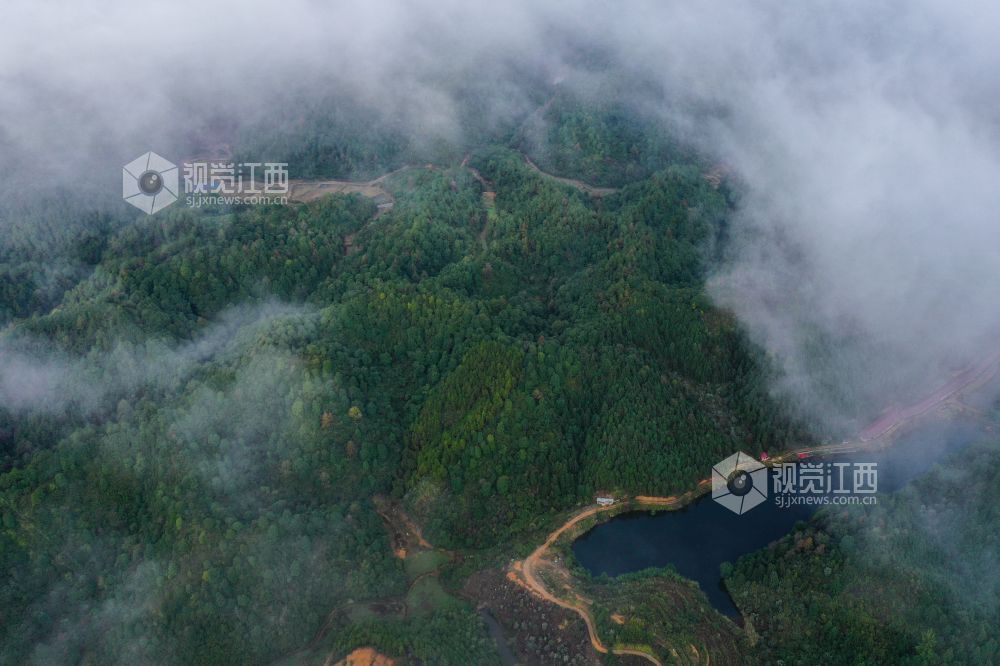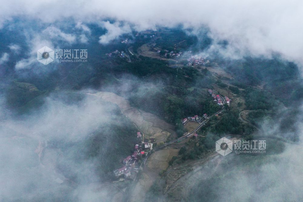 11月17日,在经历了连续的干旱过后,江西省泰和县中龙乡迎来一场细雨,雨后的中龙乡云雾缭绕,从空中俯瞰,好似人间仙境。