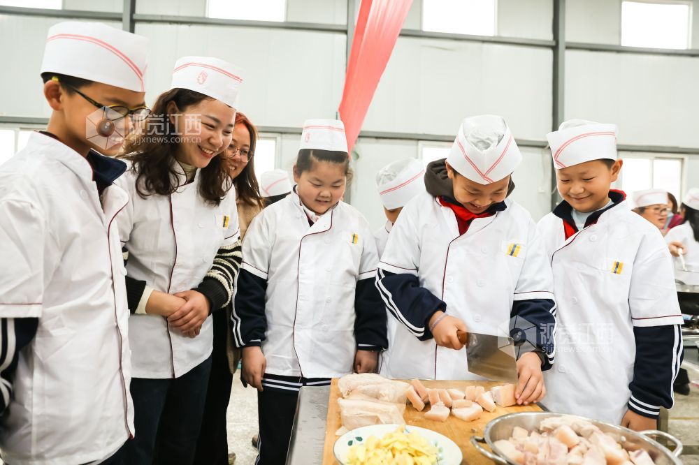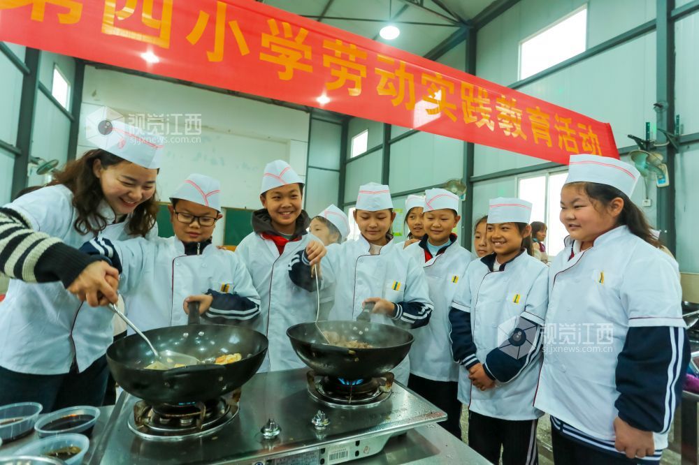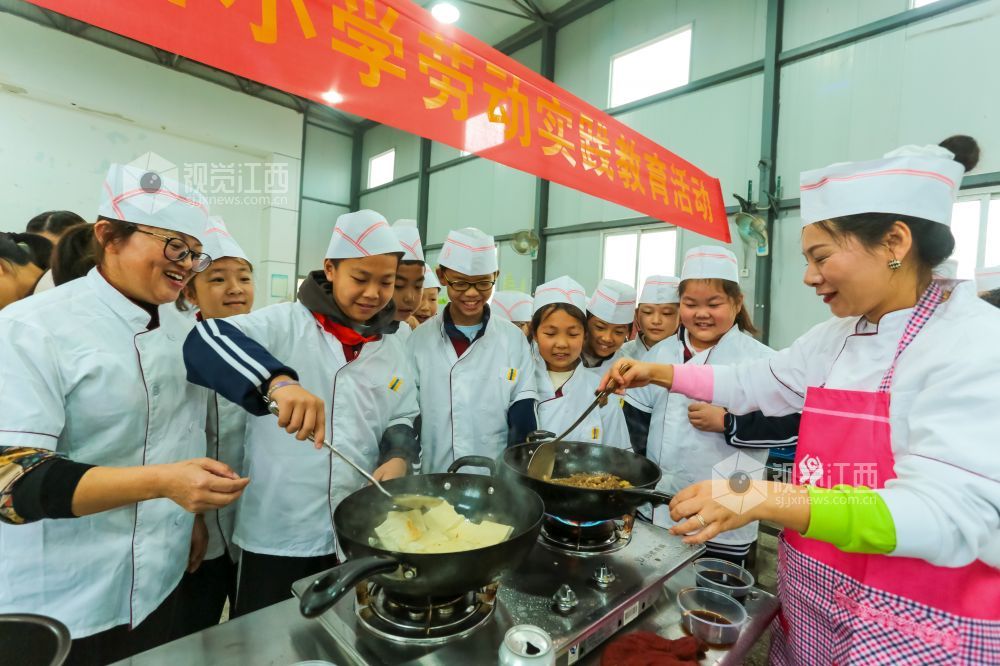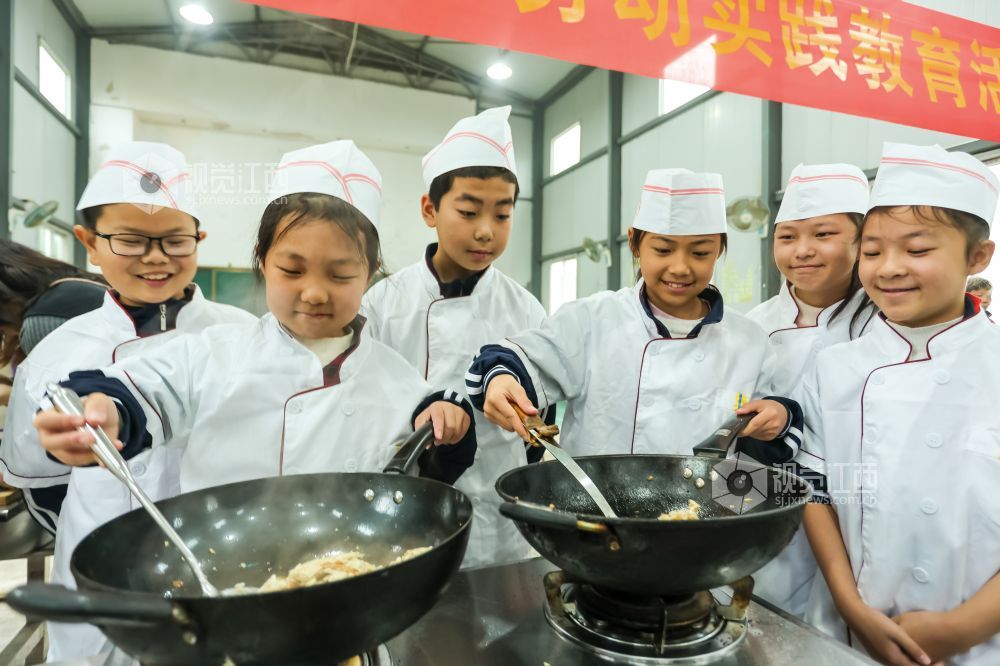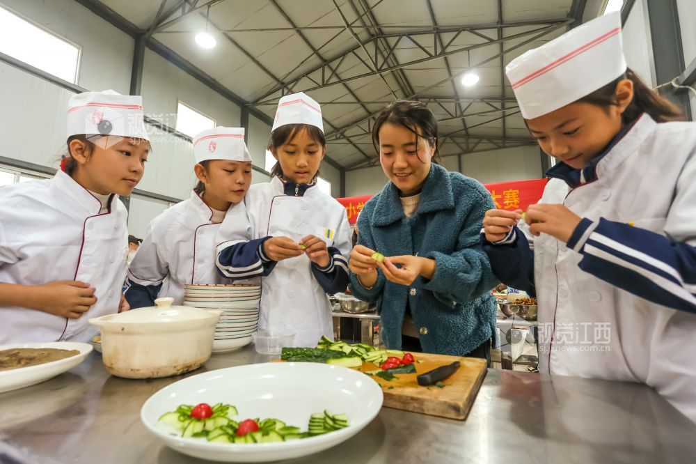 2022年11月18日,江西省瑞昌市第四小学举行劳动实践教育活动,学生在食堂学习切菜、炒菜和摆盘知识。