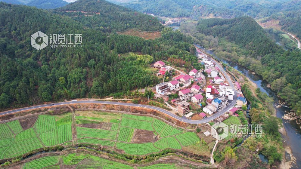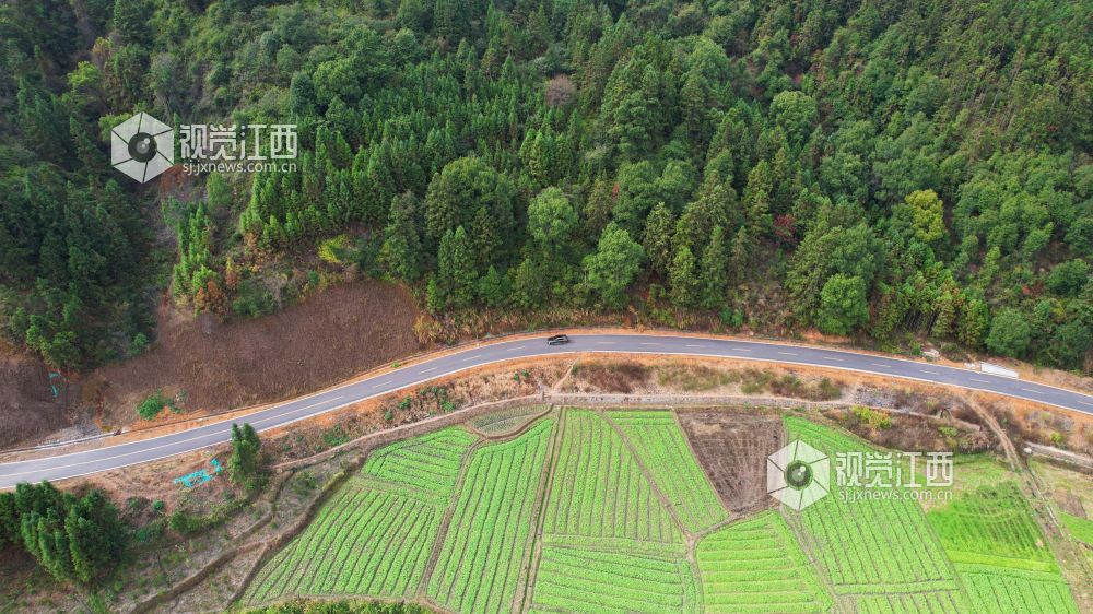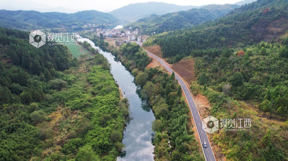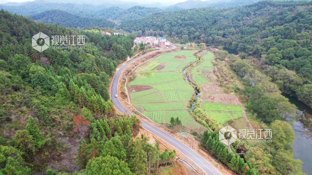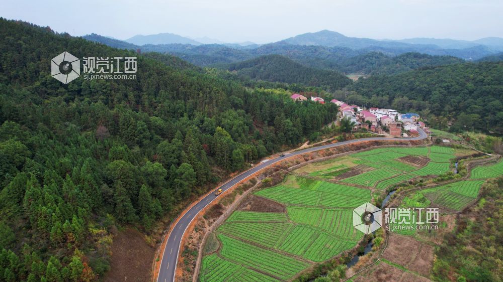 11月21日,在江西省莲花县南岭乡砚溪村,黑色的柏油路穿行在大山脚下,联村通户。