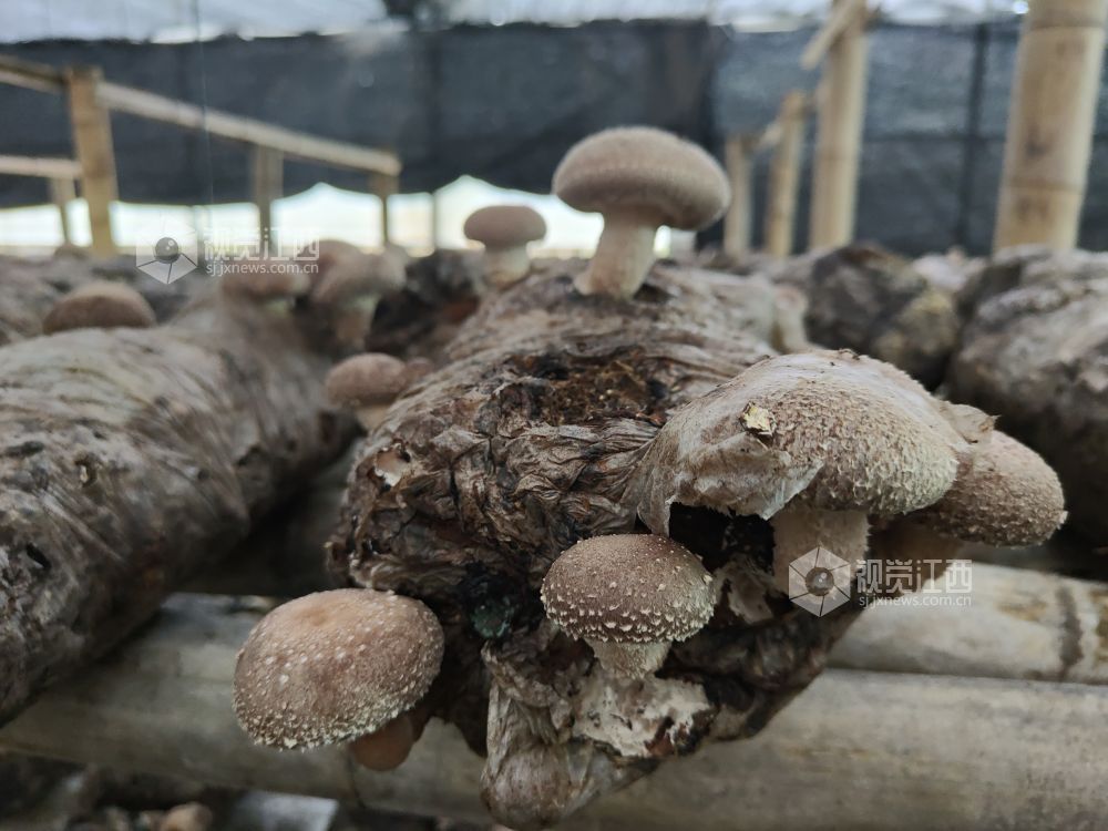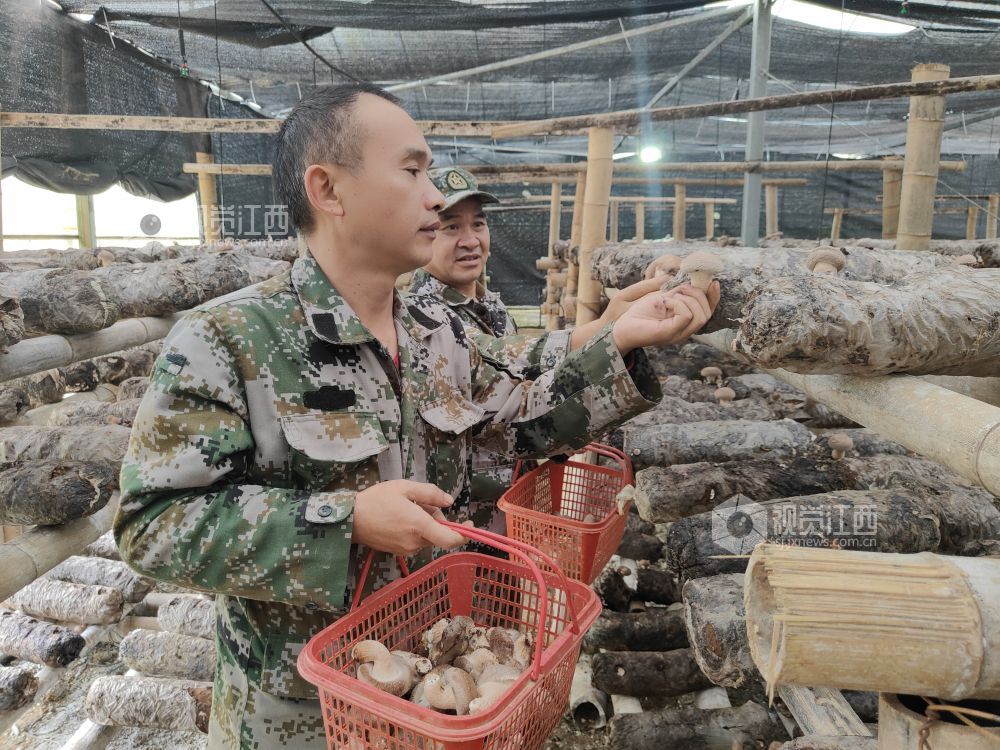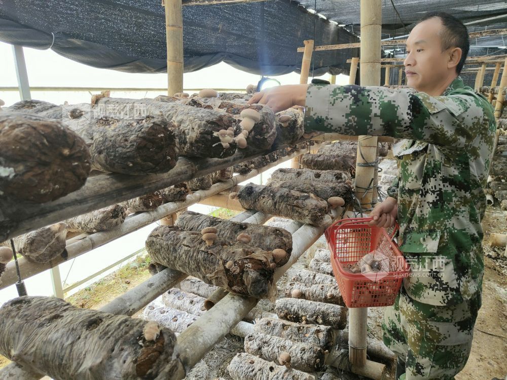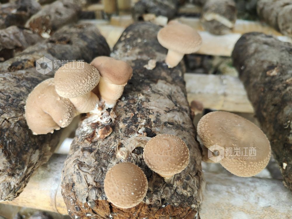 11月26日,在江西省吉水县周岭林场“百场兴百业,百场带百村”项目基地里,林农正在采摘食用菌花菇。