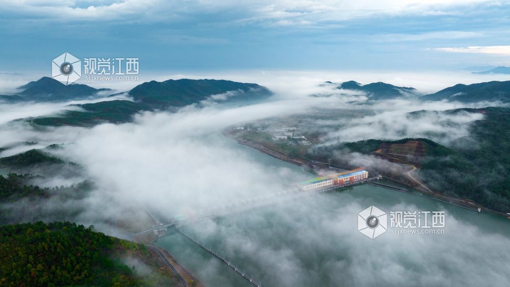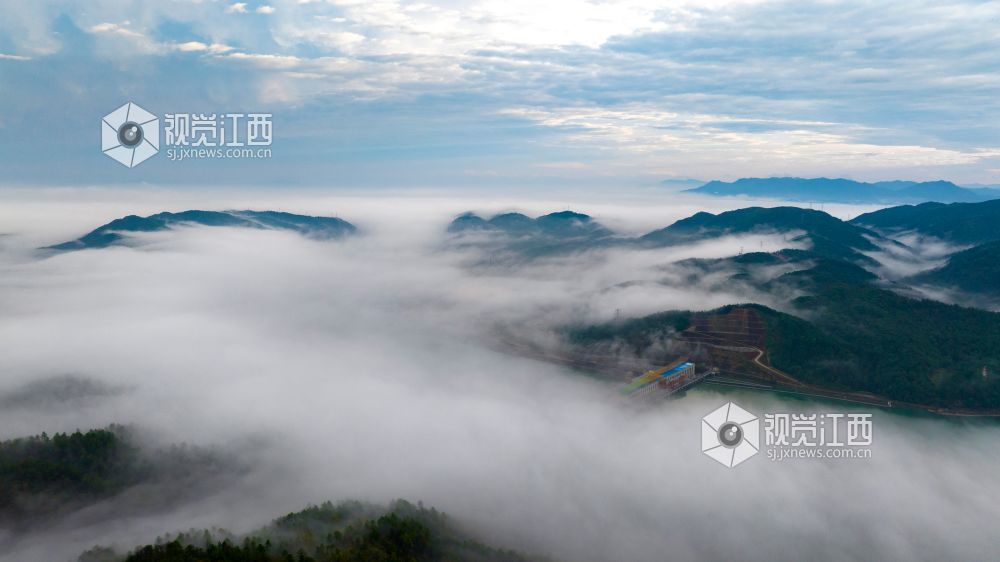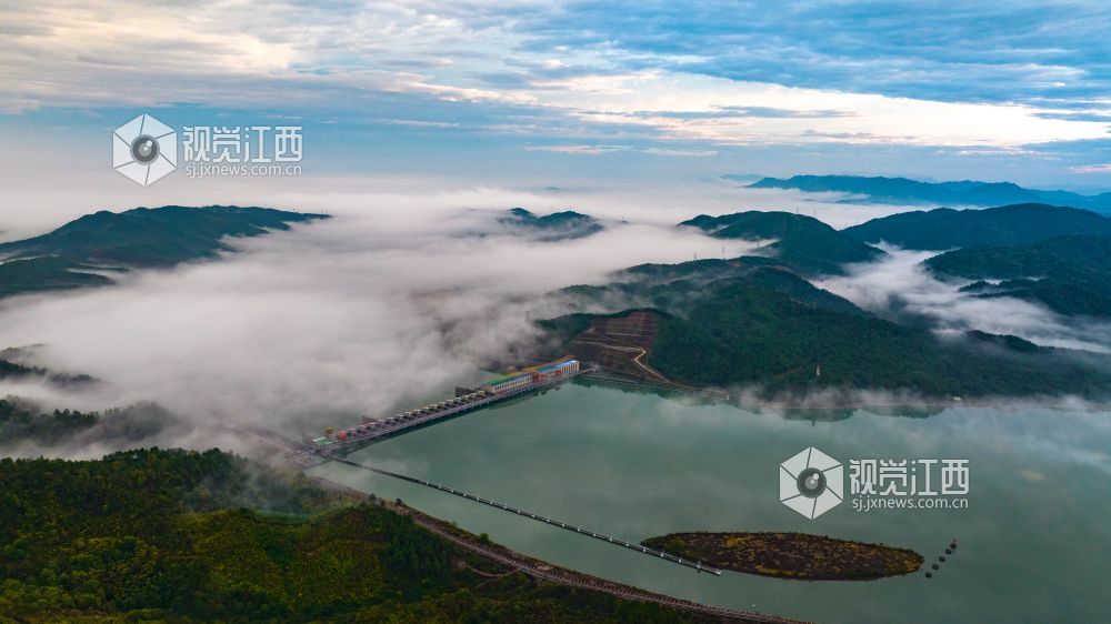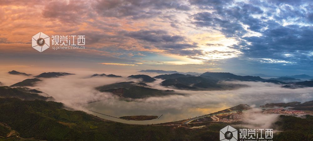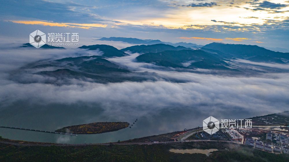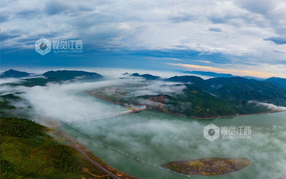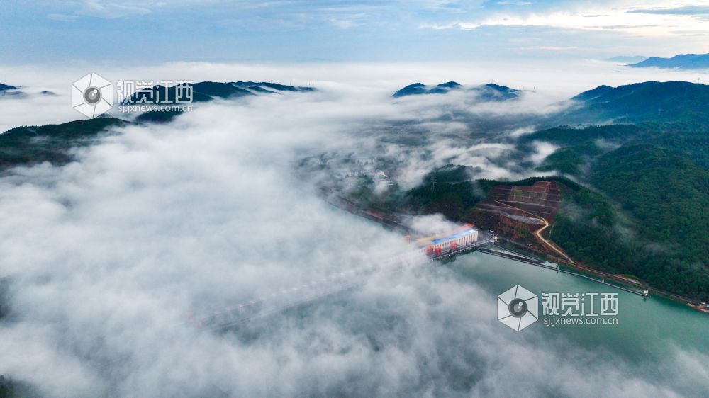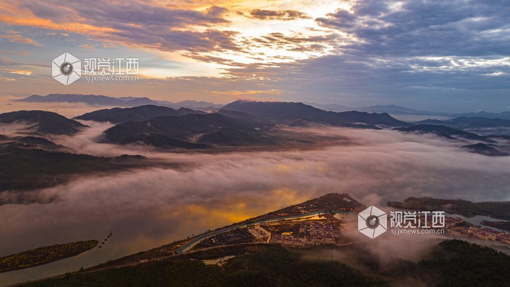 阵雨过后的清晨,正是观看云海的最佳时机。较大的昼夜温差使得江西省峡江县水利枢纽的坝上和上游的蒋沙移民新村形成云海日出的景观。放眼远望,漫漫云海在座座山峰间奔涌,时如飘逸的轻纱,时如滚滚波涛。莽莽群山和赣江之中,云海翻腾,云雾弥漫、波澜壮阔,蔚为壮观。云雾缭绕的村庄与云海、形成一幅画卷,美不胜收。