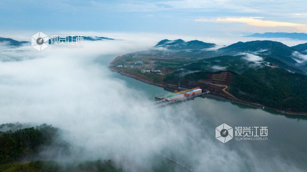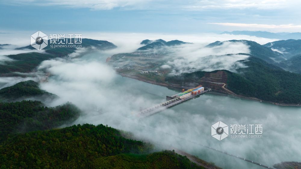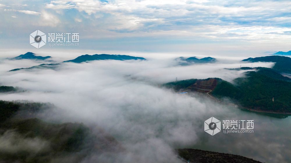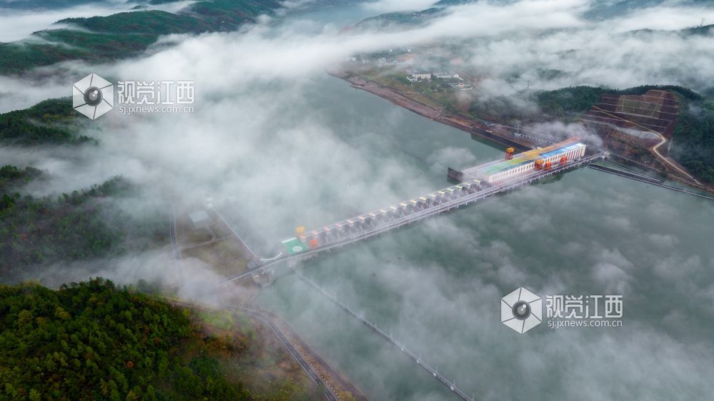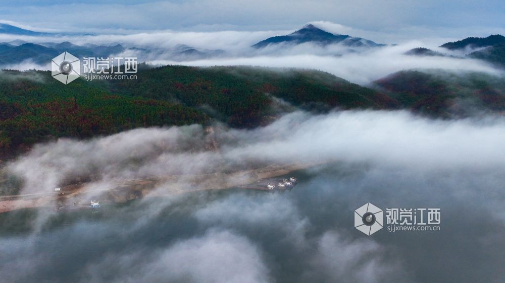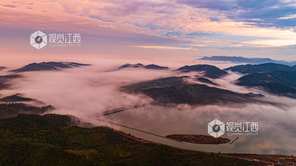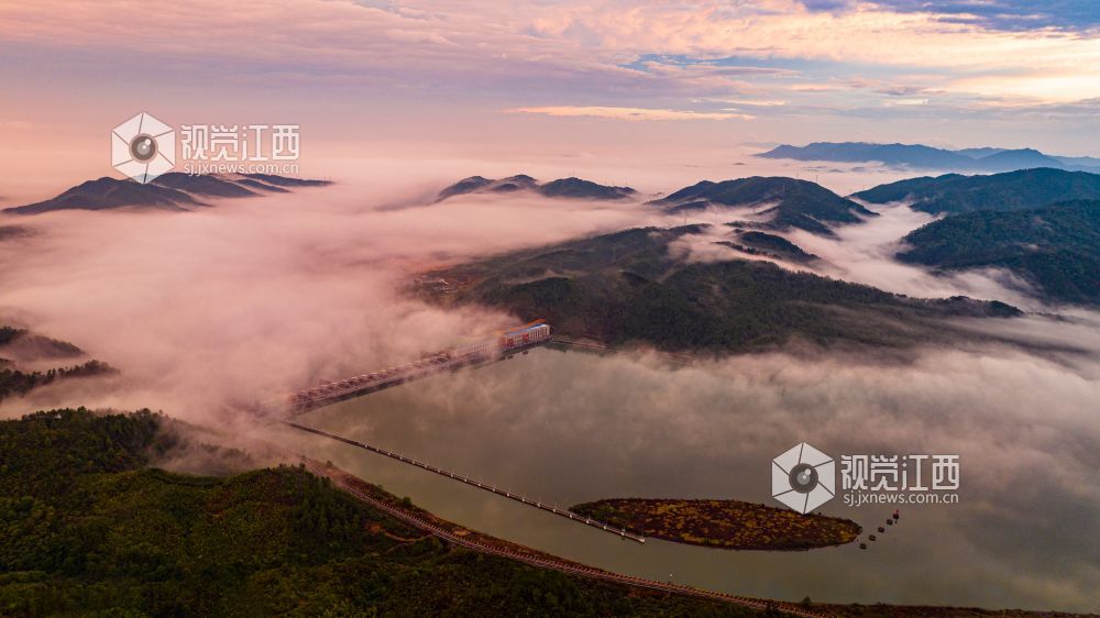 阵雨过后的清晨,正是观看云海的最佳时机。较大的昼夜温差使得江西省峡江县水利枢纽的坝上和上游的蒋沙移民新村形成云海日出的景观。放眼远望,漫漫云海在座座山峰间奔涌,时如飘逸的轻纱,时如滚滚波涛。莽莽群山和赣江之中,云海翻腾,云雾弥漫、波澜壮阔,蔚为壮观。云雾缭绕的村庄与云海、形成一幅画卷,美不胜收。