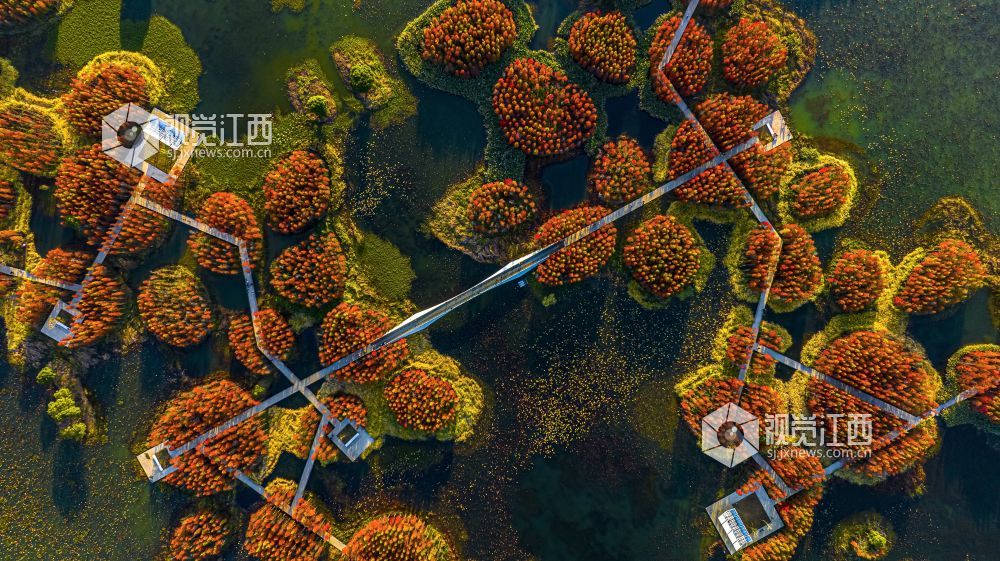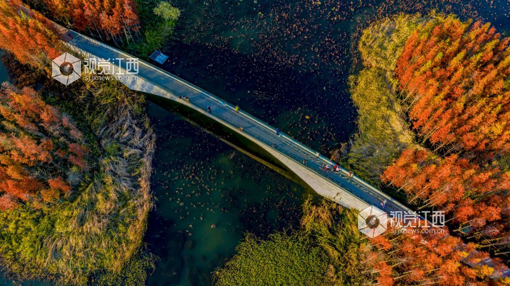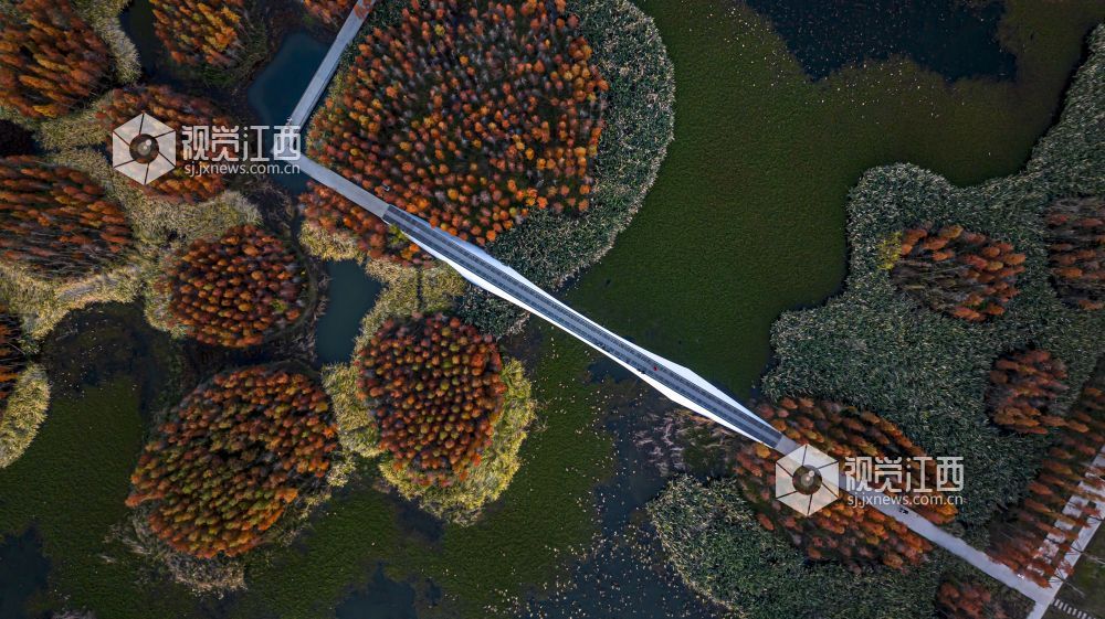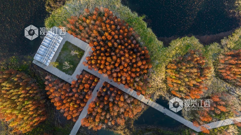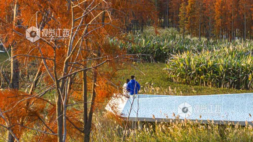 江西南昌鱼尾洲湿地公园的树木已由绿转红,12月14日,初冬时节,黄昏之下,成片色彩斑斓的杉树林与一湾绿水交相辉映,层林尽染、冬景如画,吸引不少游客前来参观游玩。